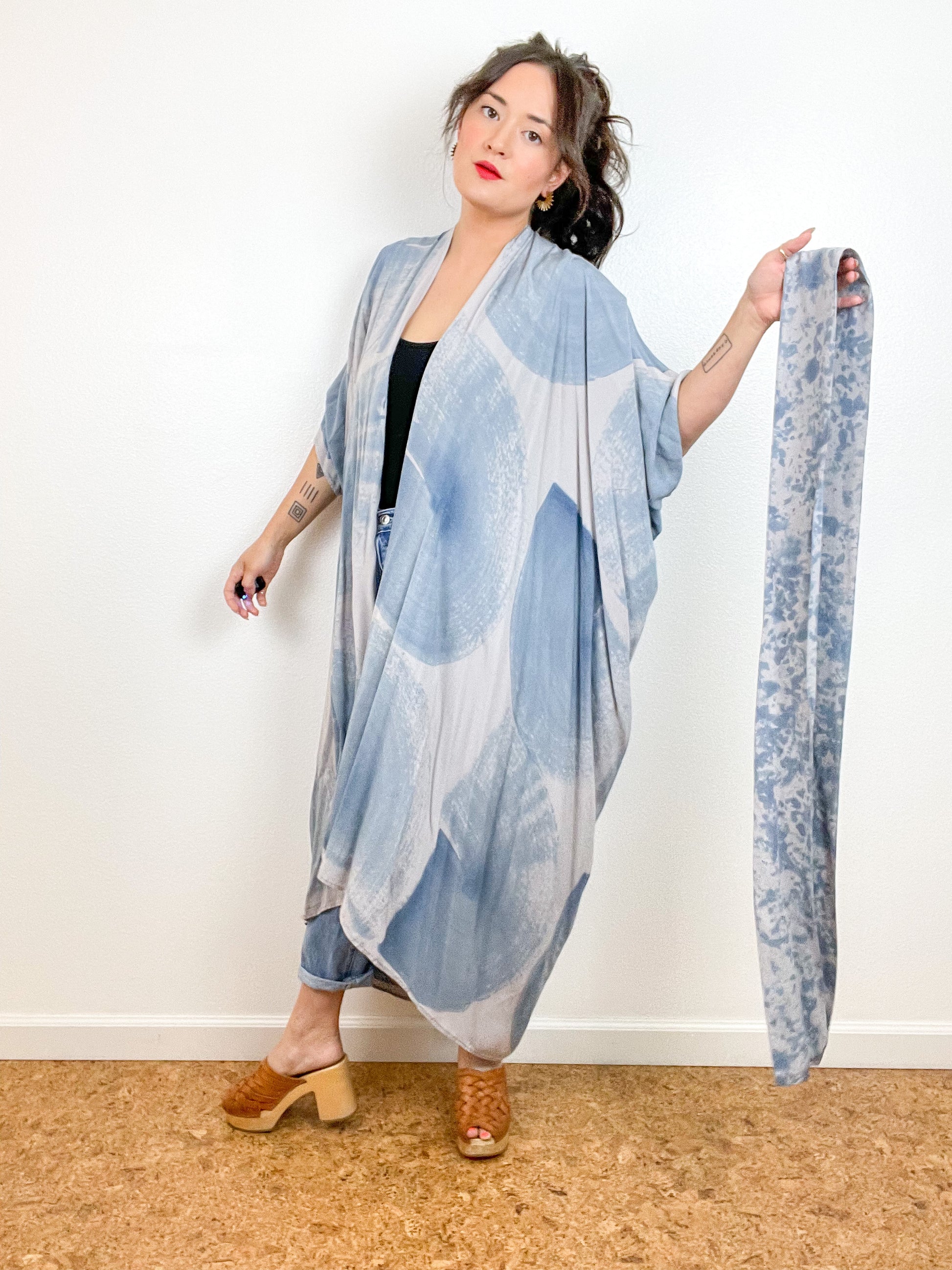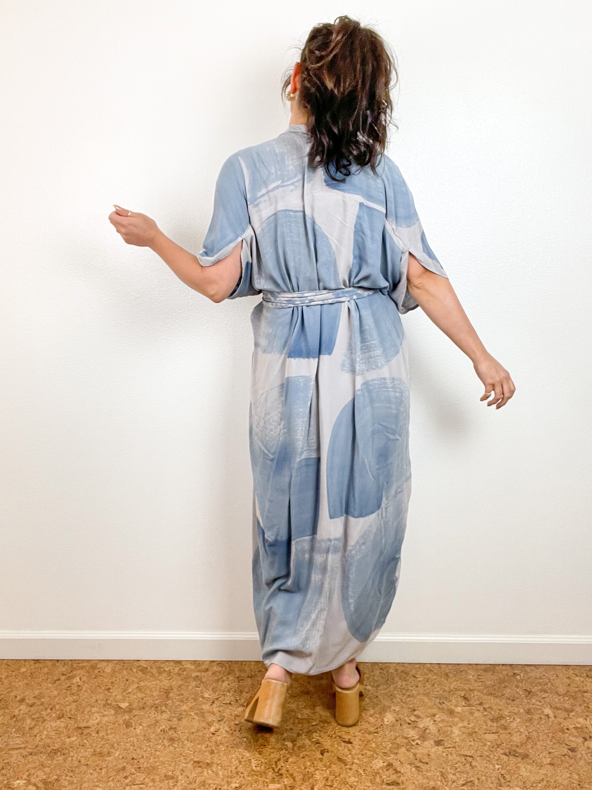 Hand-Dyed High Low Kimono Grey Blue Brushstroke