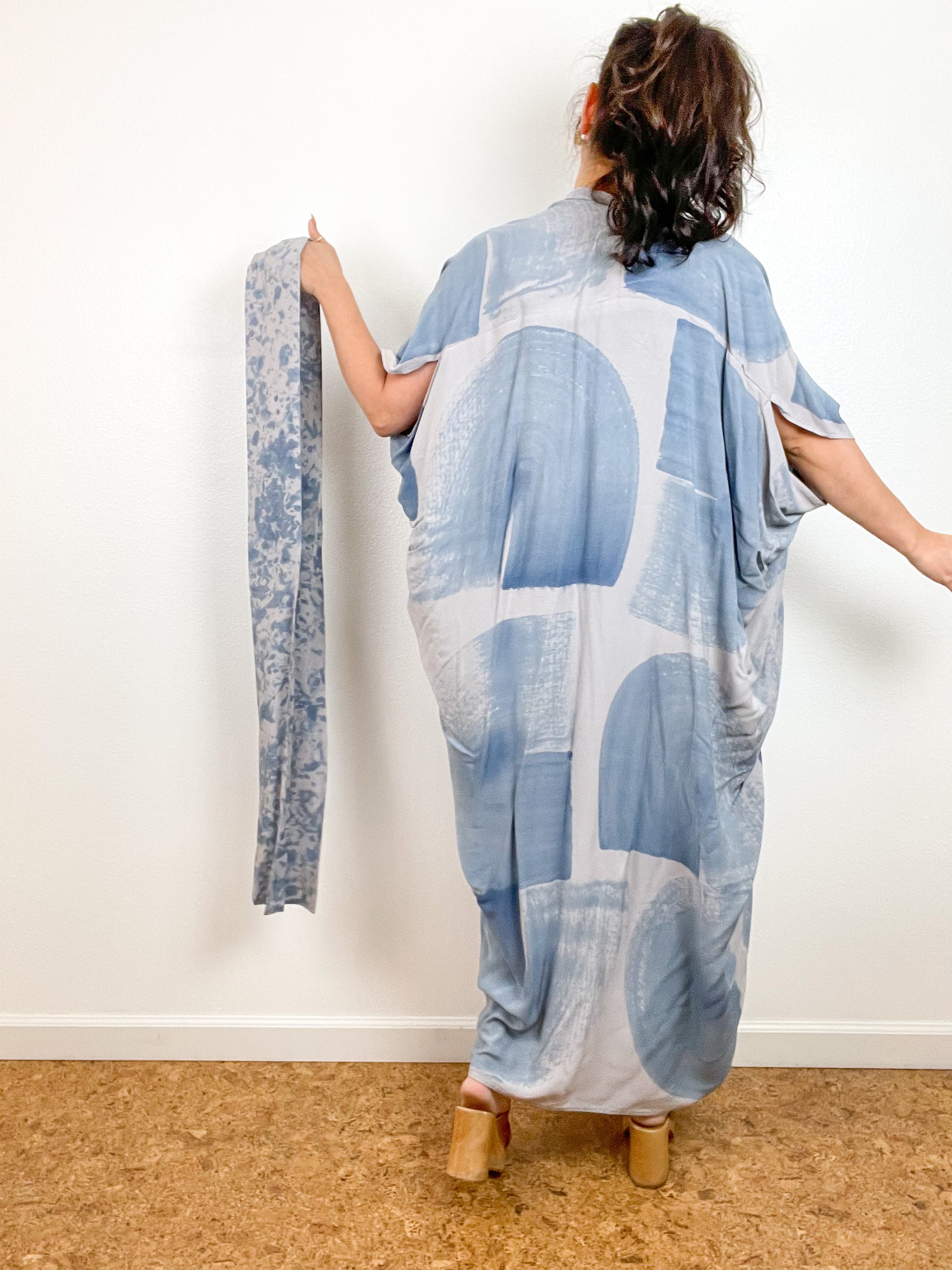 Soft and airy kimono with a flowing silhouette, tulip sleeve detail, curved high low hem and separate waist tie. Versatile shape can be styled as a wrap dress, an open kimono without the tie, or a robe for staying home. The minimalist design created from a full rectangle of fabric drapes beautifully over the shoulders and produces no material waste by utilizing one whole piece of fabric without scraps from corners and irregular cuts. Lightweight woven grey fabric is hand-dyed with baby blue algae thickened dye using a gestural brushstroke technique.