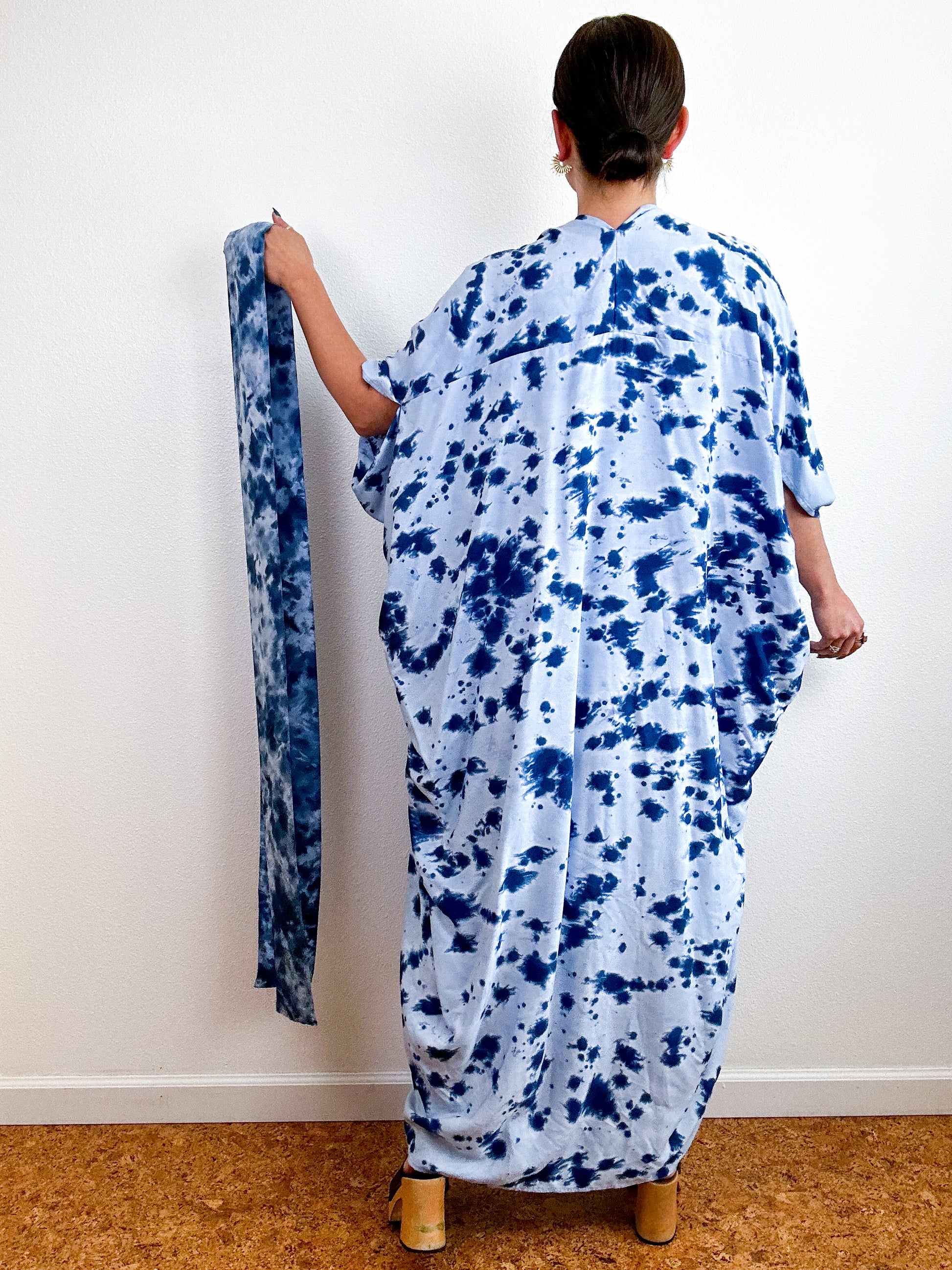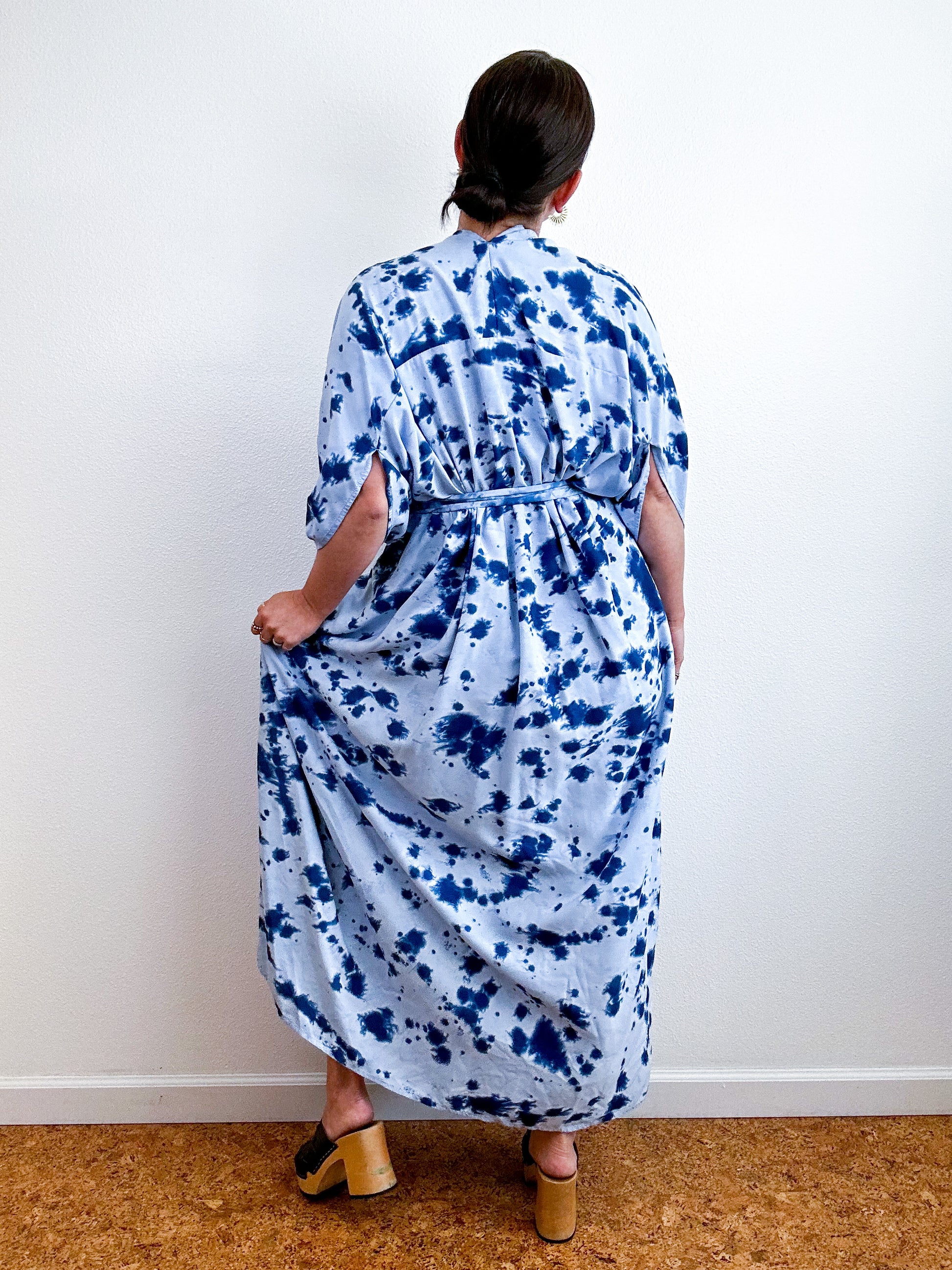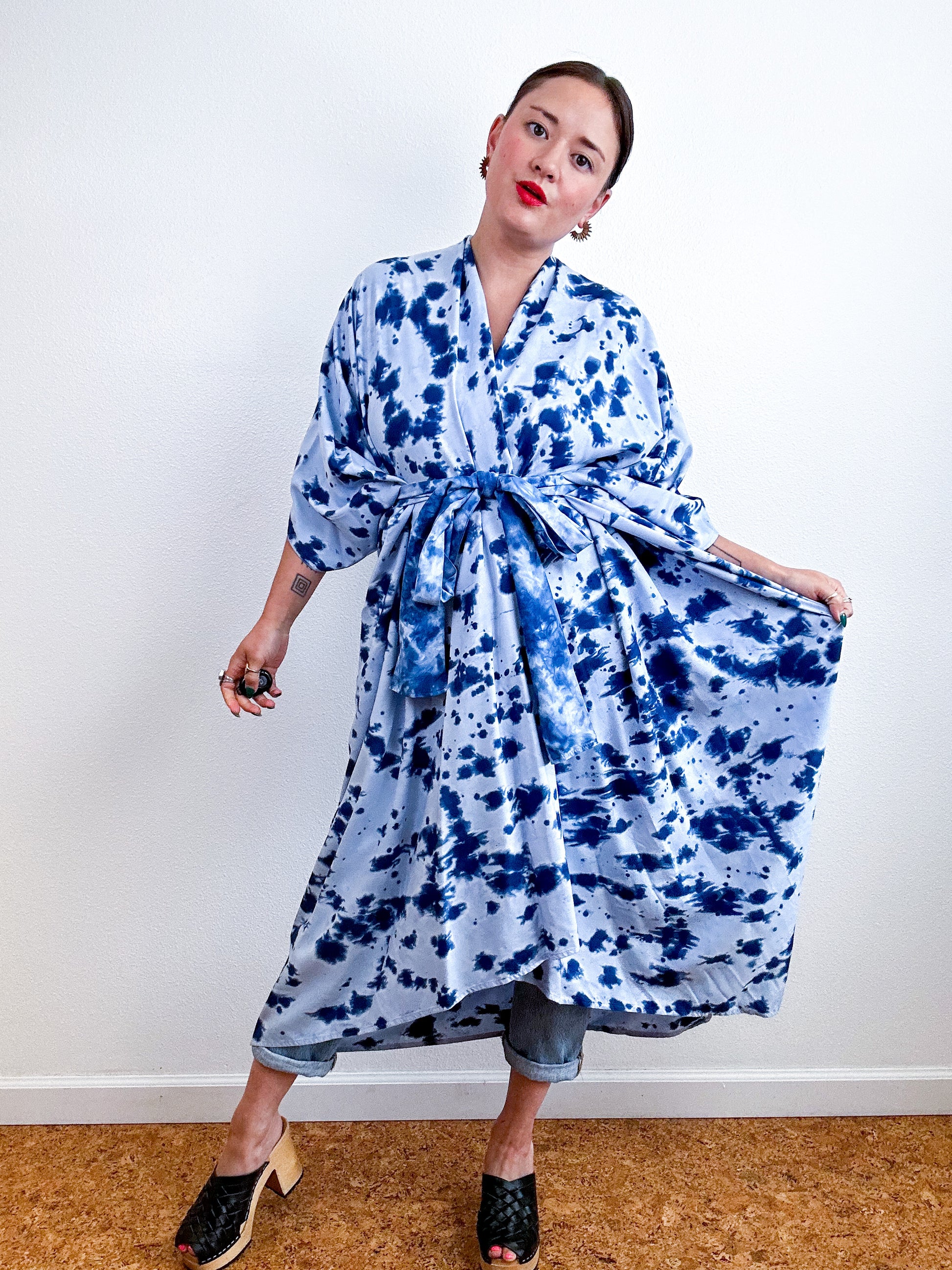 Soft and airy kimono with a flowing silhouette, tulip sleeve detail, curved high low hem and separate waist tie. Versatile shape can be styled as a wrap dress, an open kimono without the tie, or a robe for staying home. The minimalist design created from a full rectangle of fabric drapes beautifully over the shoulders and produces no material waste by utilizing one whole piece of fabric without scraps from corners and irregular cuts. Lightweight woven grey fabric dyed with black gestural splatter technique.