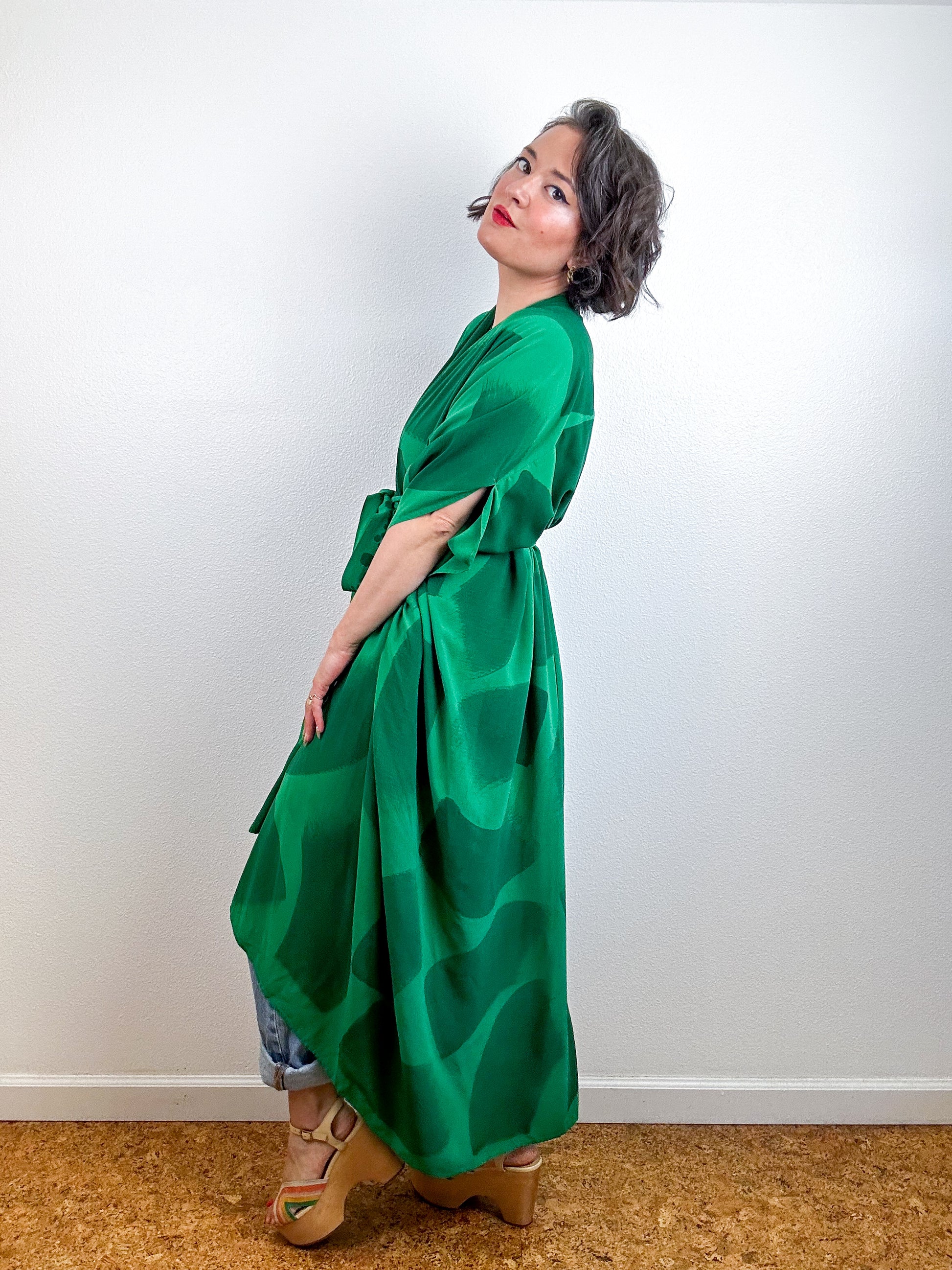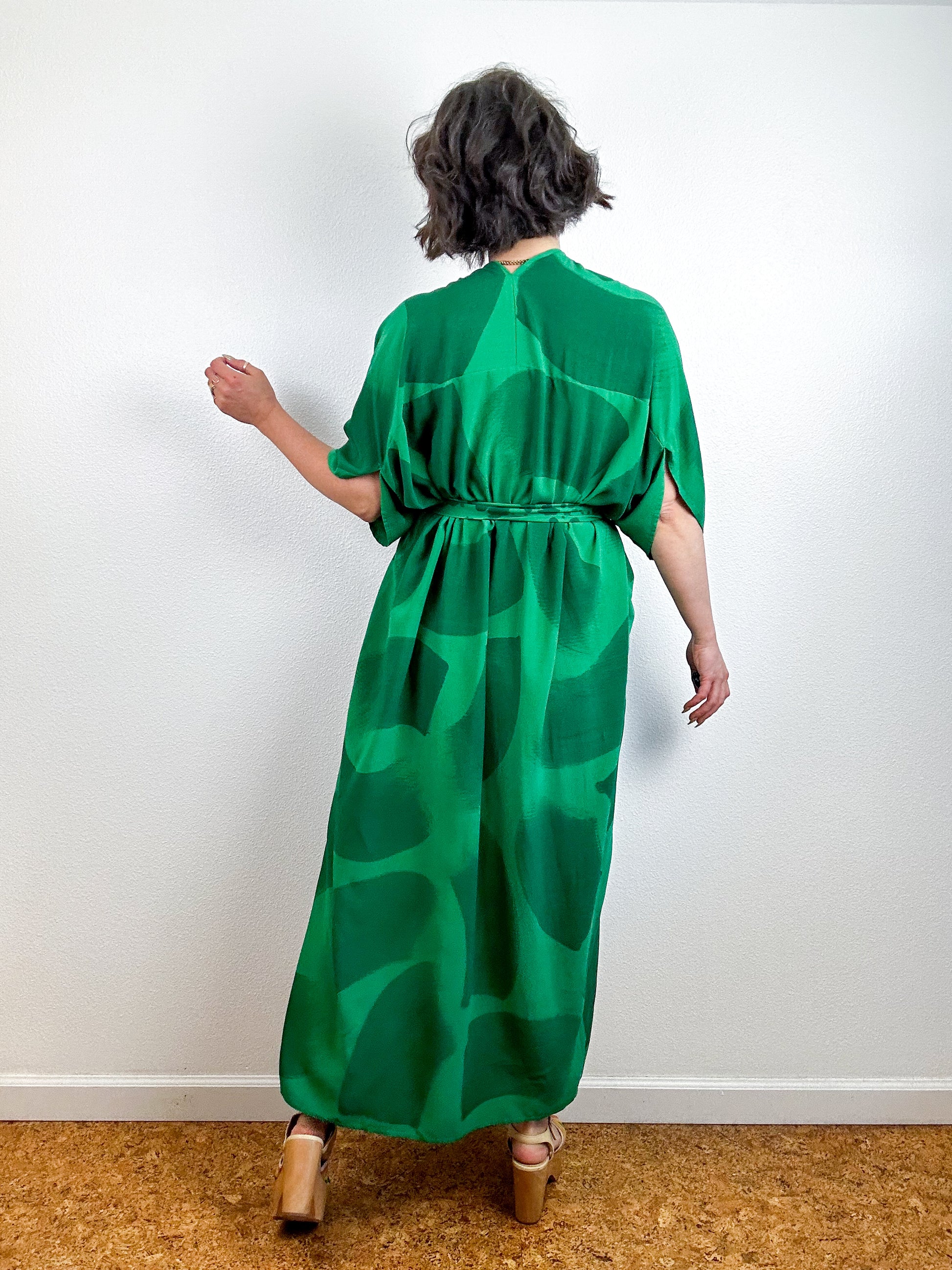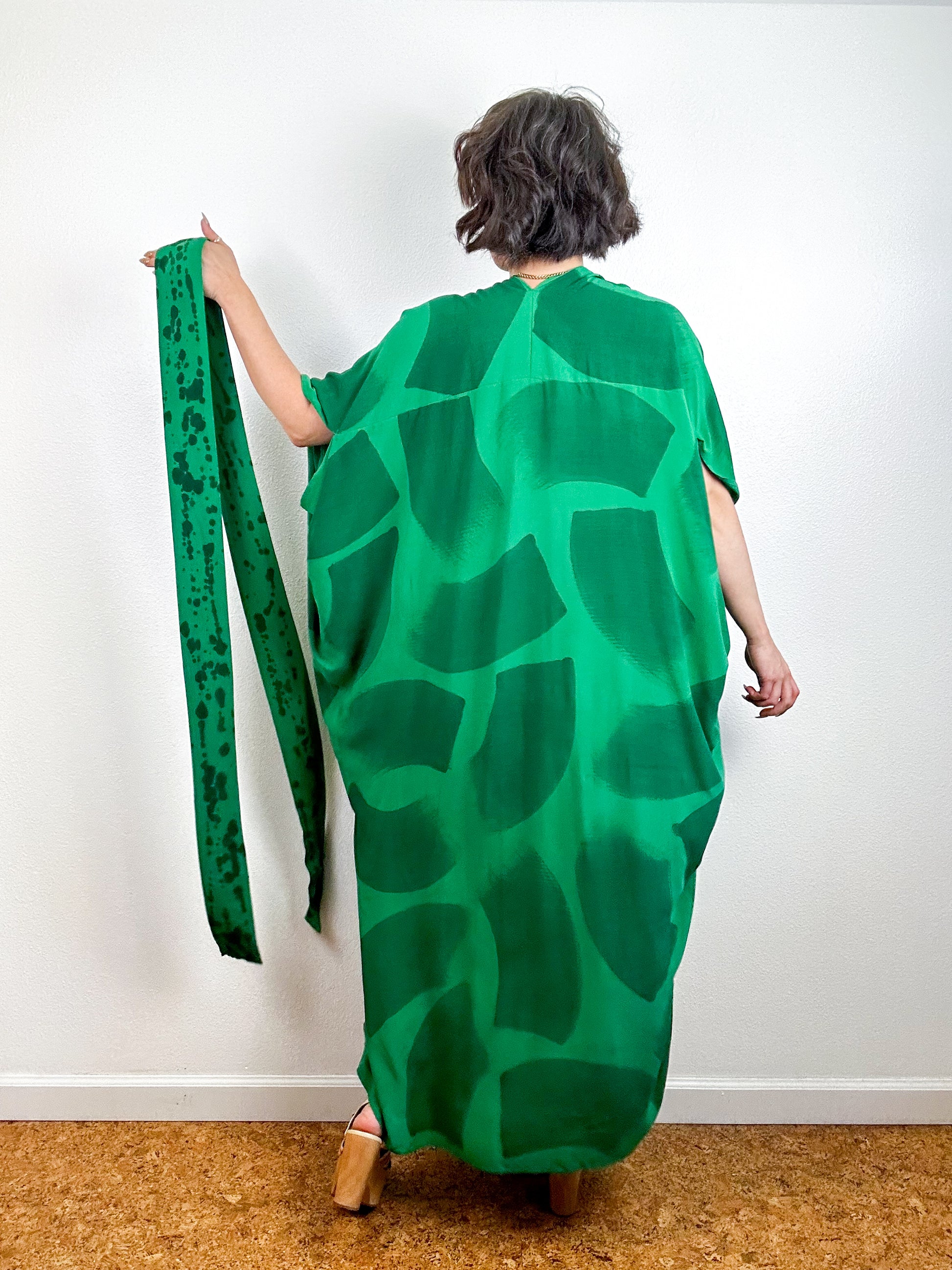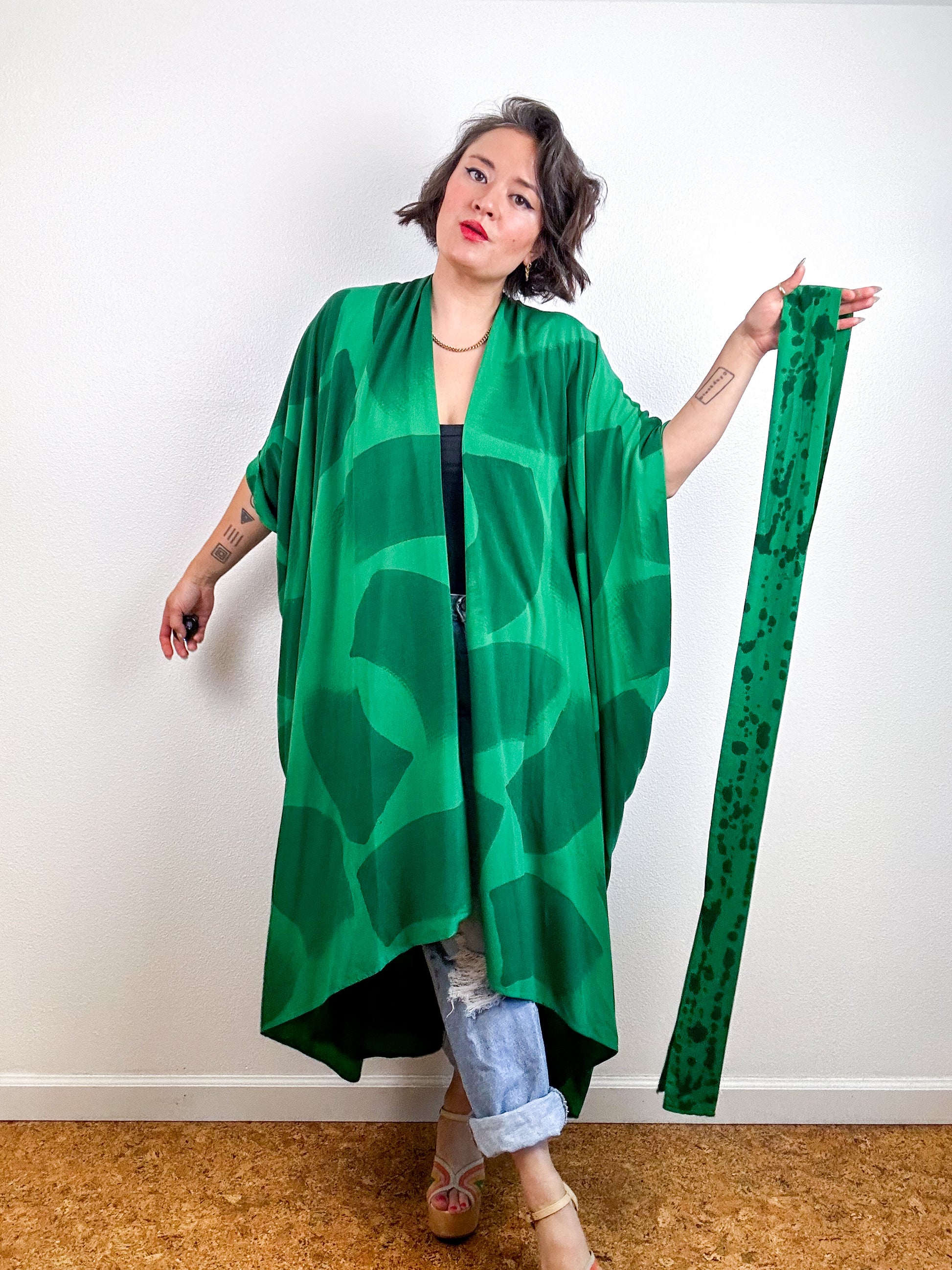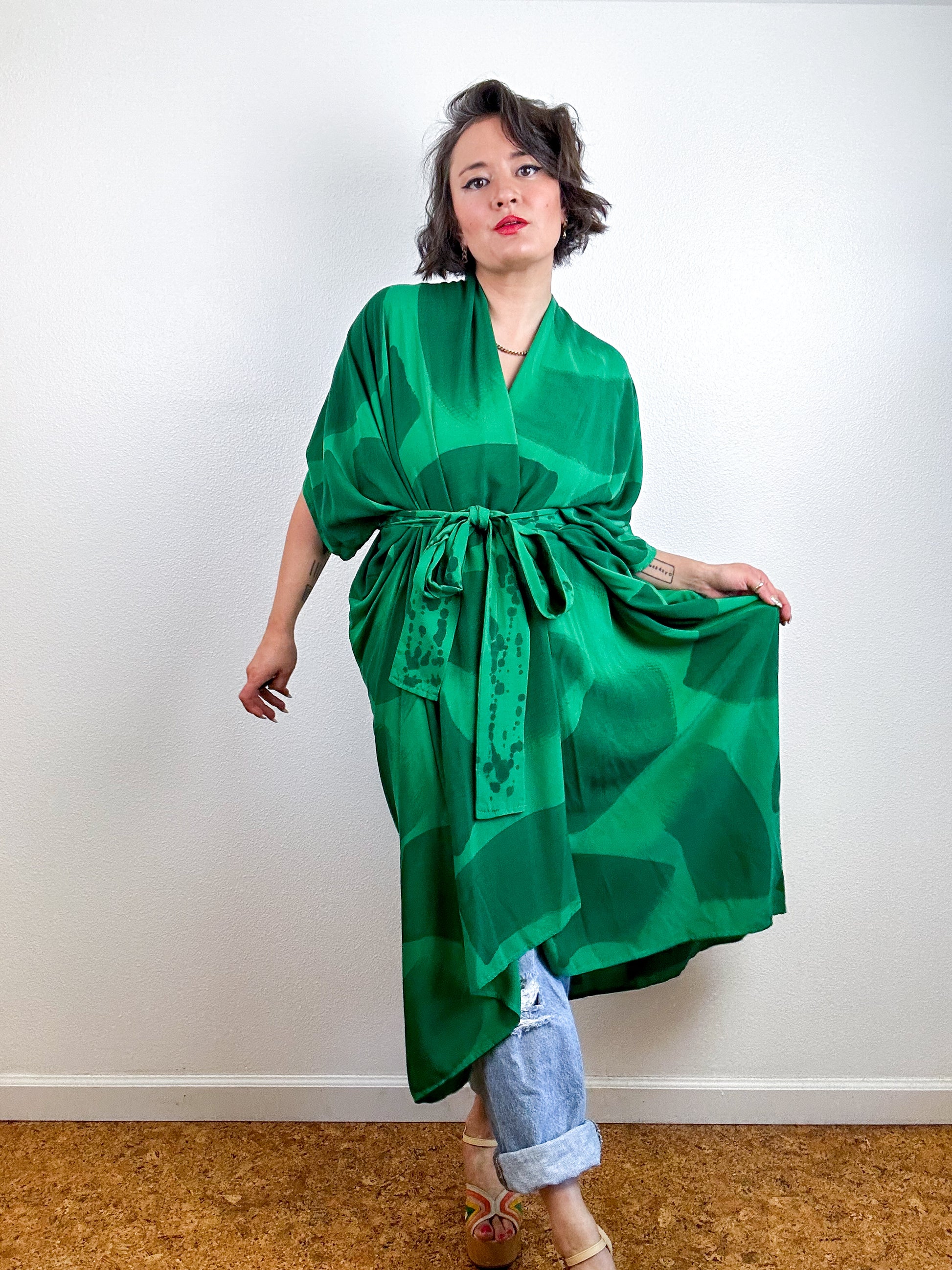 Soft and airy kimono with a flowing silhouette, tulip sleeve detail, curved high low hem and separate waist tie. Versatile shape can be styled as a wrap dress, an open kimono without the tie, or a robe for staying home. The minimalist design created from a full rectangle of fabric drapes beautifully over the shoulders and produces no material waste by utilizing one whole piece of fabric without scraps from corners and irregular cuts. Lightweight woven kelly green fabric is hand-dyed with dark green algae thickened dye using a gestural brushstroke technique.
