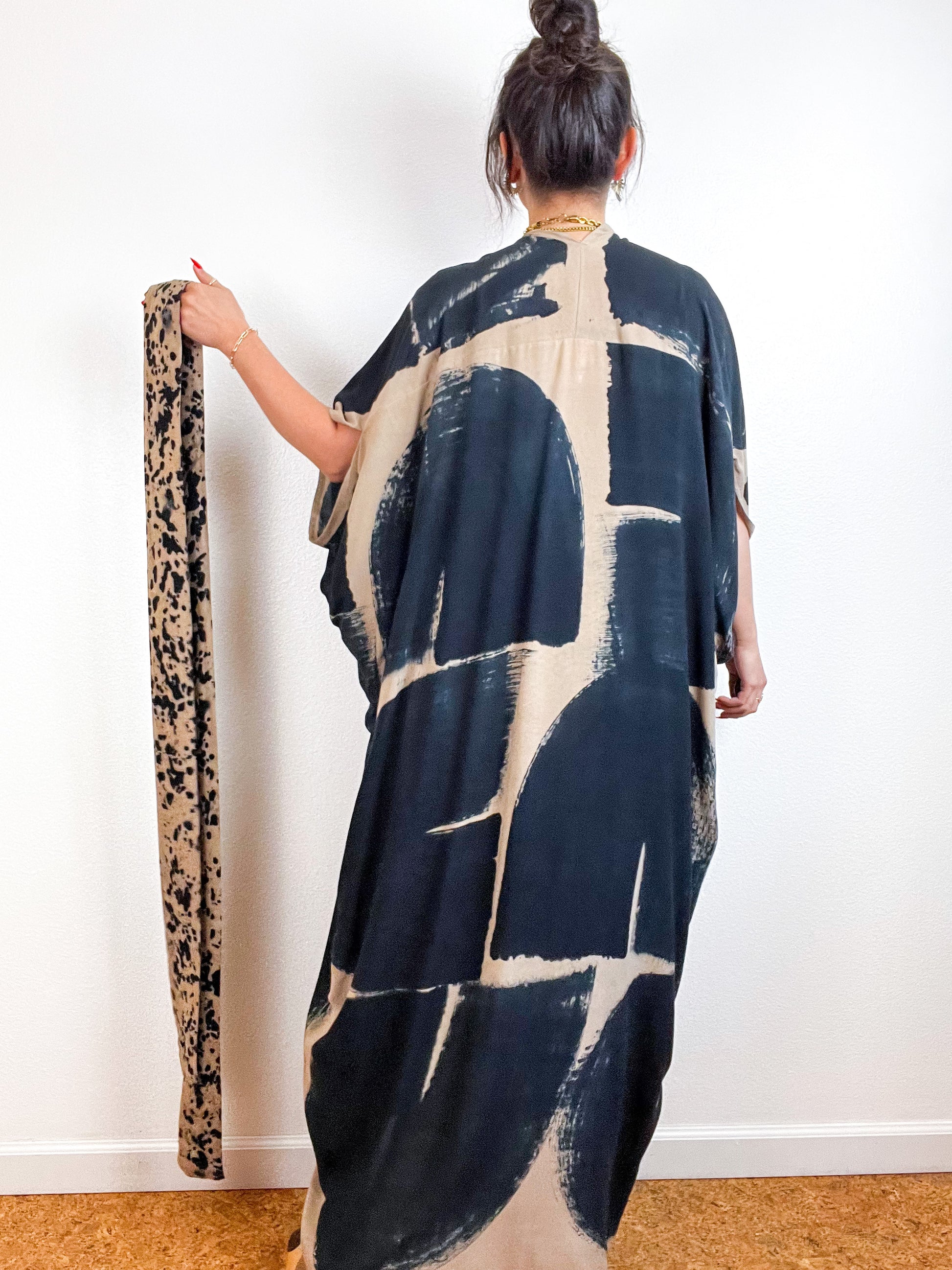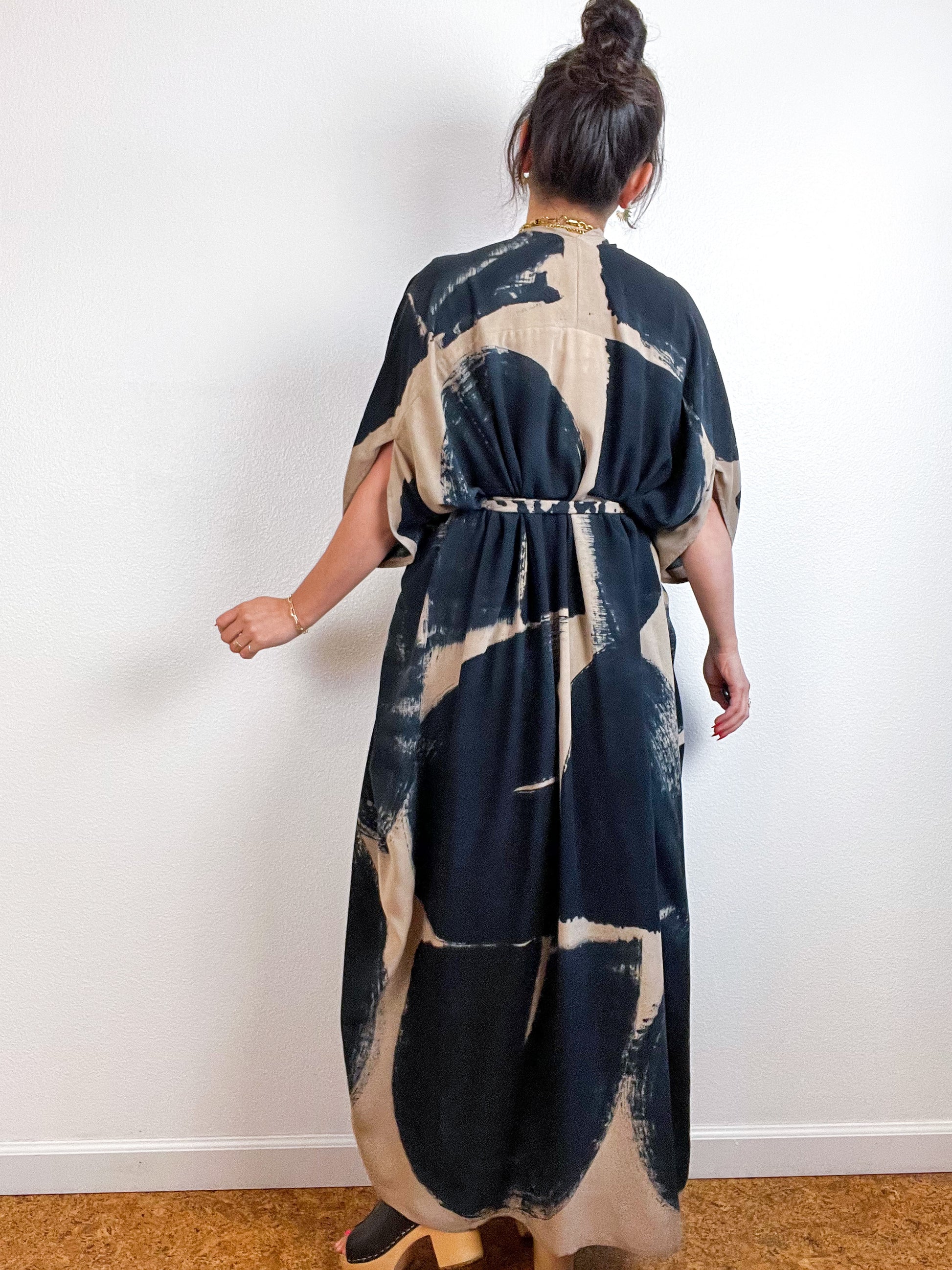 Hand-Dyed High Low Kimono Khaki Black Brushstroke