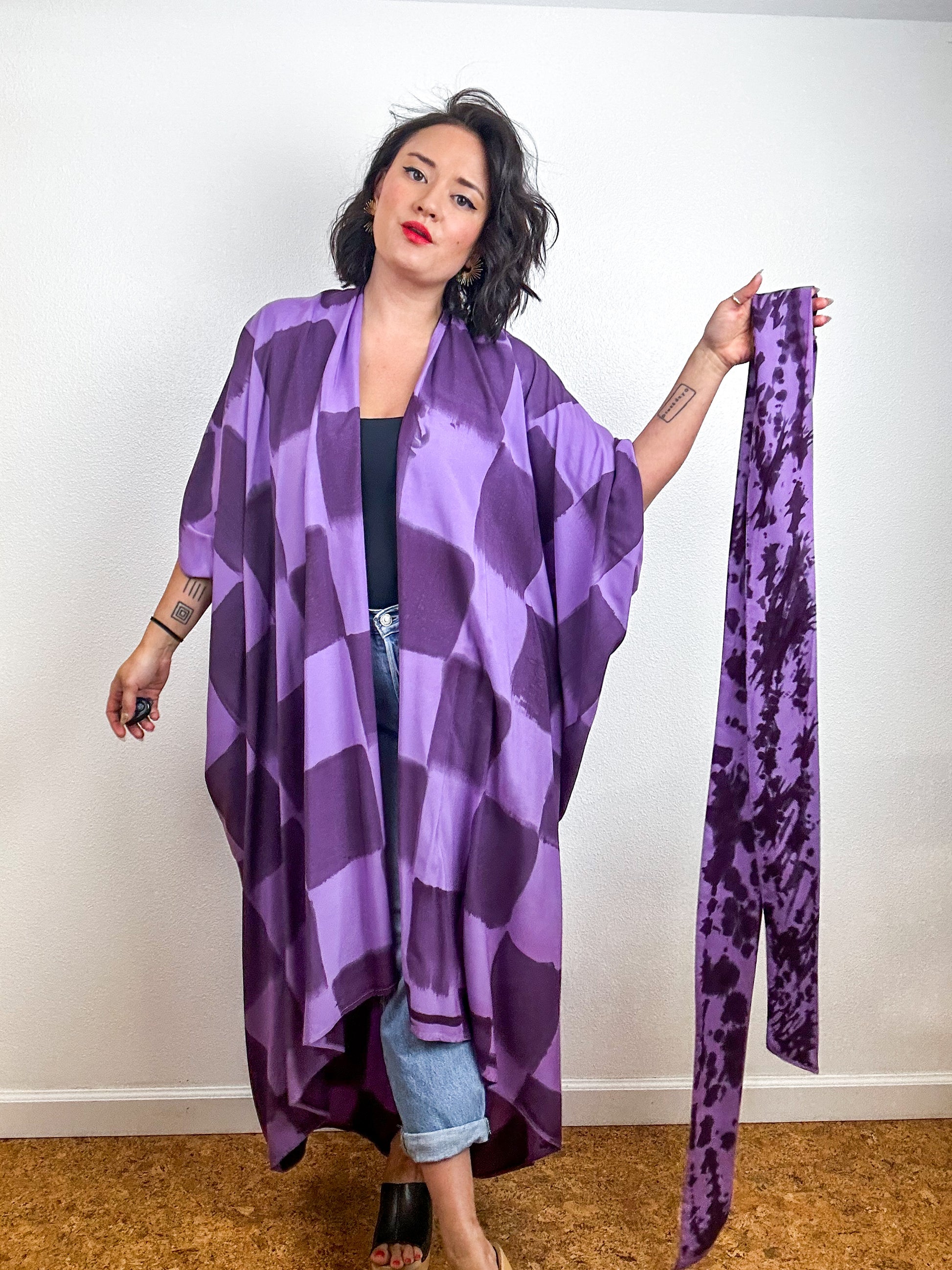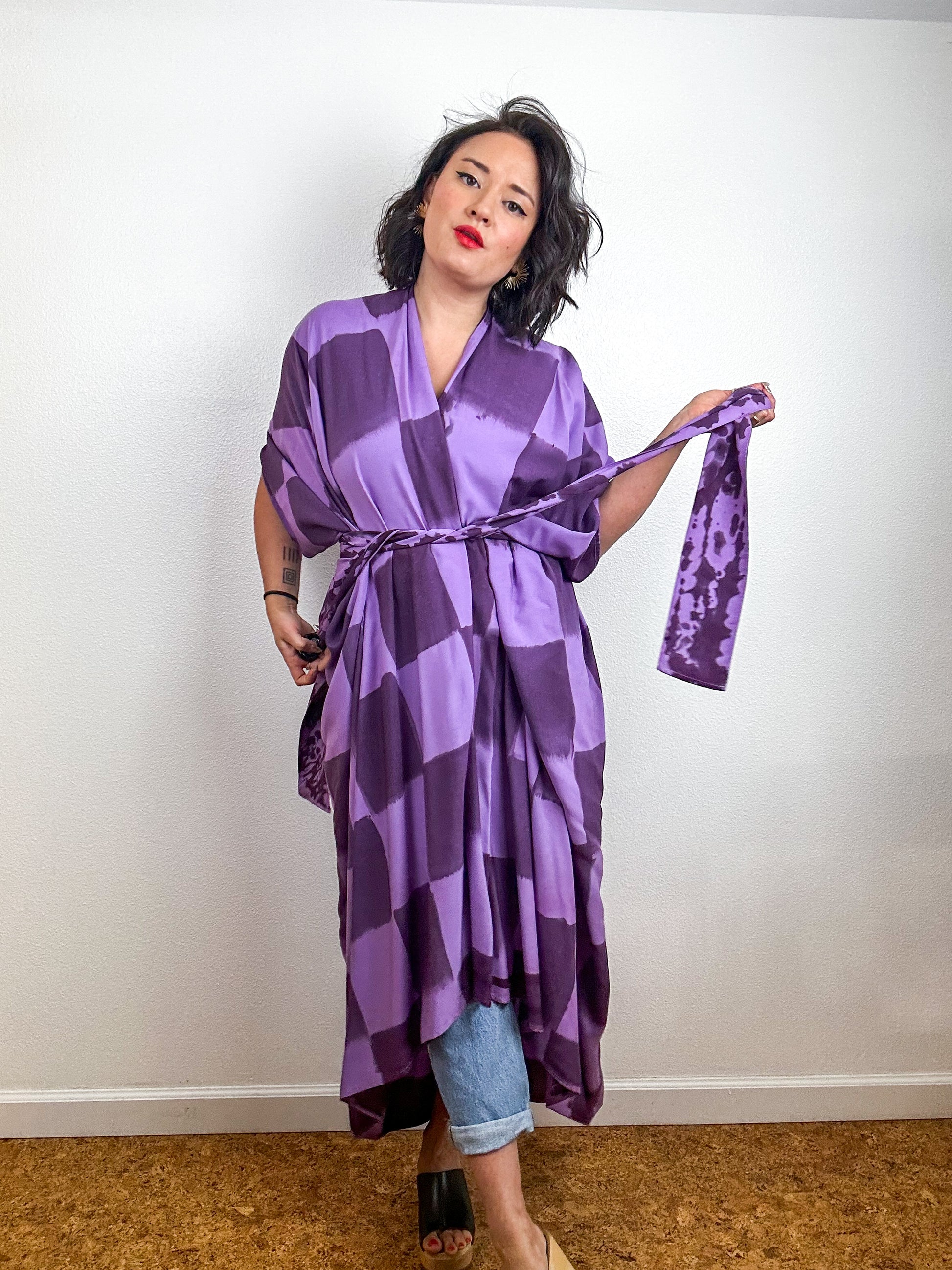 Hand-Dyed High Low Kimono Lavender Plum Check