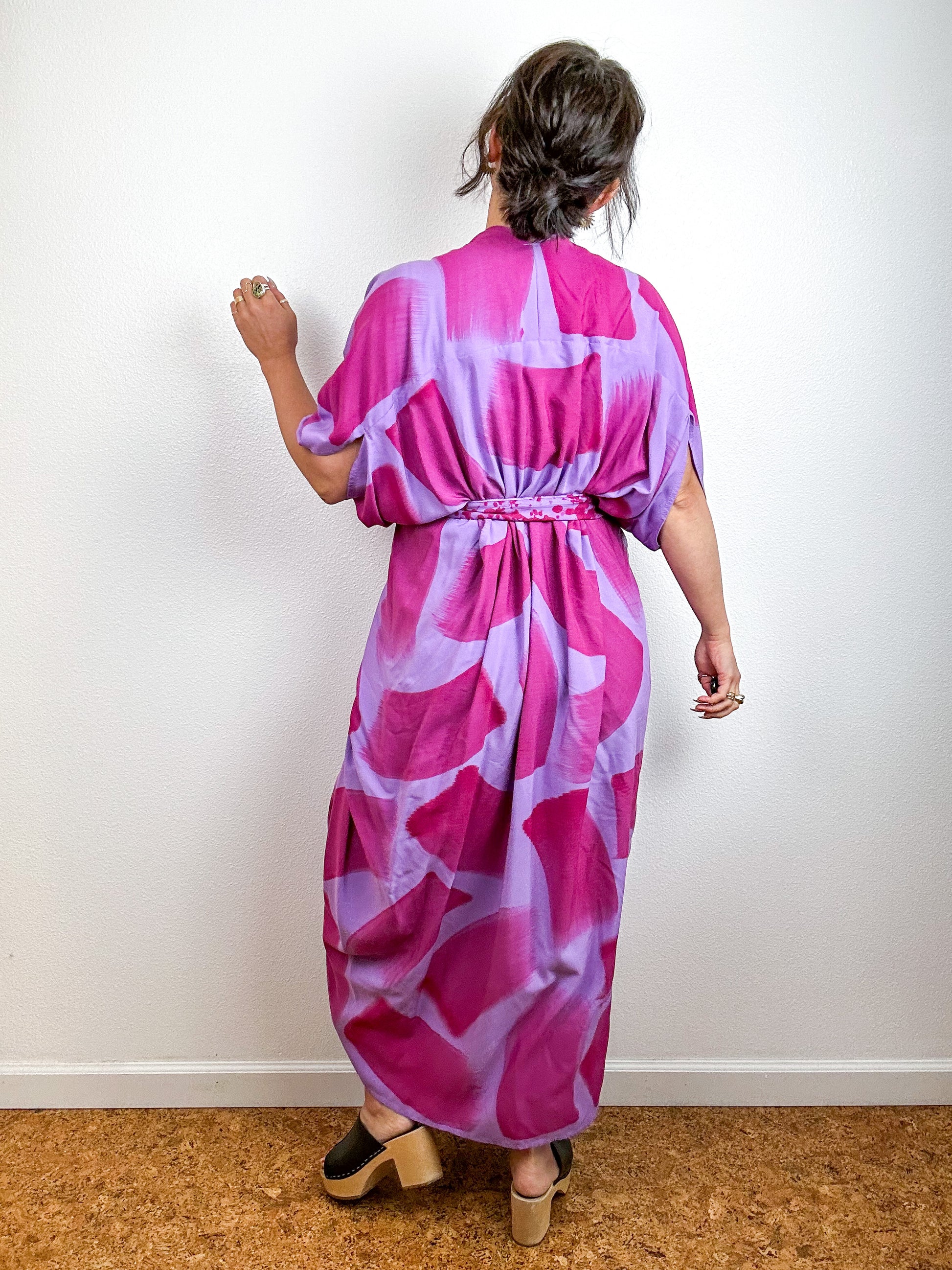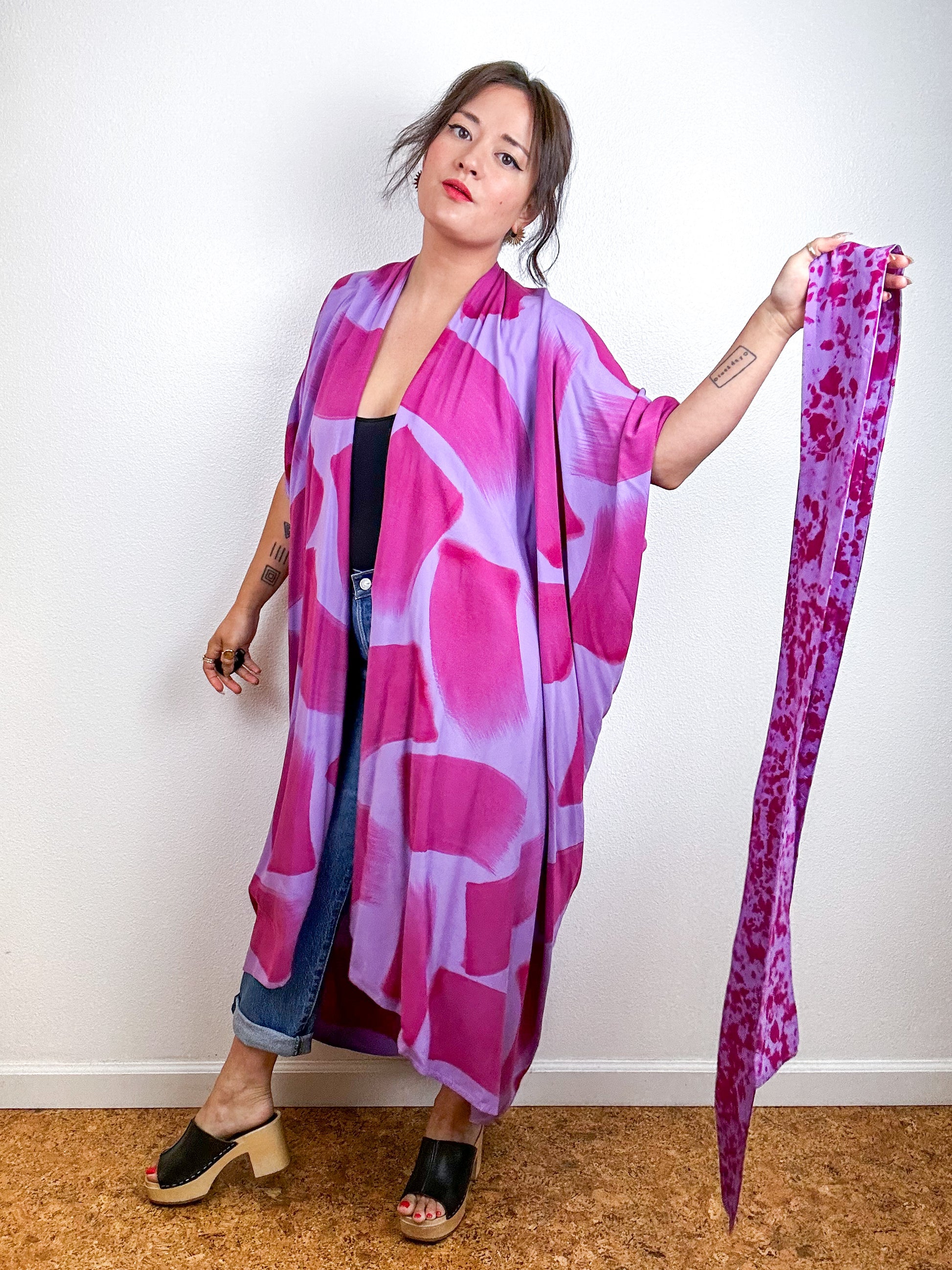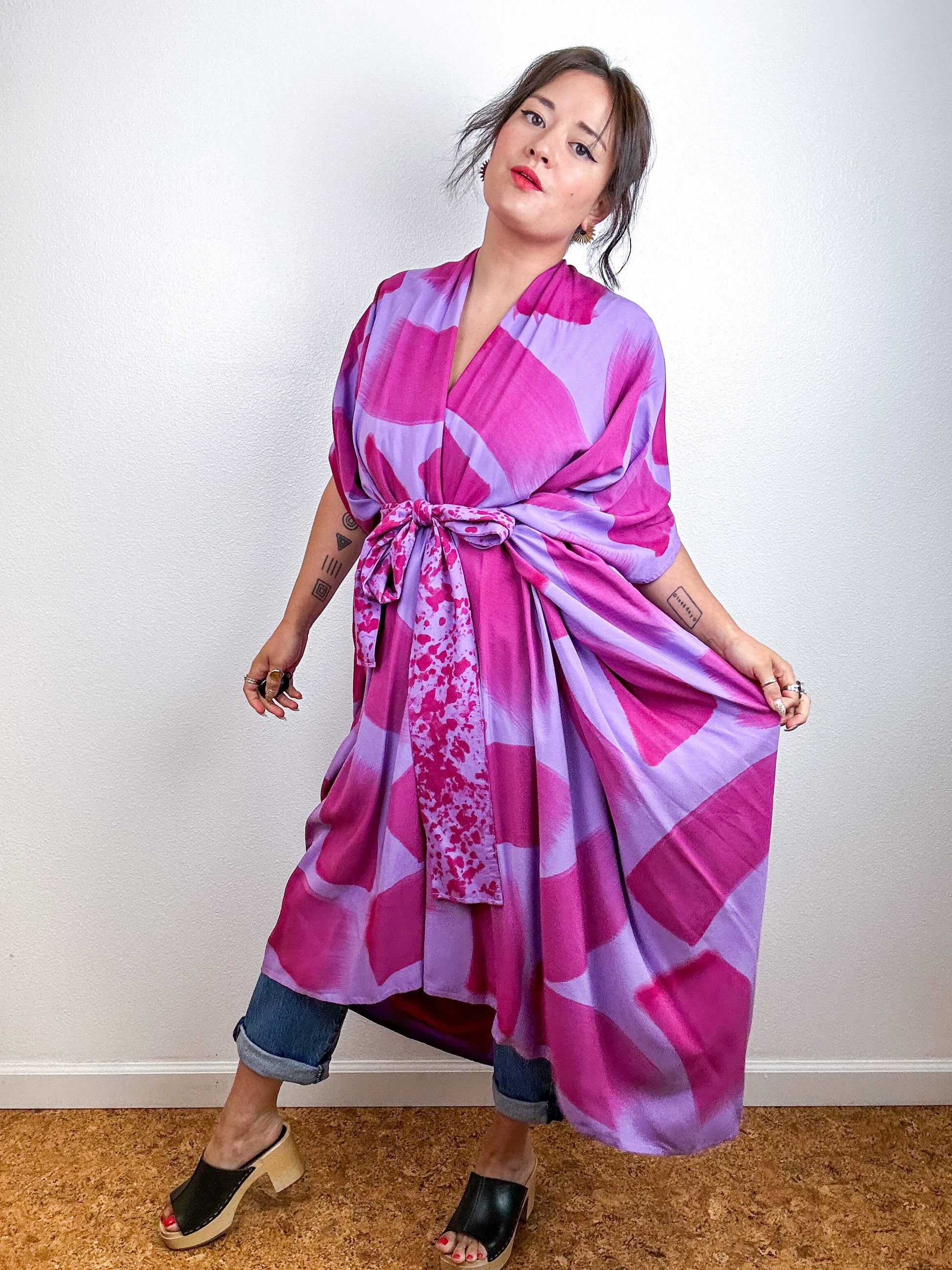 Soft and airy kimono with a flowing silhouette, tulip sleeve detail, curved high low hem and separate waist tie. Versatile shape can be styled as a wrap dress, an open kimono without the tie, or a robe for staying home. The minimalist design created from a full rectangle of fabric drapes beautifully over the shoulders and produces no material waste by utilizing one whole piece of fabric without scraps from corners and irregular cuts. Lightweight woven lilac fabric is hand-dyed with amethyst algae thickened dye using a gestural brushstroke technique.