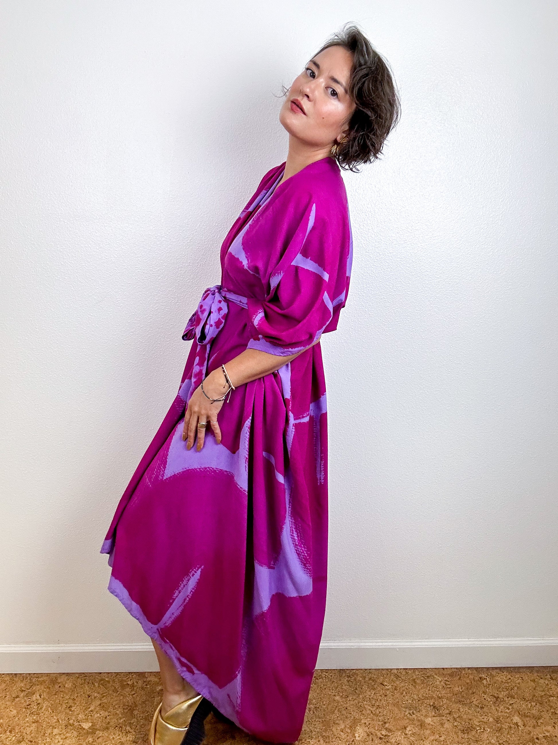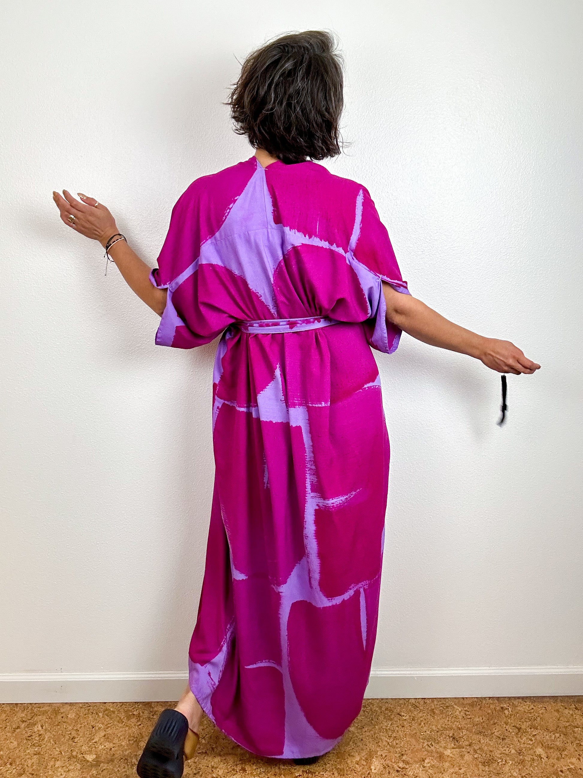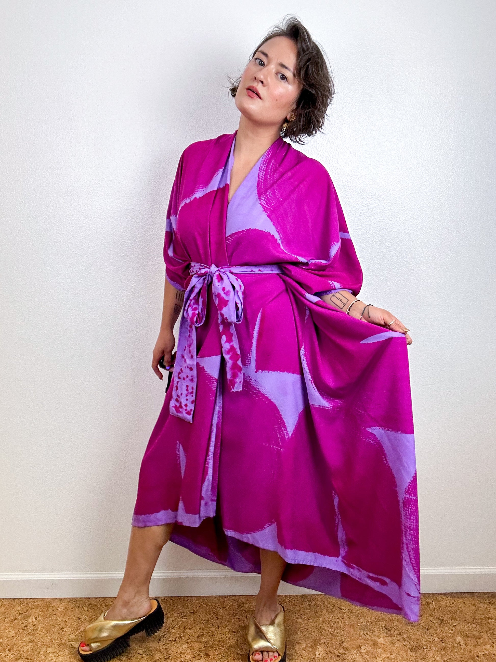 Soft and airy kimono with a flowing silhouette, tulip sleeve detail, curved high low hem and separate waist tie. Versatile shape can be styled as a wrap dress, an open kimono without the tie, or a robe for staying home. The minimalist design created from a full rectangle of fabric drapes beautifully over the shoulders and produces no material waste by utilizing one whole piece of fabric without scraps from corners and irregular cuts. Lightweight woven lilac fabric is hand-dyed with fuchsia algae thickened dye using a gestural brushstroke technique.