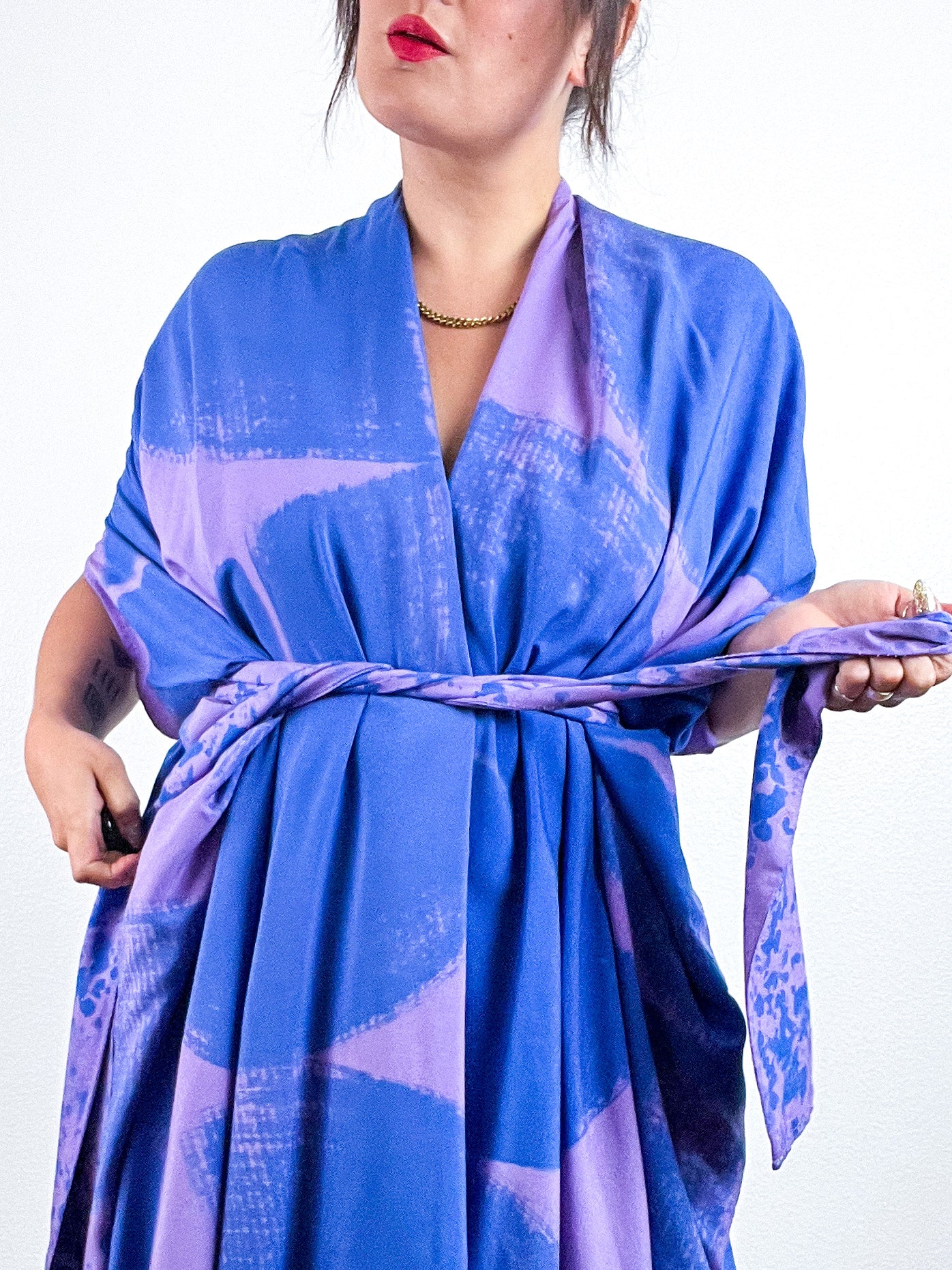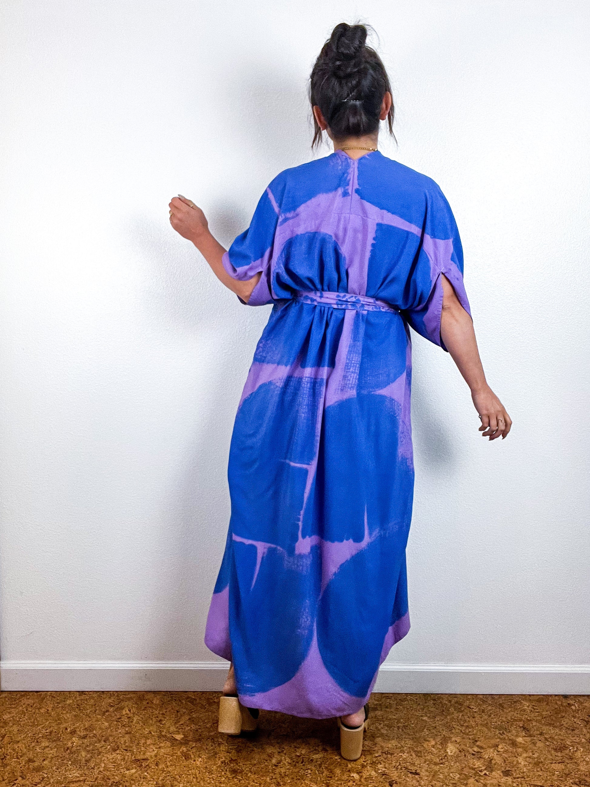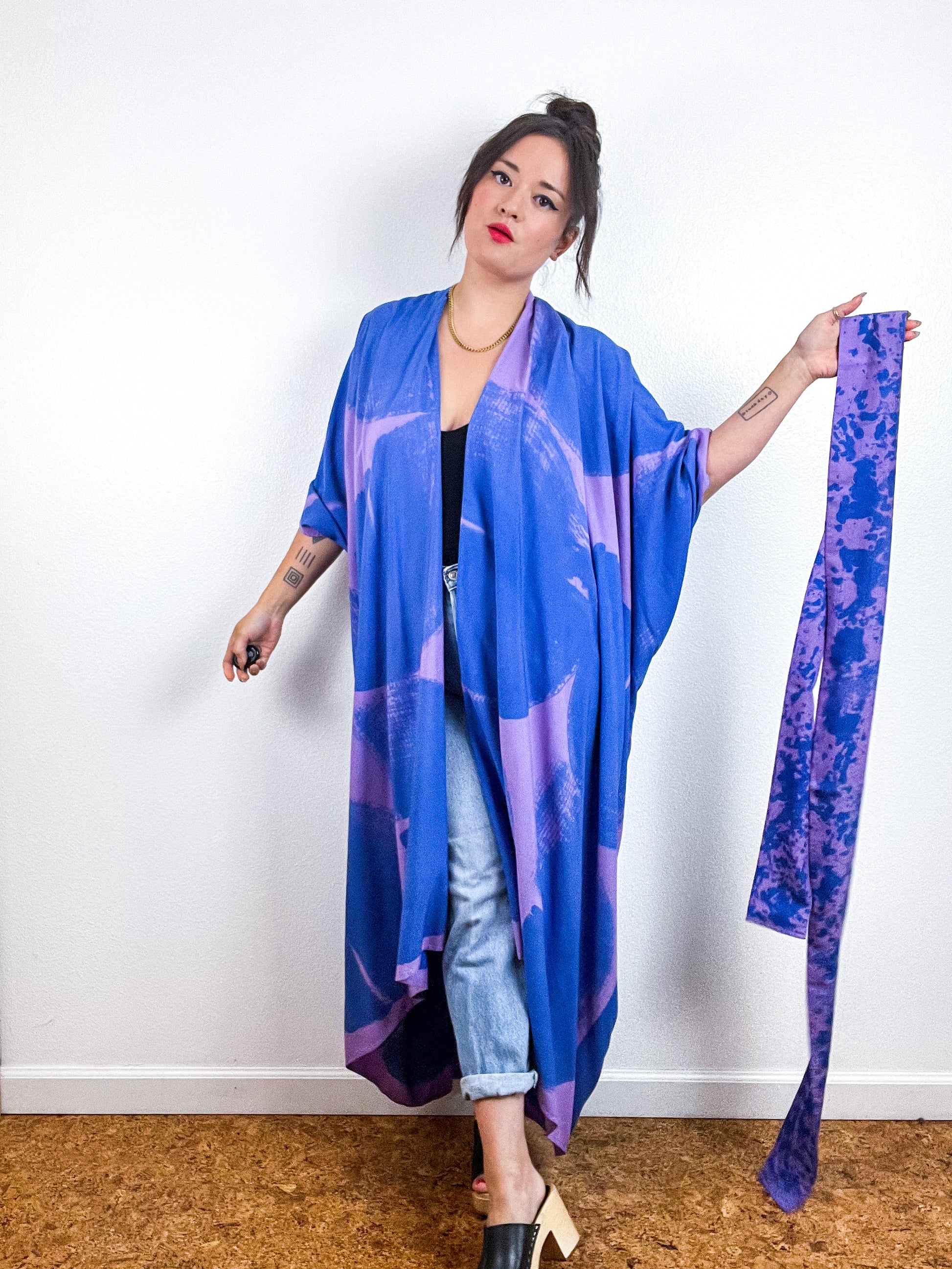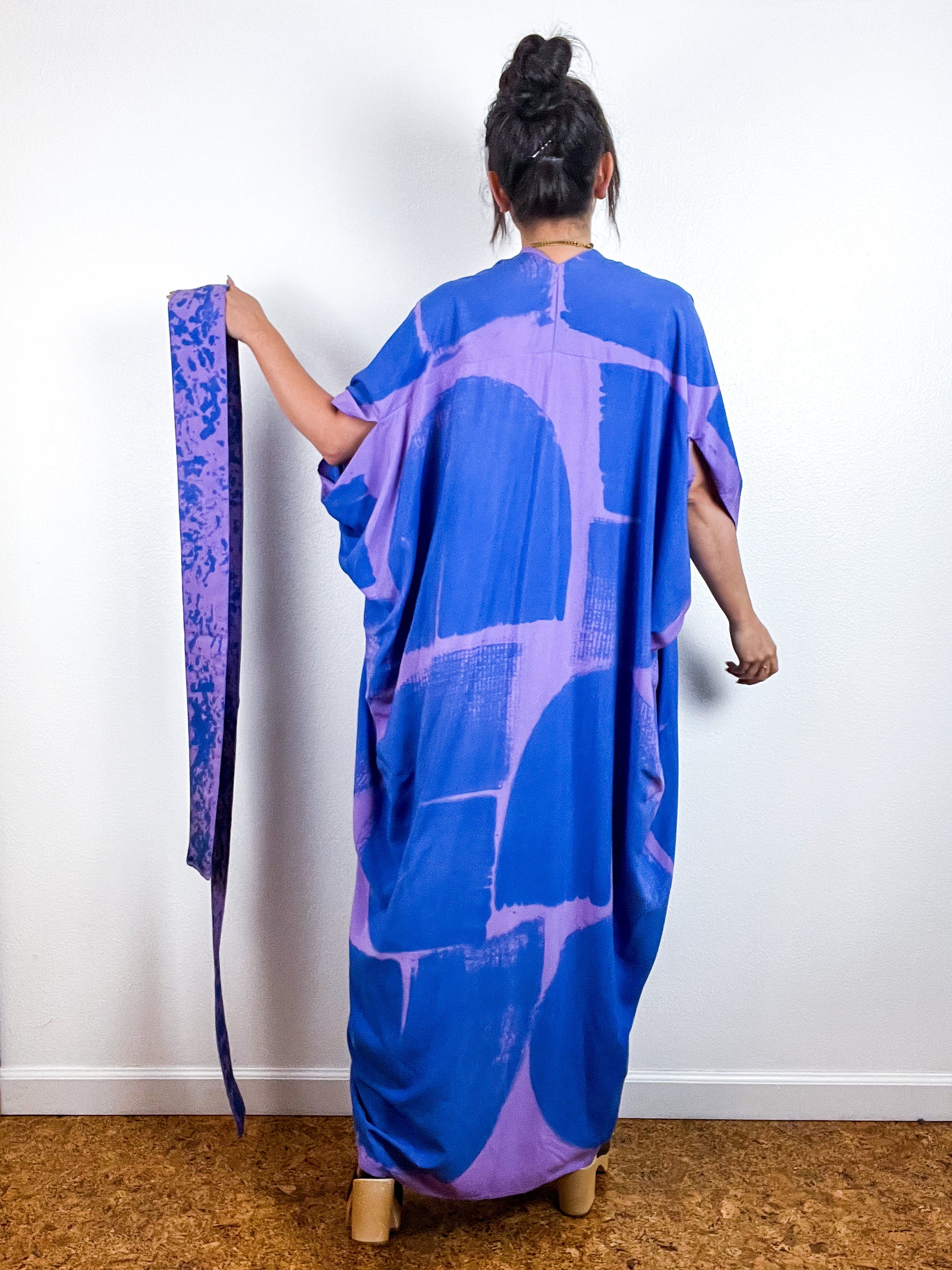 Soft and airy kimono with a flowing silhouette, tulip sleeve detail, curved high low hem and separate waist tie. Versatile shape can be styled as a wrap dress, an open kimono without the tie, or a robe for staying home. The minimalist design created from a full rectangle of fabric drapes beautifully over the shoulders and produces no material waste by utilizing one whole piece of fabric without scraps from corners and irregular cuts. Lightweight woven lilac fabric is hand-dyed with periwinkle algae thickened dye using a gestural brushstroke technique.