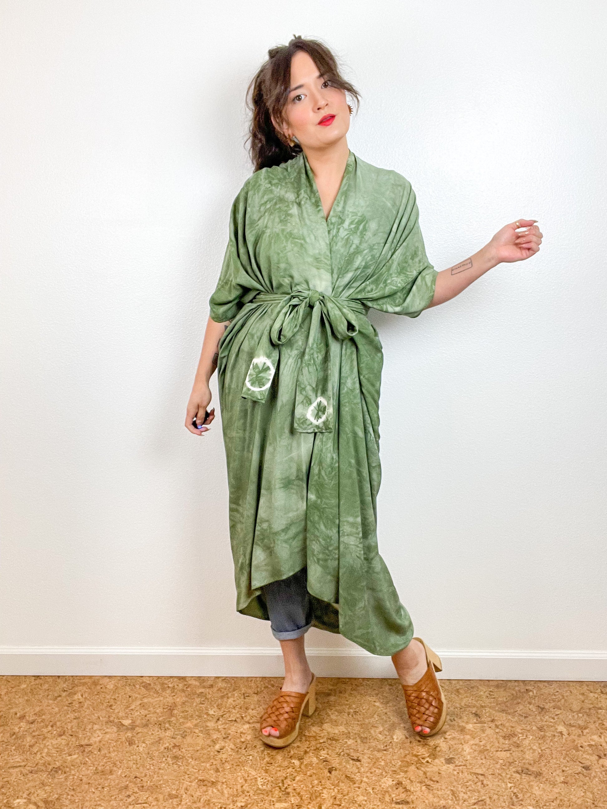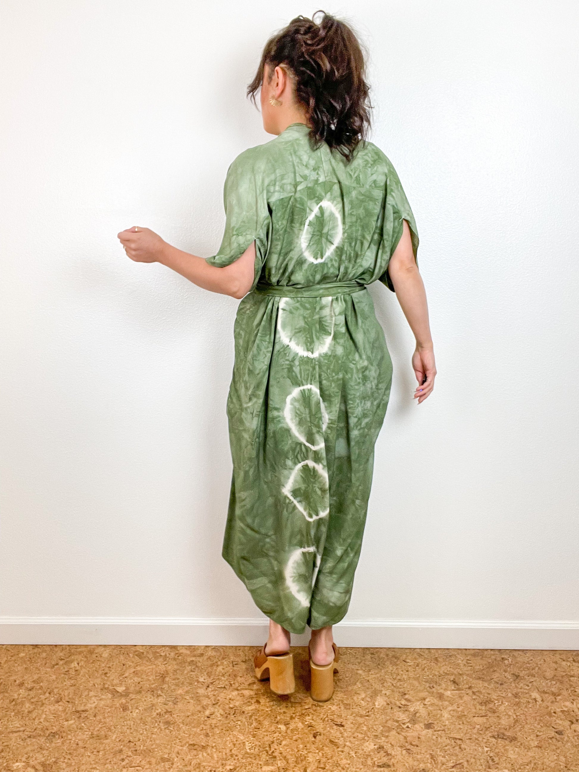 Soft and airy kimono with a flowing silhouette, tulip sleeve detail, curved high low hem and optional waist tie. Versatile shape can be styled as a wrap dress, lightweight jacket over jeans, or an elegant robe over lingerie. The minimalist design created from a full rectangle of fabric drapes beautifully over the shoulders and produces no material waste by utilizing one whole piece of fabric without scraps from corners and irregular cuts. Lightweight woven fabric is hand-dyed with a placed circle pattern in a low water variegated sage green color.