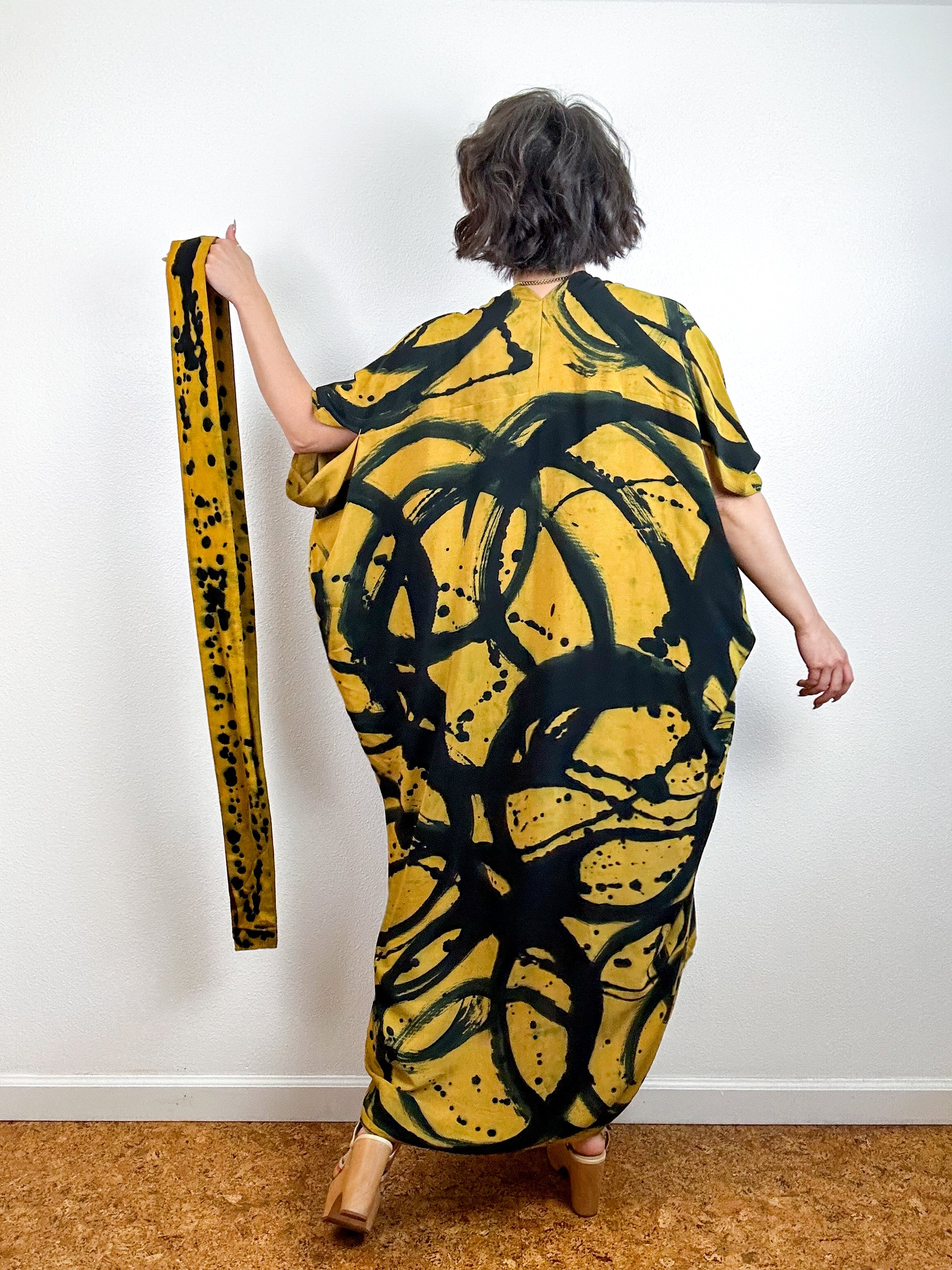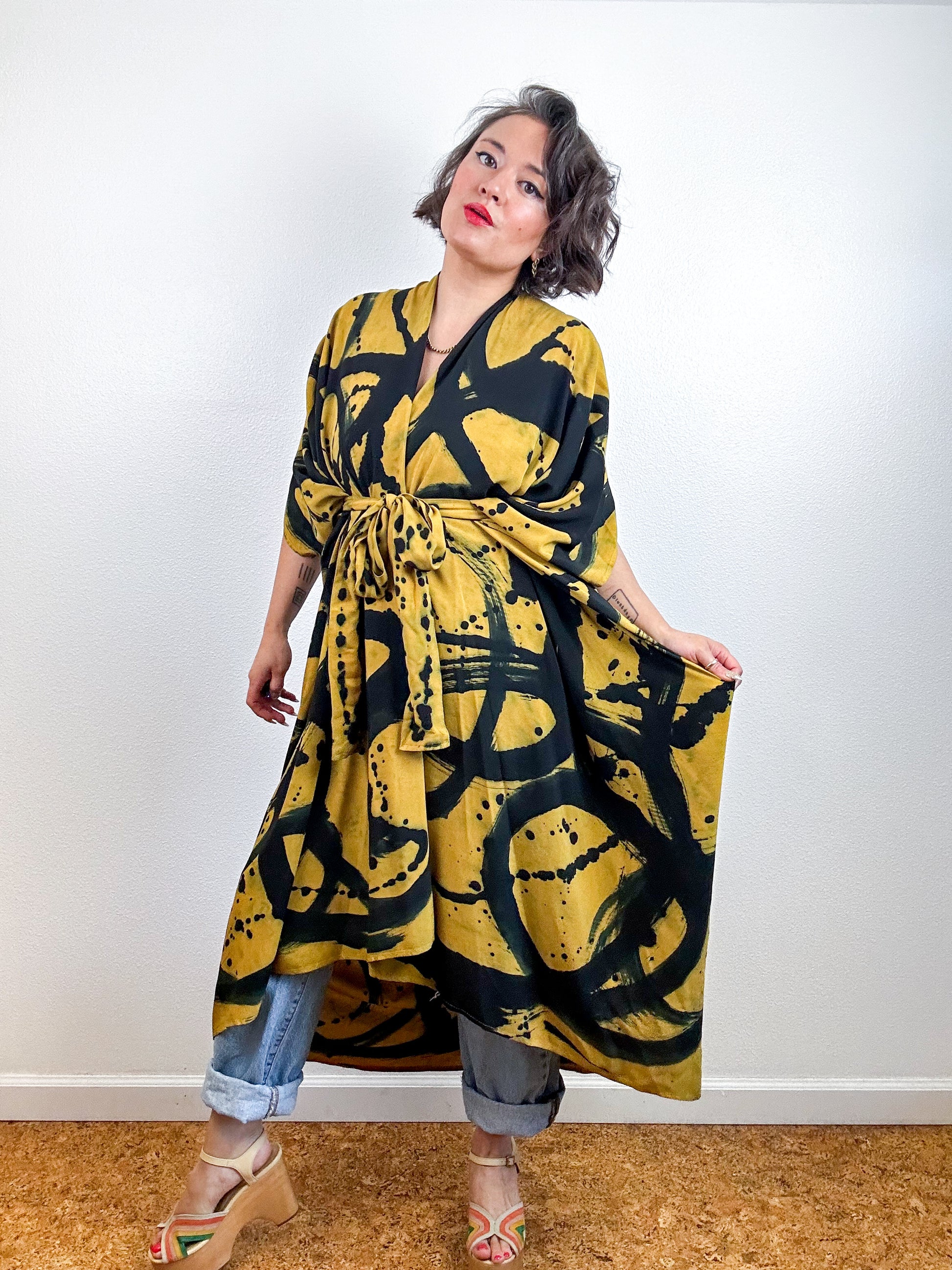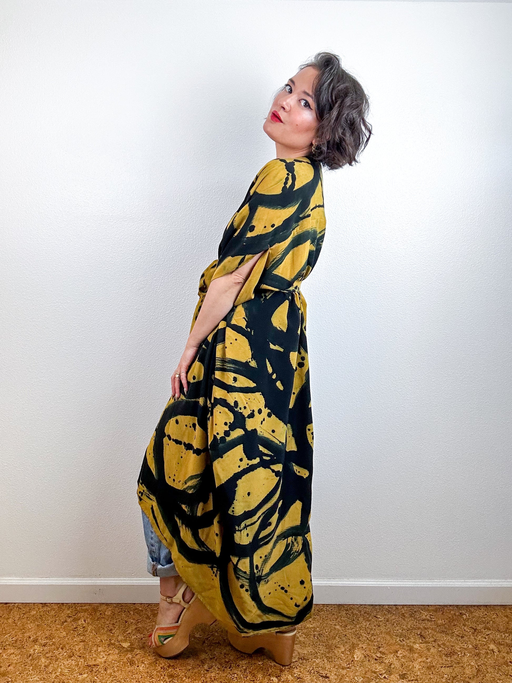 Soft and airy kimono with a flowing silhouette, tulip sleeve detail, curved high low hem and separate waist tie. Versatile shape can be styled as a wrap dress, an open kimono without the tie, or a robe for staying home. The minimalist design created from a full rectangle of fabric drapes beautifully over the shoulders and produces no material waste by utilizing one whole piece of fabric without scraps from corners and irregular cuts. Lightweight woven marigold fabric is hand-dyed with black algae thickened dye using a gestural brushstroke technique.