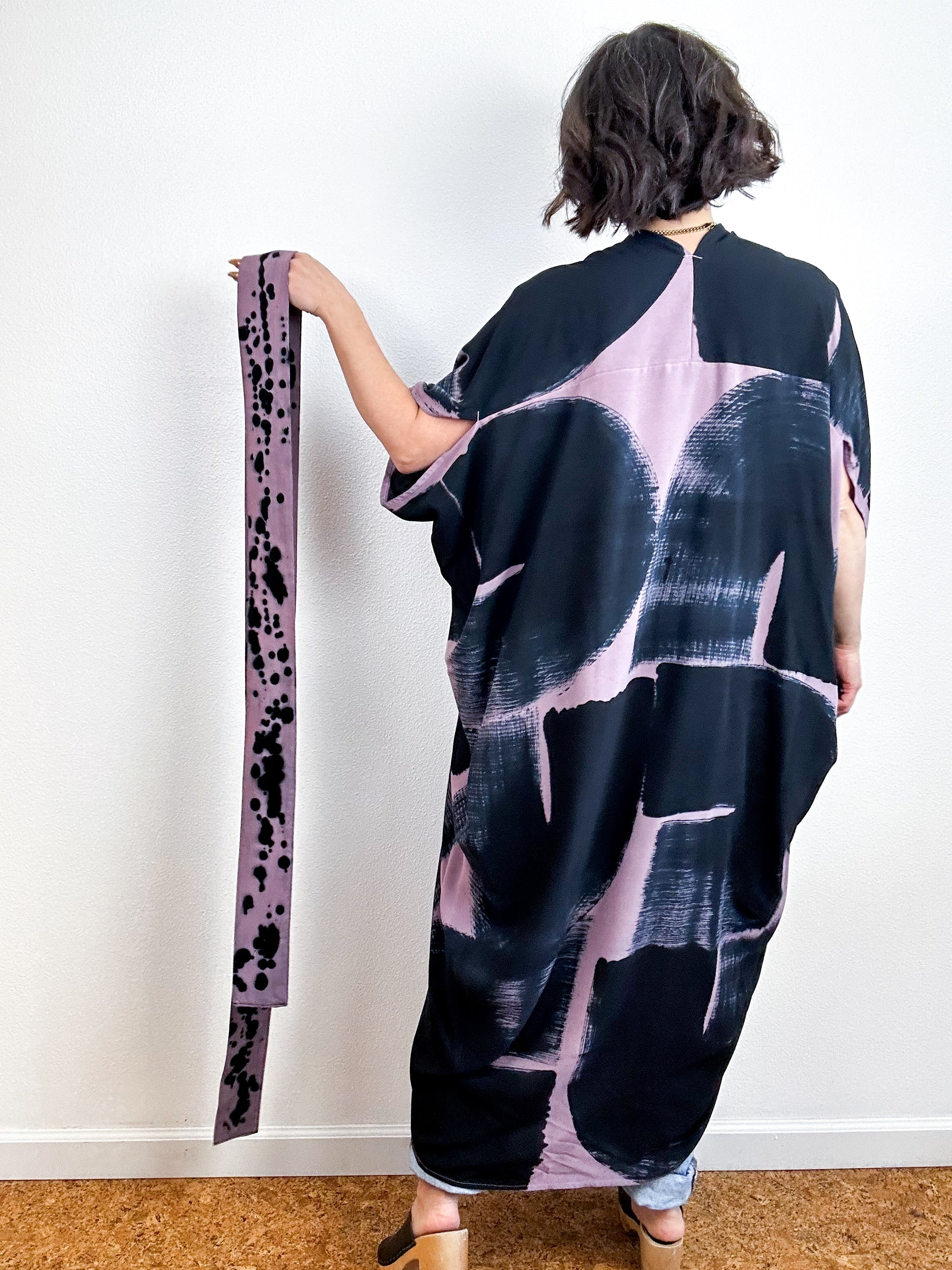 Soft and airy kimono with a flowing silhouette, tulip sleeve detail, curved high low hem and separate waist tie. Versatile shape can be styled as a wrap dress, an open kimono without the tie, or a robe for staying home. The minimalist design created from a full rectangle of fabric drapes beautifully over the shoulders and produces no material waste by utilizing one whole piece of fabric without scraps from corners and irregular cuts. Lightweight woven mauve pink fabric is hand-dyed with black algae thickened dye using a gestural brushstroke technique.