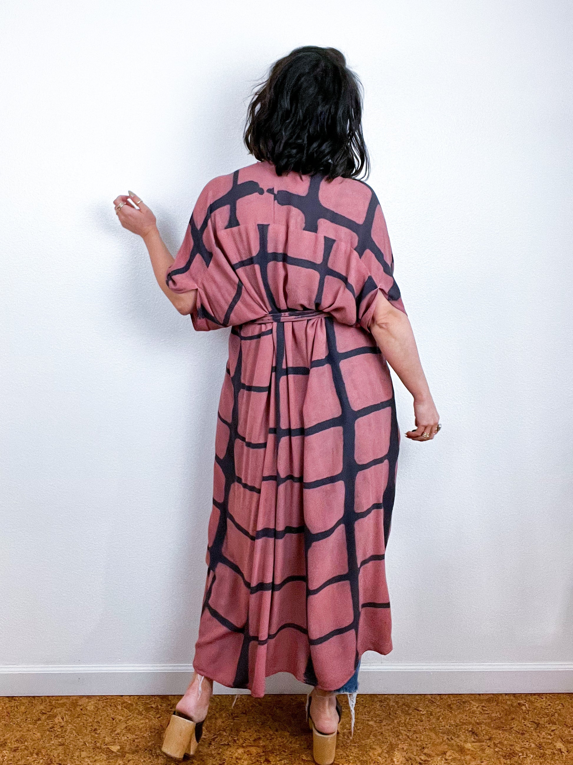 Hand-Dyed High Low Kimono Mauve Grey Windowpane