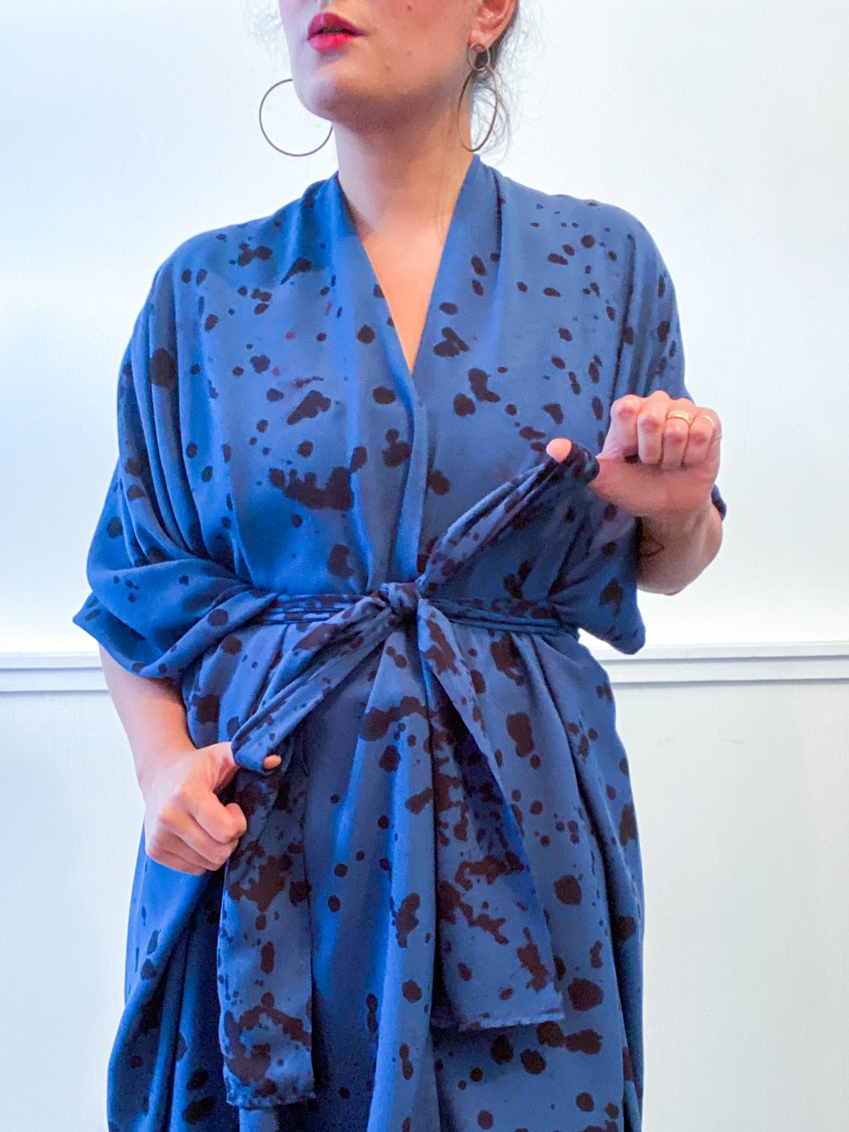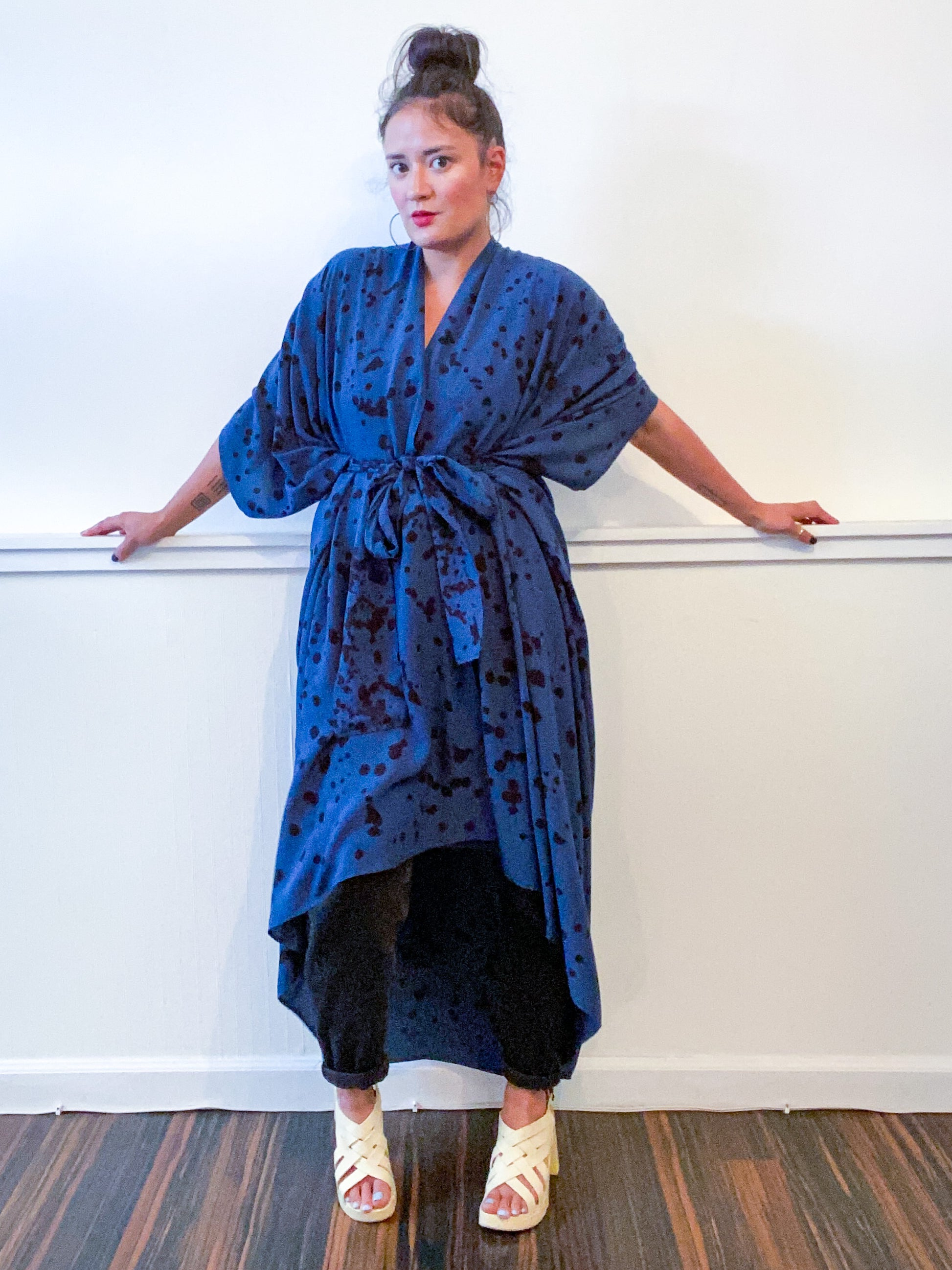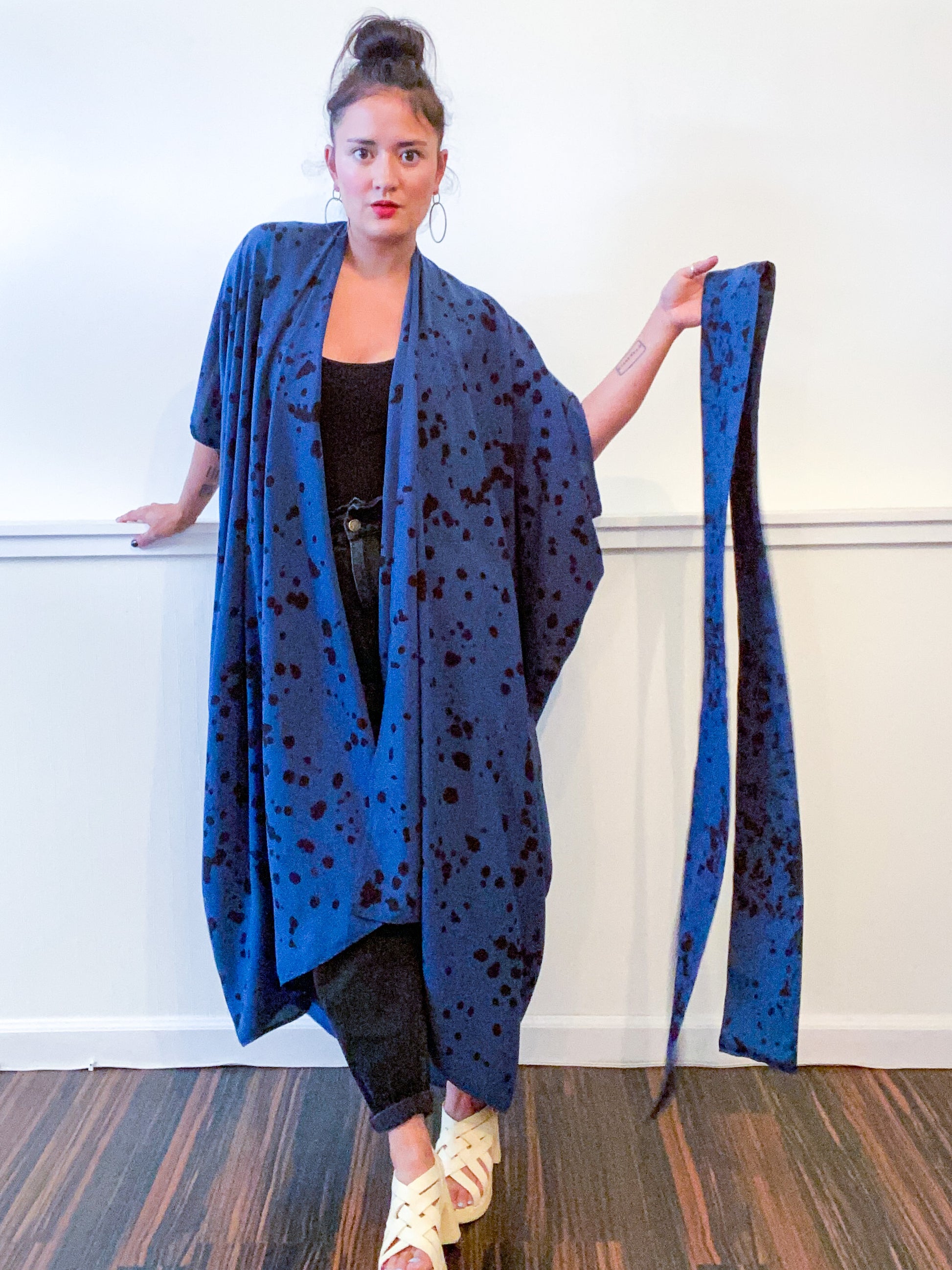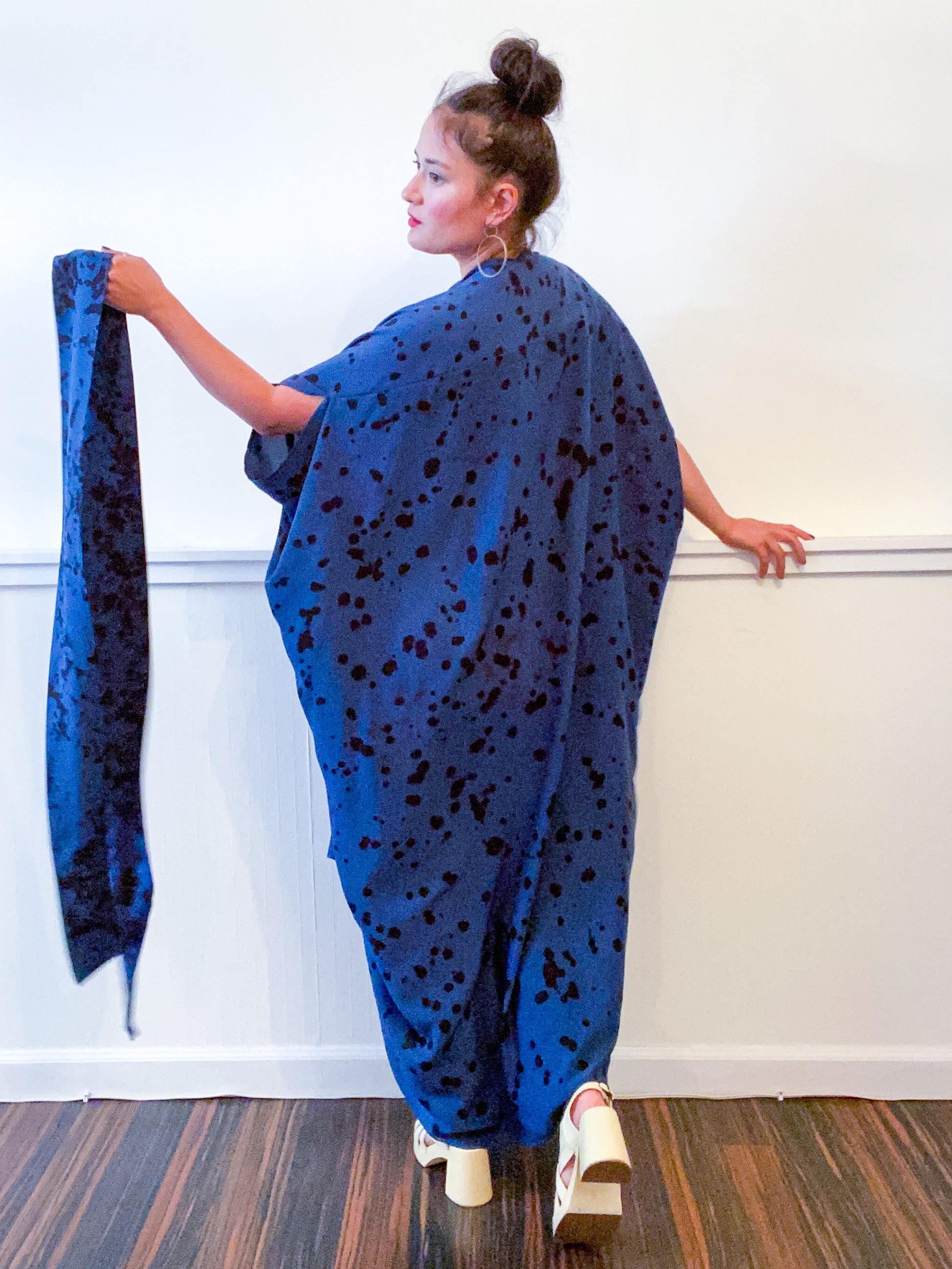 Soft and airy kimono with a flowing silhouette, fringed selvage sleeve detail, curved high low hem and optional waist tie. Versatile shape can be styled as a wrap dress, lightweight jacket over jeans, or an elegant robe over lingerie. The minimalist design created from a full rectangle of fabric drapes beautifully over the shoulders and produces no material waste by utilizing one whole piece of fabric without scraps from corners and irregular cuts. Lightweight navy blue woven fabric is hand-dyed with black drops and pink “shadows”.