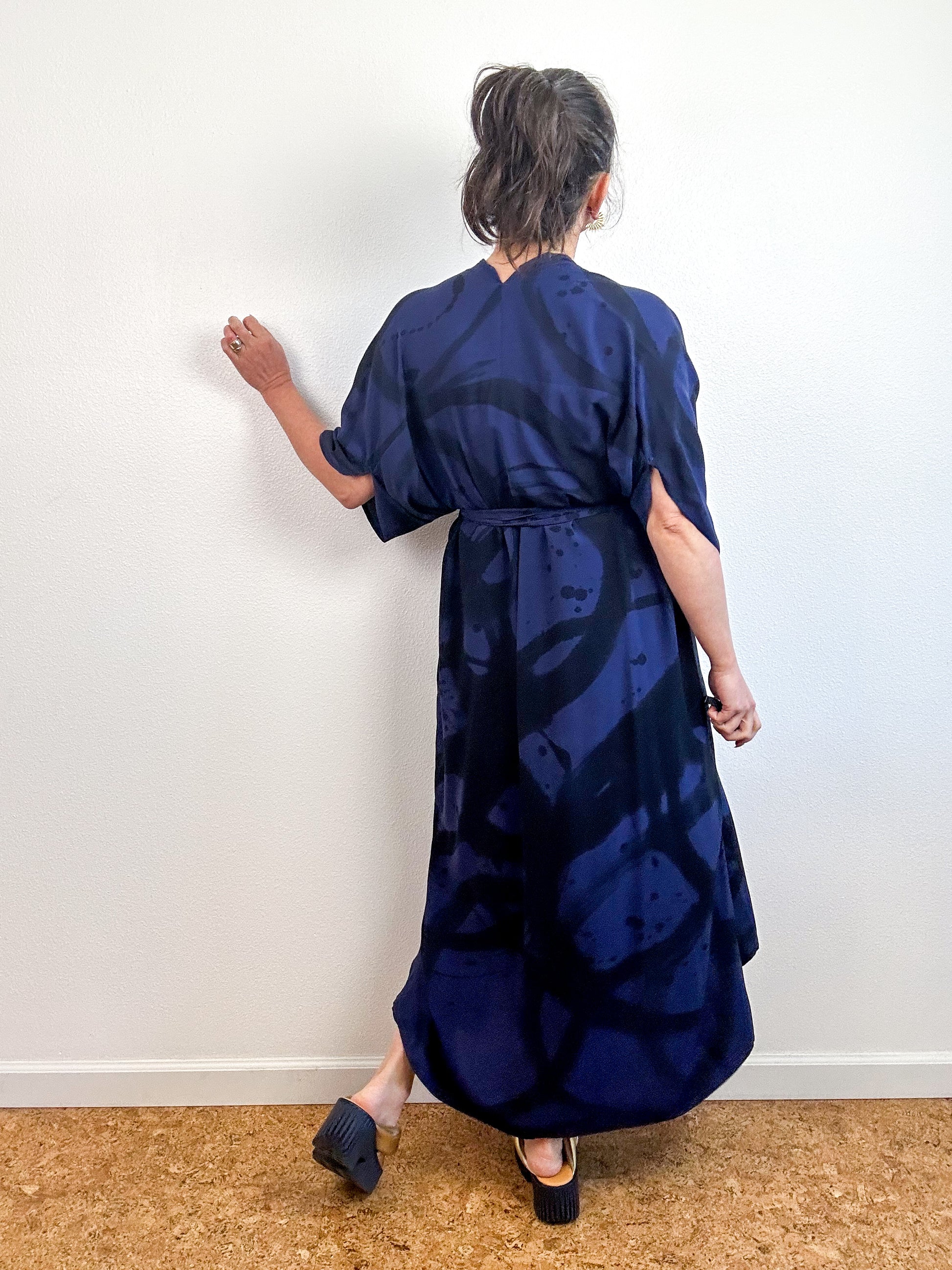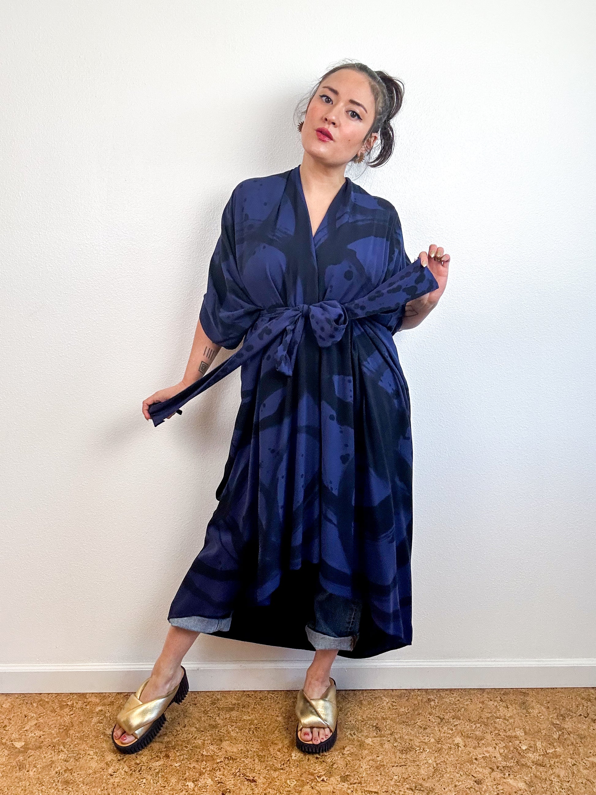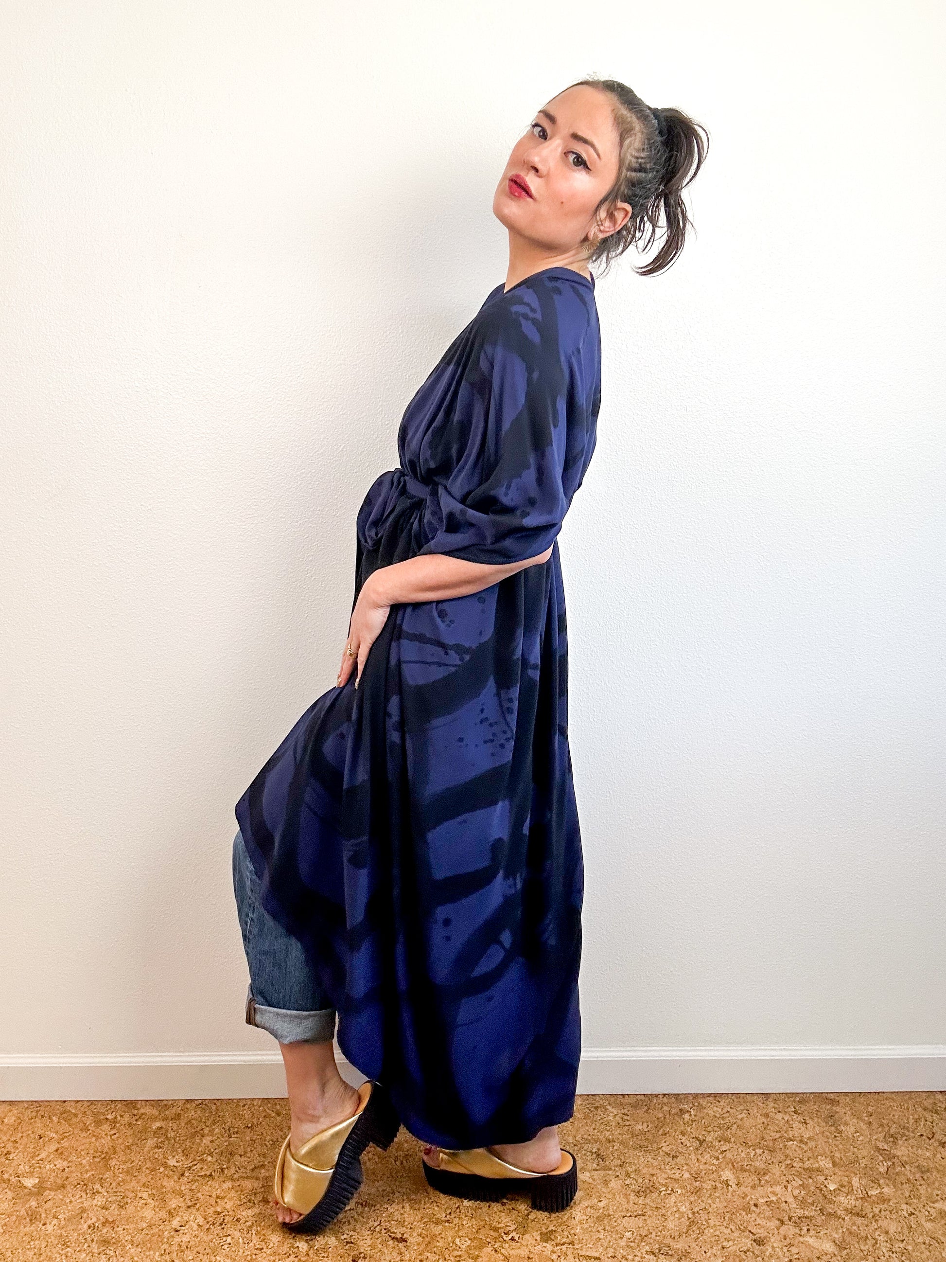 Soft and airy kimono with a flowing silhouette, tulip sleeve detail, curved high low hem and separate waist tie. Versatile shape can be styled as a wrap dress, an open kimono without the tie, or a robe for staying home. The minimalist design created from a full rectangle of fabric drapes beautifully over the shoulders and produces no material waste by utilizing one whole piece of fabric without scraps from corners and irregular cuts. Lightweight woven navy blue fabric is hand-dyed with black algae thickened dye using a gestural brushstroke technique.