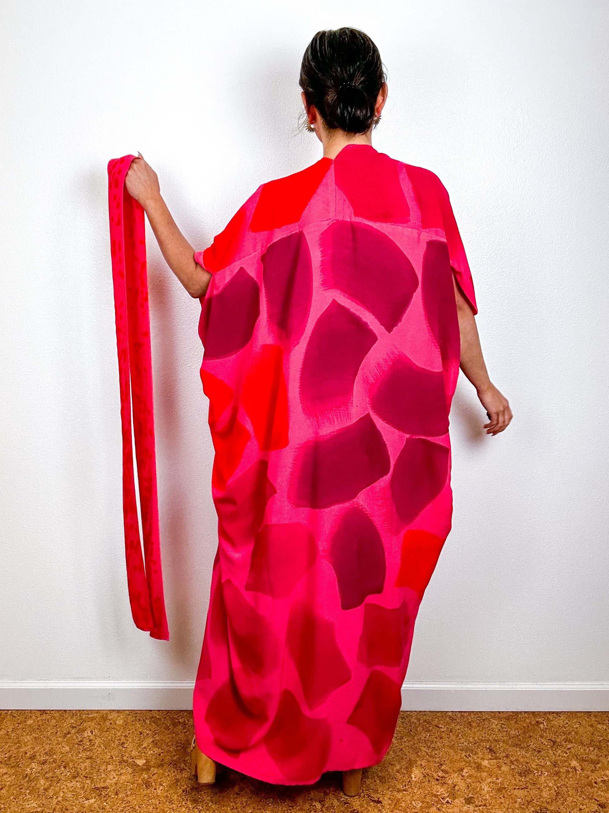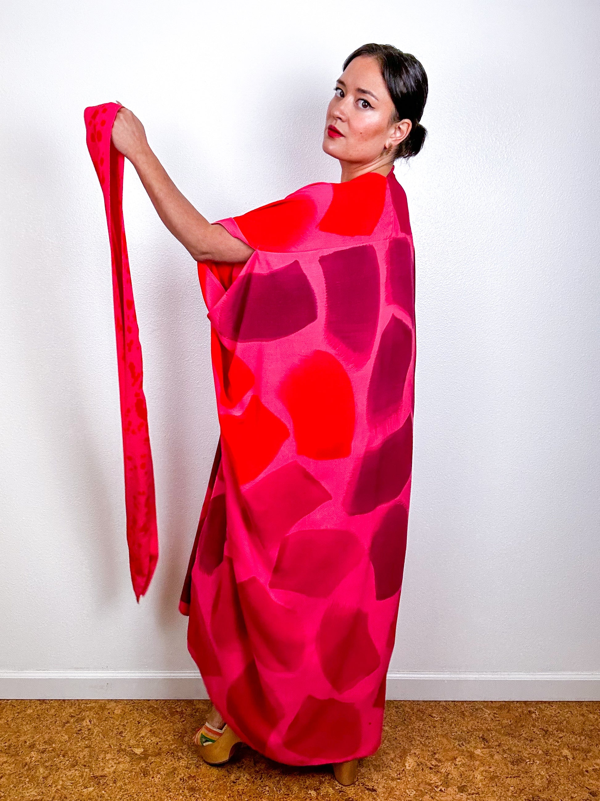One of a kind kimono with a flowing silhouette, tulip sleeve detail, curved high low hem and separate waist tie. Versatile shape can be styled as a wrap dress, an open kimono without the tie, or a robe for staying home. The minimalist design created from a full rectangle of fabric drapes beautifully over the shoulders and produces no material waste by utilizing one whole piece of fabric without scraps from corners and irregular cuts. Lightweight woven coral fabric is hand-dyed with scarlet, fuchsia maroon algae thickened dye using a gestural brushstroke technique.