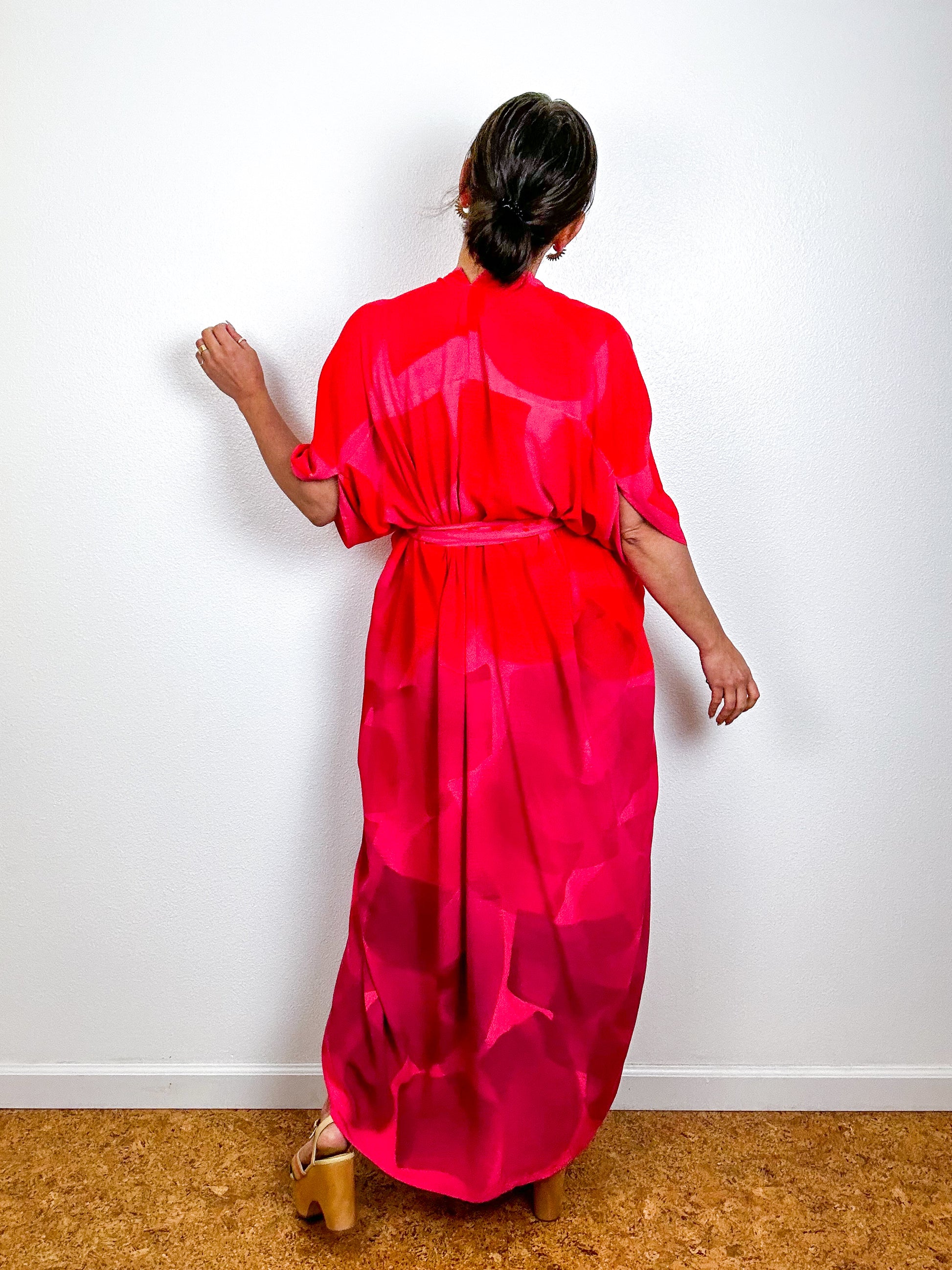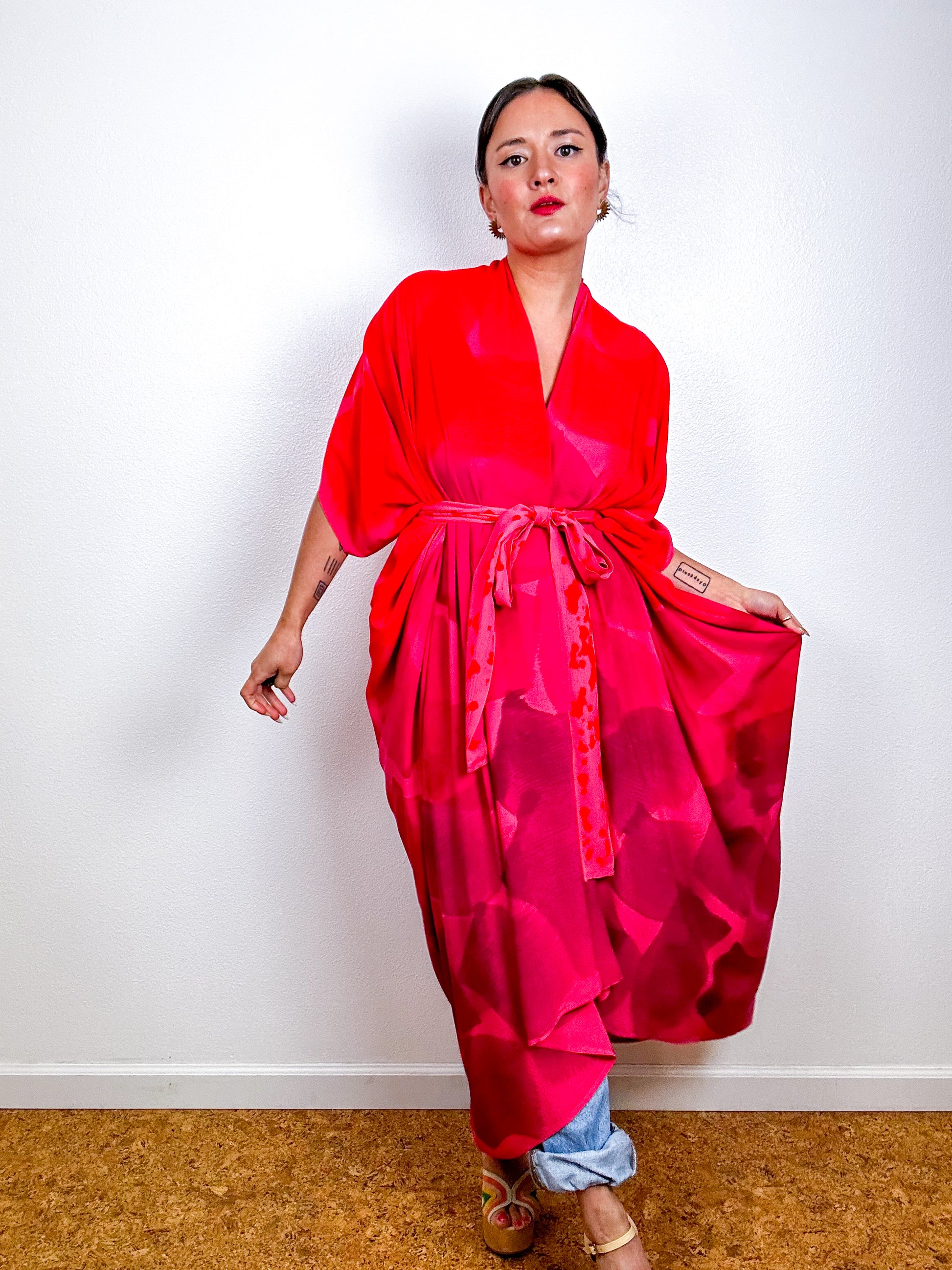 One of a kind kimono with a flowing silhouette, tulip sleeve detail, curved high low hem and separate waist tie. Versatile shape can be styled as a wrap dress, an open kimono without the tie, or a robe for staying home. The minimalist design created from a full rectangle of fabric drapes beautifully over the shoulders and produces no material waste by utilizing one whole piece of fabric without scraps from corners and irregular cuts. Lightweight woven coral fabric is hand-dyed with scarlet, fuchsia maroon algae thickened dye using a gestural brushstroke technique.