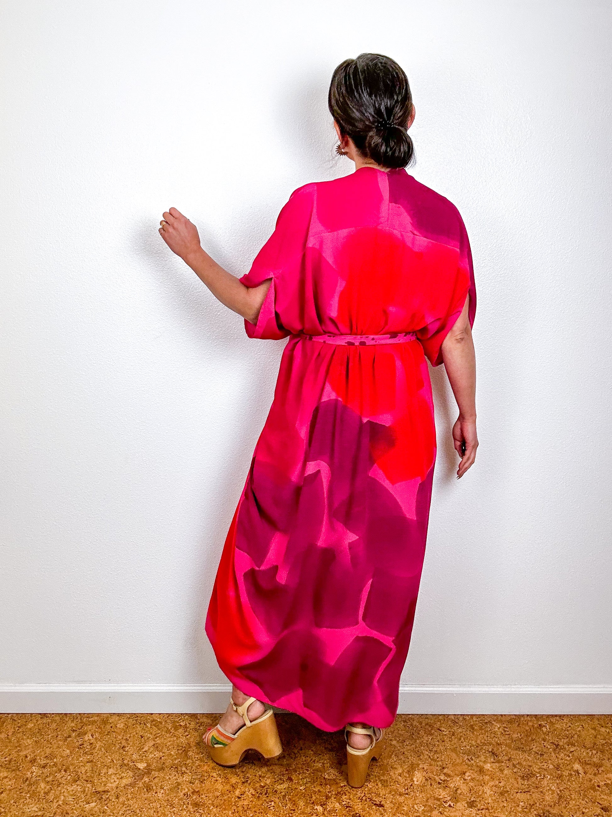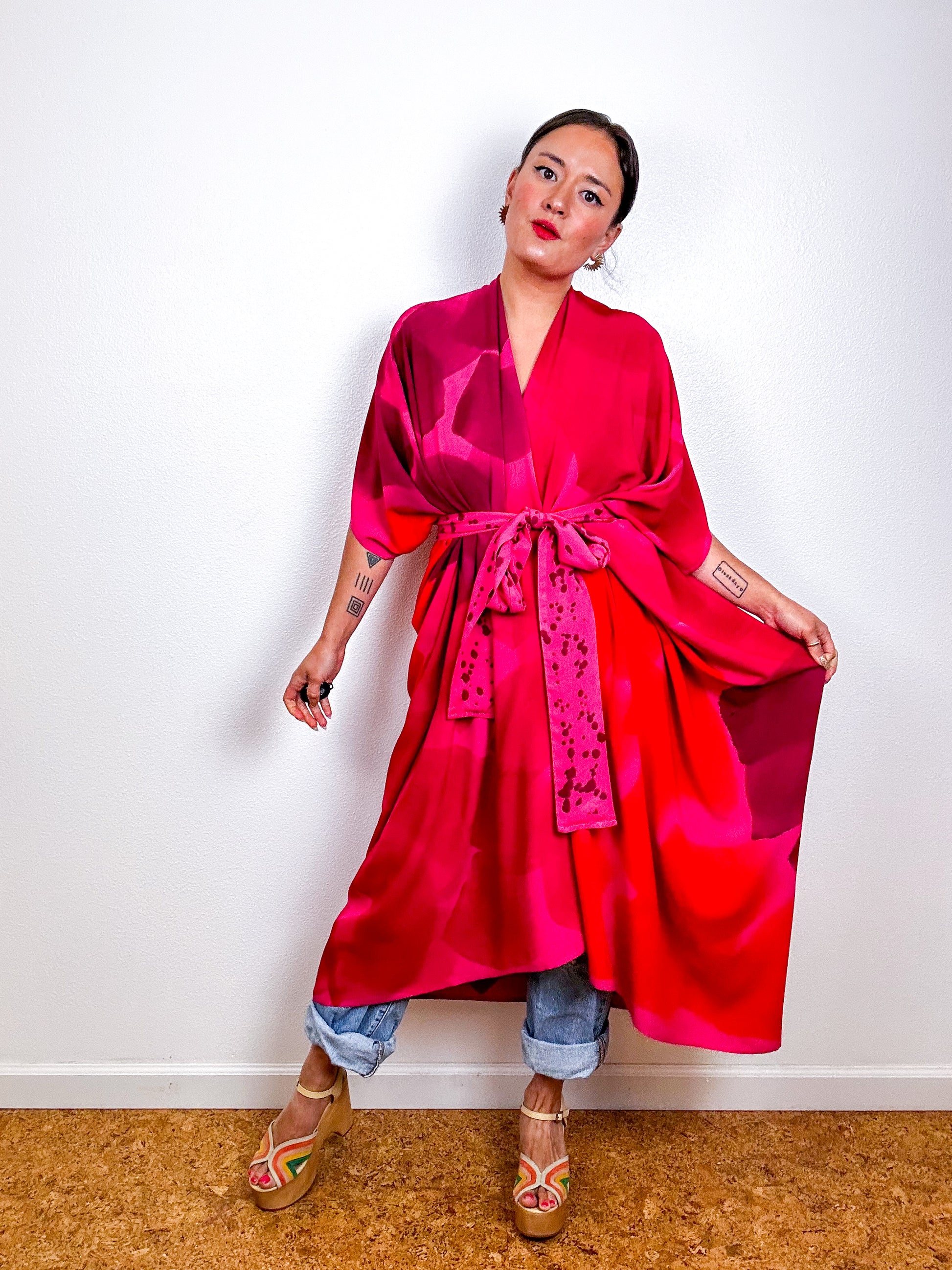 One of a kind kimono with a flowing silhouette, tulip sleeve detail, curved high low hem and separate waist tie. Versatile shape can be styled as a wrap dress, an open kimono without the tie, or a robe for staying home. The minimalist design created from a full rectangle of fabric drapes beautifully over the shoulders and produces no material waste by utilizing one whole piece of fabric without scraps from corners and irregular cuts. Lightweight woven fuchsia fabric is hand-dyed with scarlet, fuchsia maroon algae thickened dye using a gestural brushstroke technique.