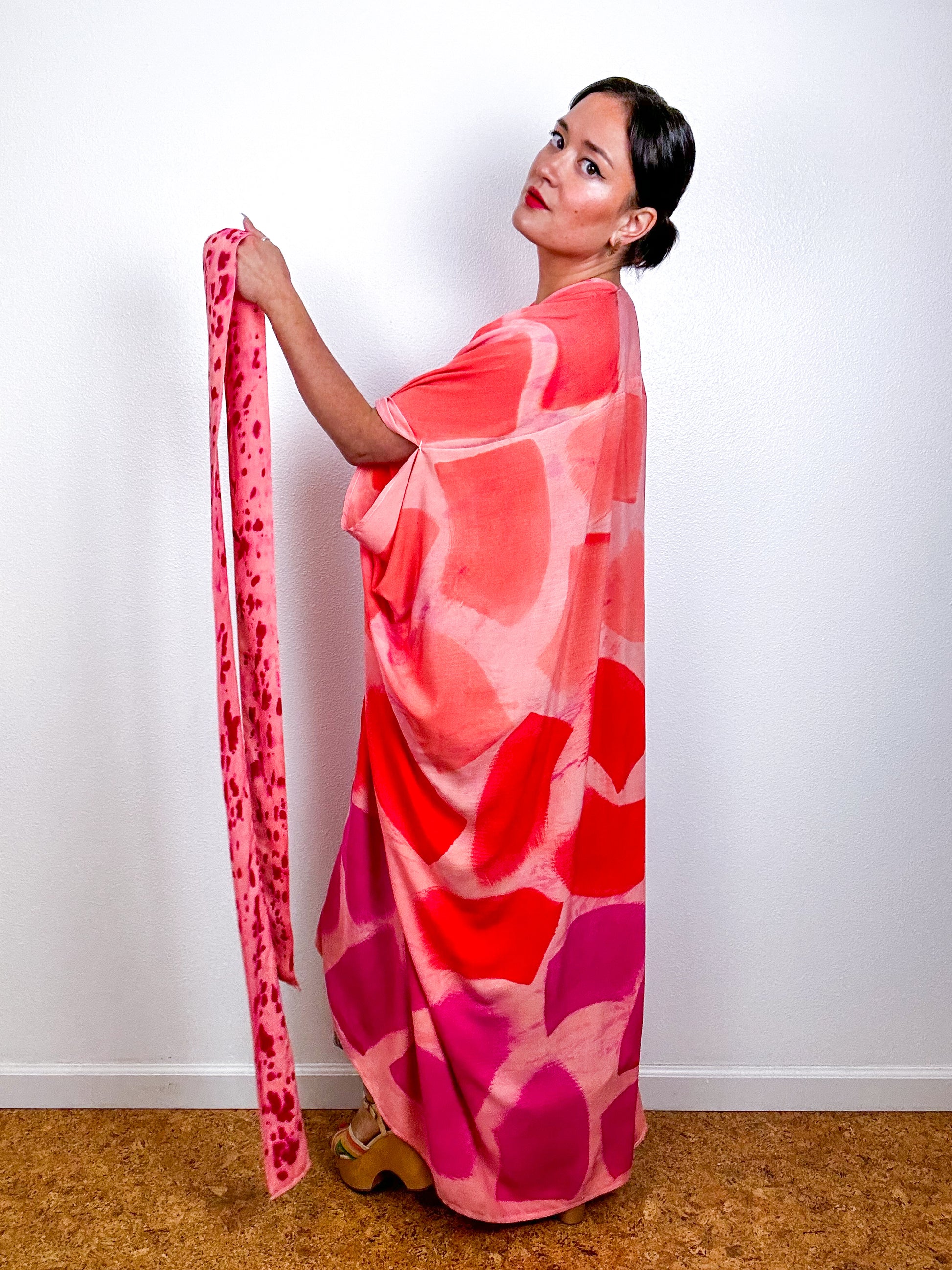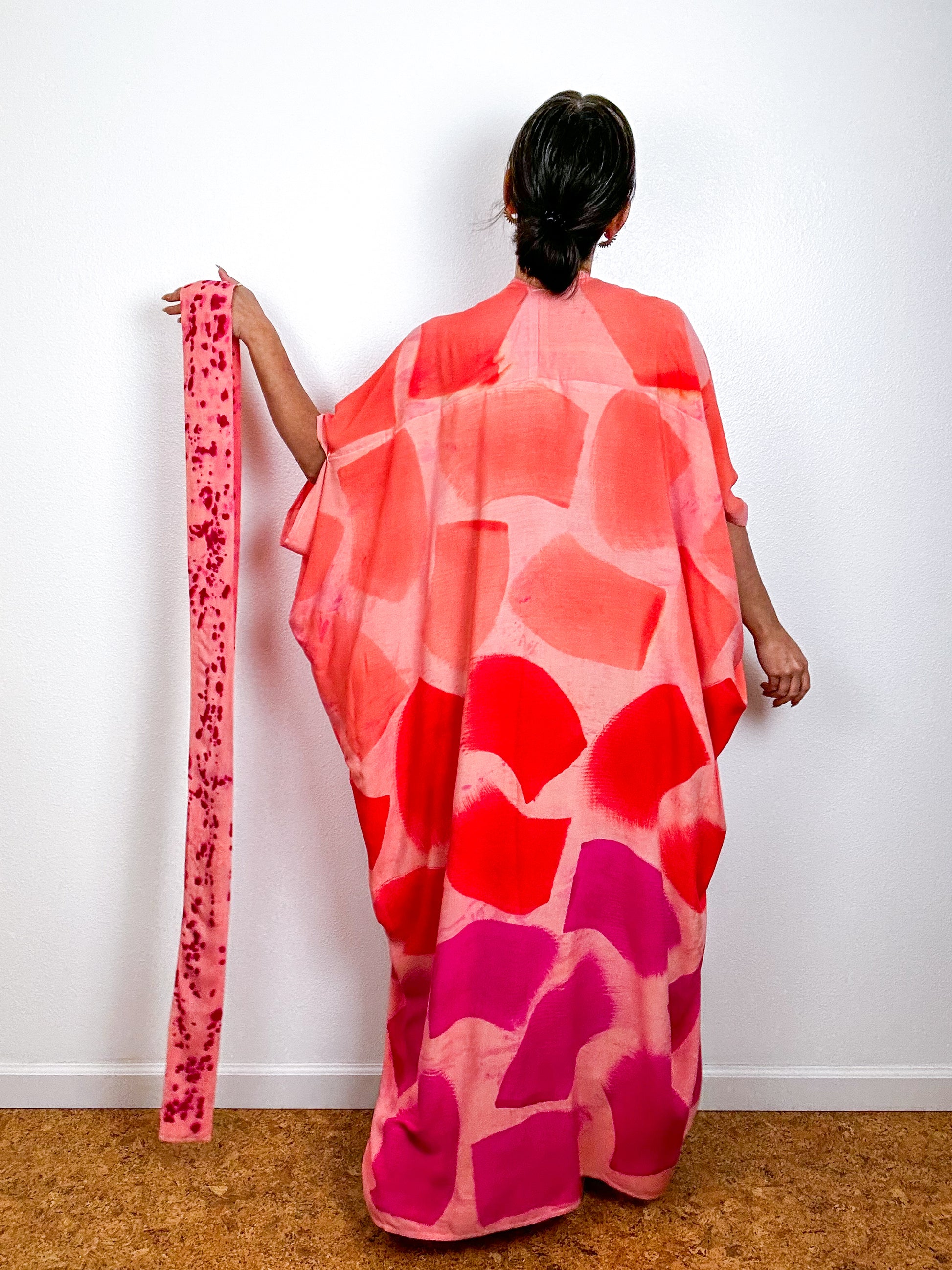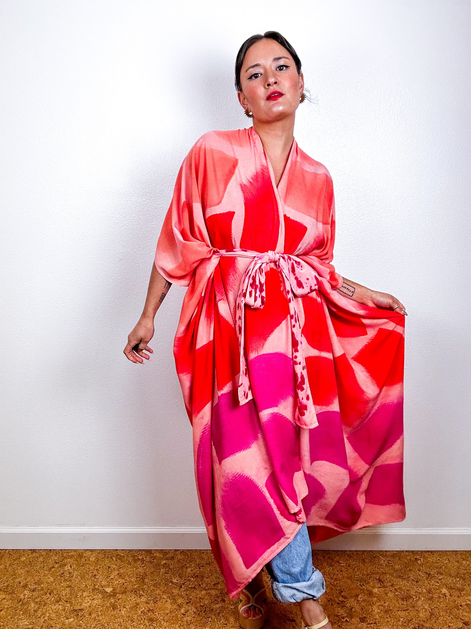 One of a kind kimono with a flowing silhouette, tulip sleeve detail, curved high low hem and separate waist tie. Versatile shape can be styled as a wrap dress, an open kimono without the tie, or a robe for staying home. The minimalist design created from a full rectangle of fabric drapes beautifully over the shoulders and produces no material waste by utilizing one whole piece of fabric without scraps from corners and irregular cuts. Lightweight woven peach fabric is hand-dyed with scarlet, fuchsia, coral algae thickened dye using a gestural brushstroke technique.