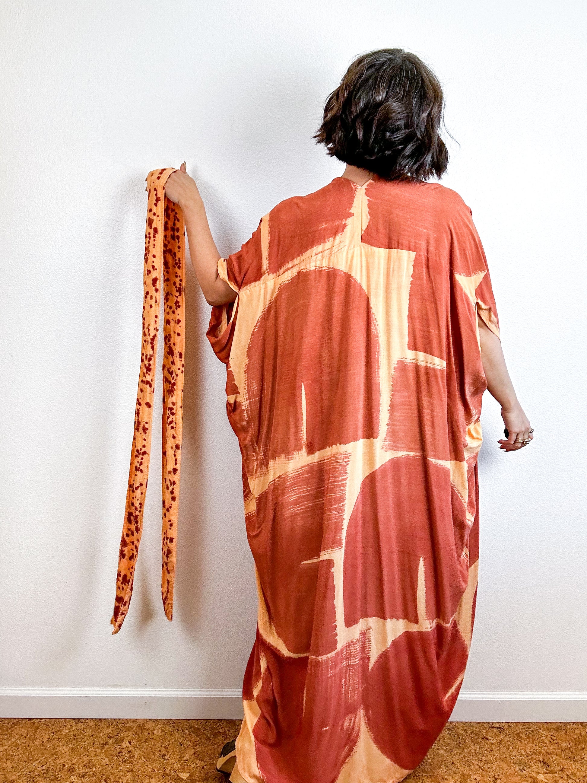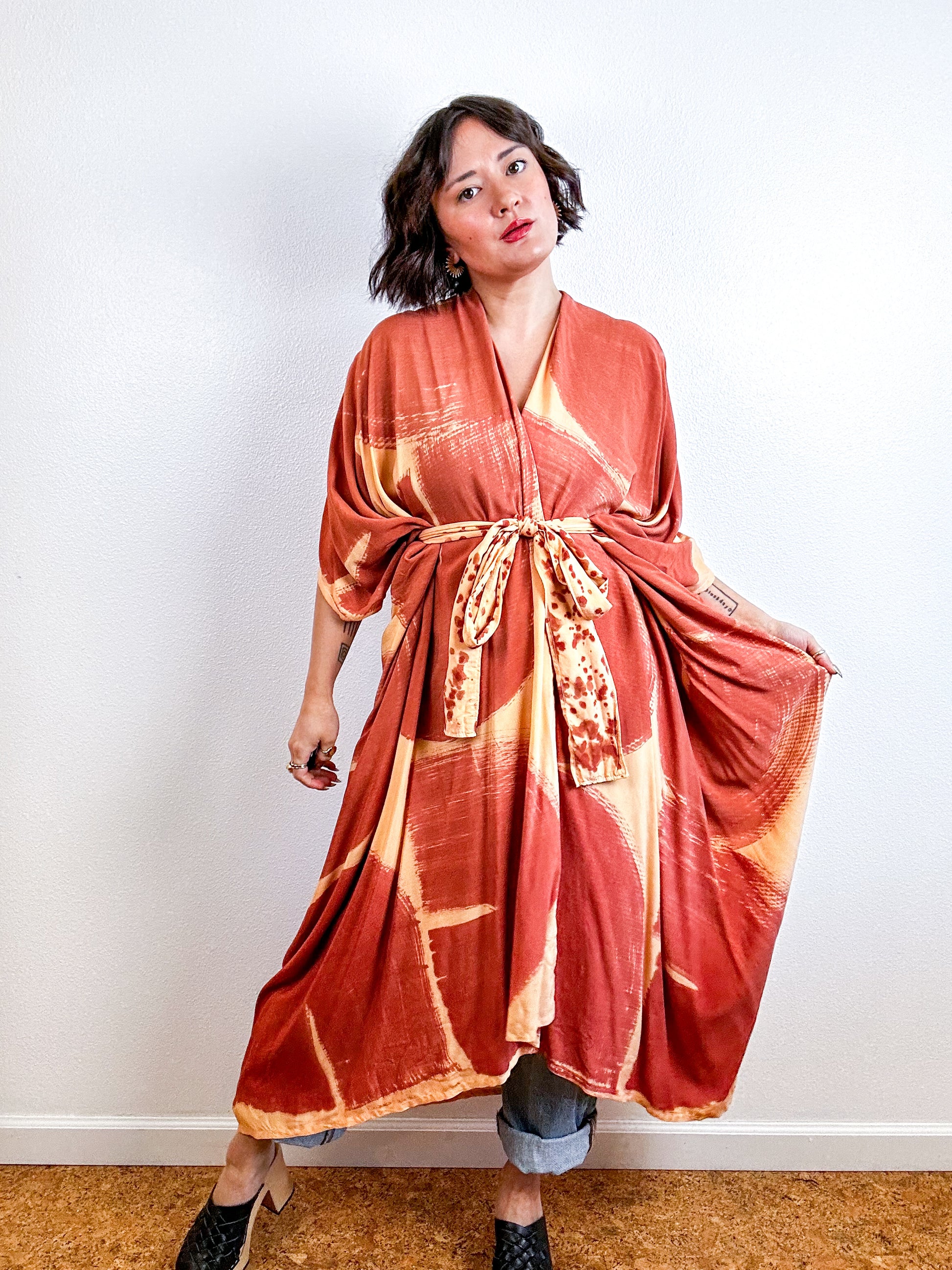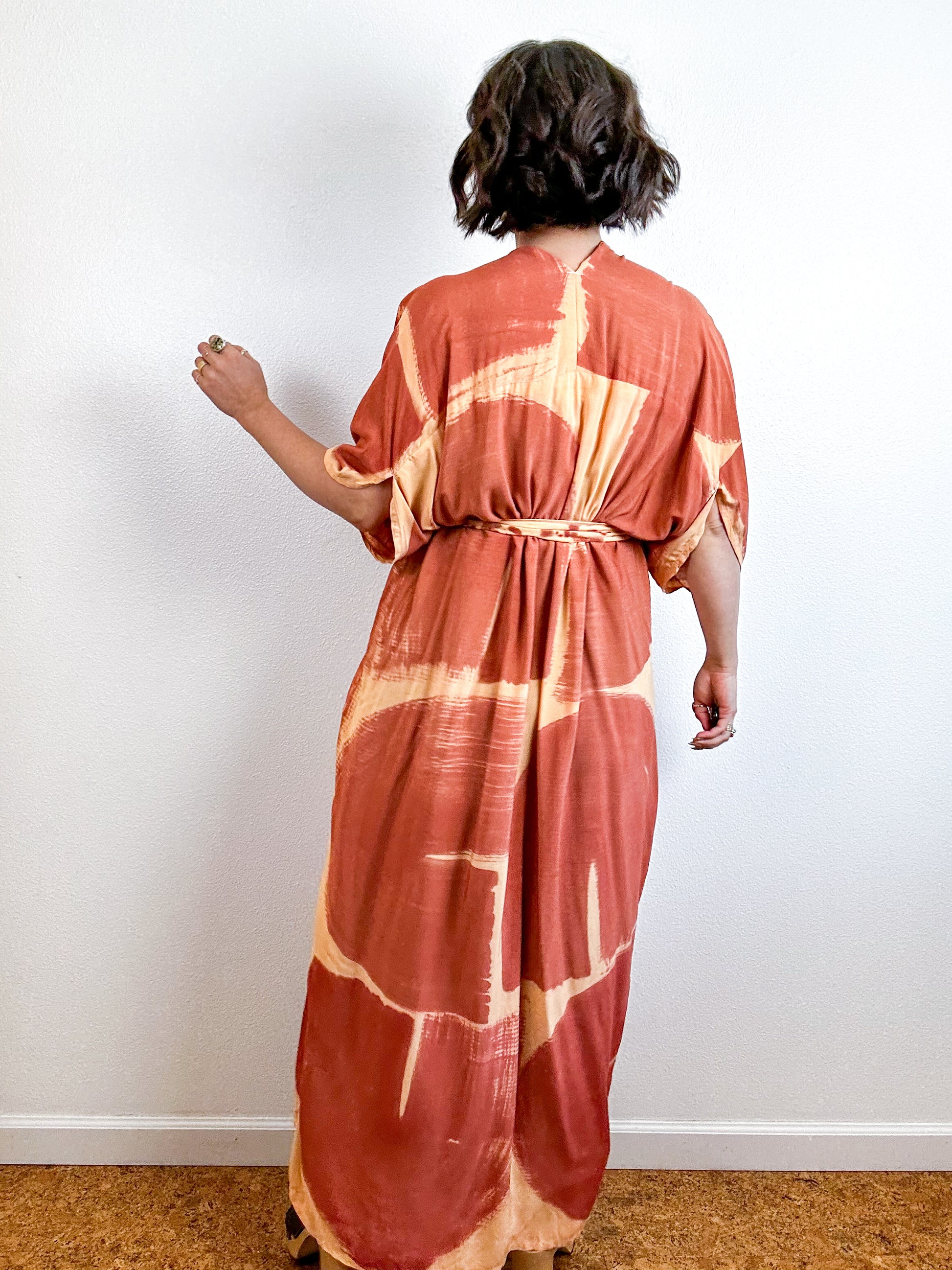 Soft and airy kimono with a flowing silhouette, tulip sleeve detail, curved high low hem and separate waist tie. Versatile shape can be styled as a wrap dress, an open kimono without the tie, or a robe for staying home. The minimalist design created from a full rectangle of fabric drapes beautifully over the shoulders and produces no material waste by utilizing one whole piece of fabric without scraps from corners and irregular cuts. Lightweight woven peach fabric is hand-dyed with terracotta algae thickened dye using a gestural brushstroke technique.