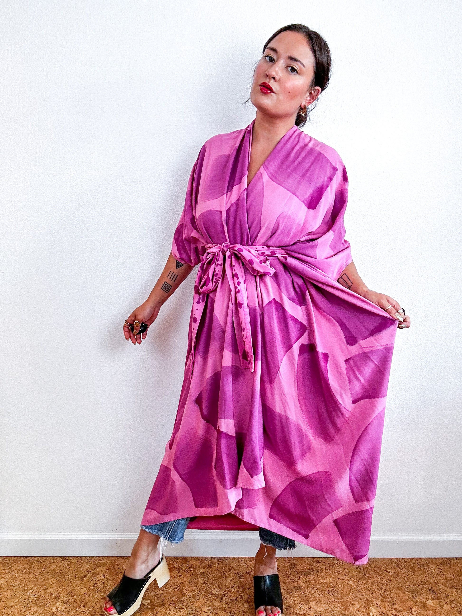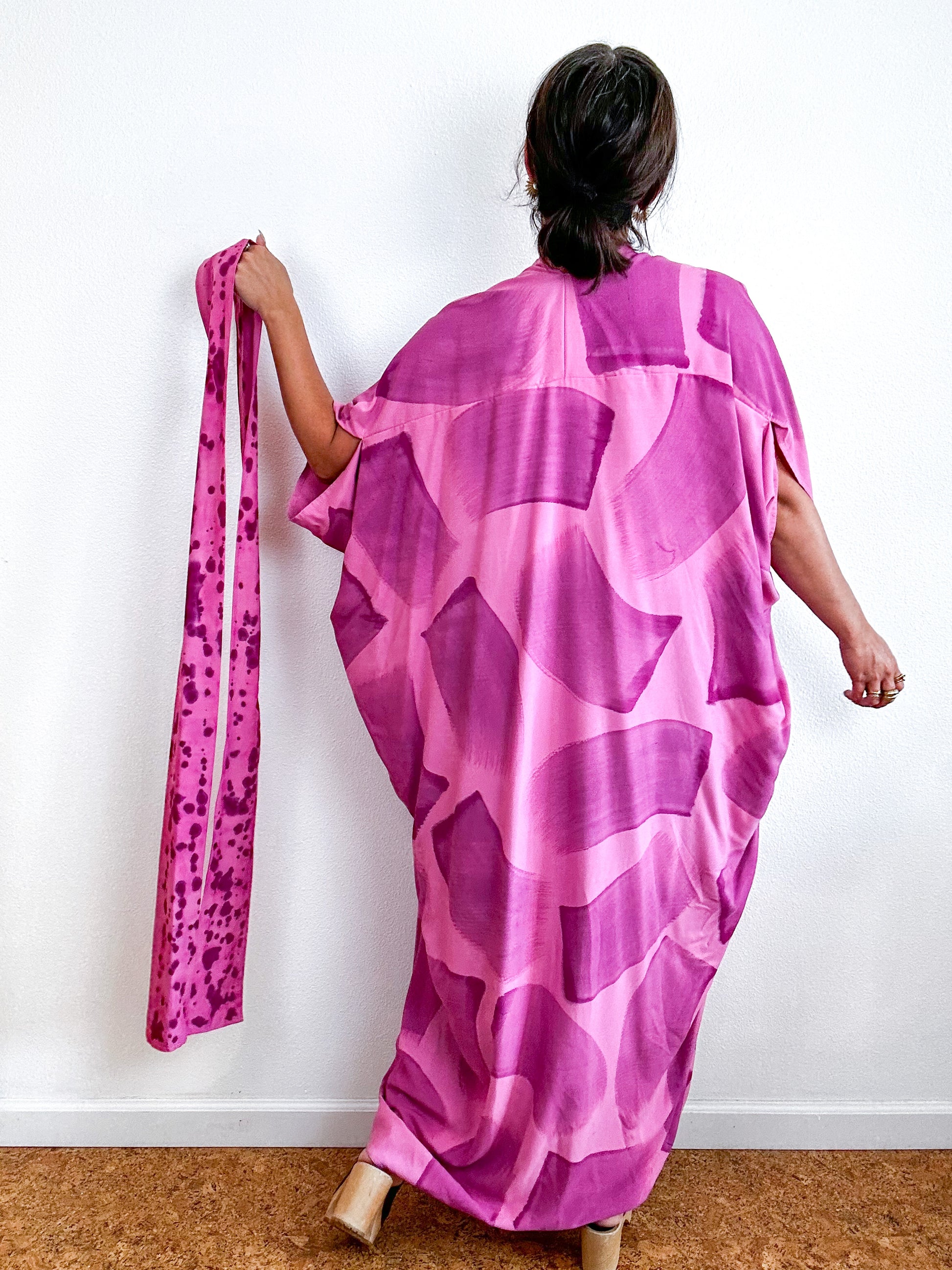 Soft and airy kimono with a flowing silhouette, tulip sleeve detail, curved high low hem and separate waist tie. Versatile shape can be styled as a wrap dress, an open kimono without the tie, or a robe for staying home. The minimalist design created from a full rectangle of fabric drapes beautifully over the shoulders and produces no material waste by utilizing one whole piece of fabric without scraps from corners and irregular cuts. Lightweight woven pink fabric is hand-dyed with amethyst algae thickened dye using a gestural brushstroke technique.