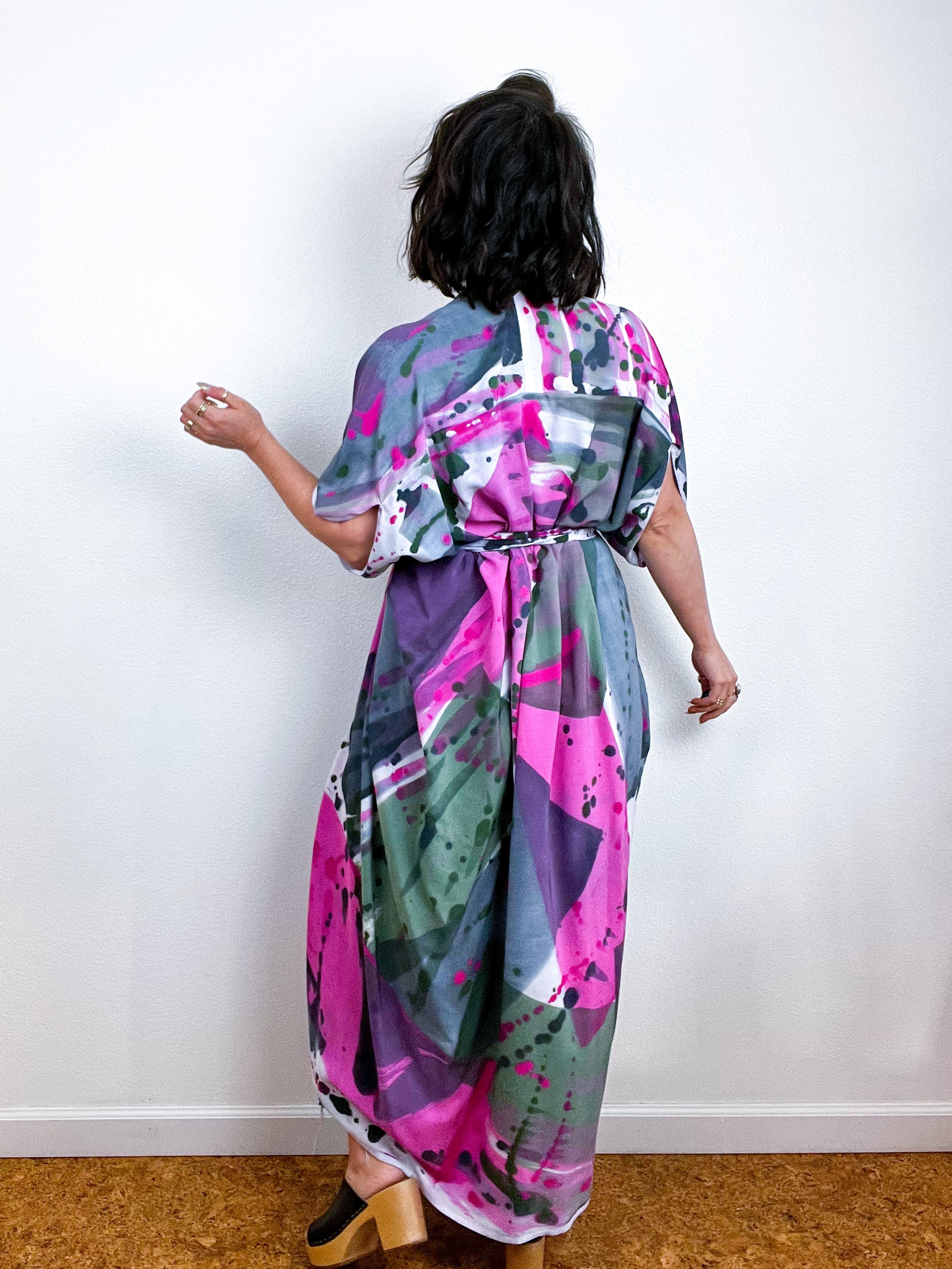 Soft and airy kimono with a flowing silhouette, tulip sleeve detail, curved high low hem and separate waist tie. Versatile shape can be styled as a wrap dress, an open kimono without the tie, or a robe for staying home. The minimalist design created from a full rectangle of fabric drapes beautifully over the shoulders and produces no material waste by utilizing one whole piece of fabric without scraps from corners and irregular cuts. Lightweight woven lilac fabric is hand-dyed with shades of pink, grey and olive algae thickened dye using a squeegee technique.