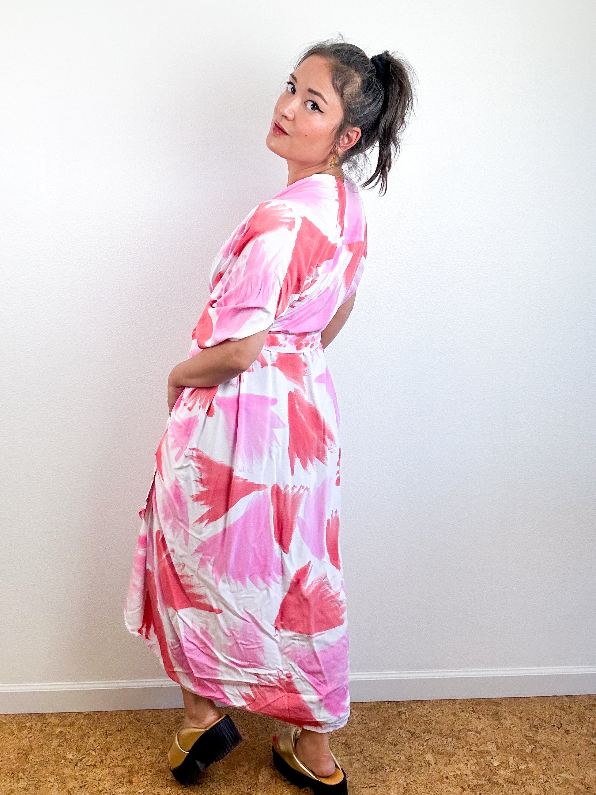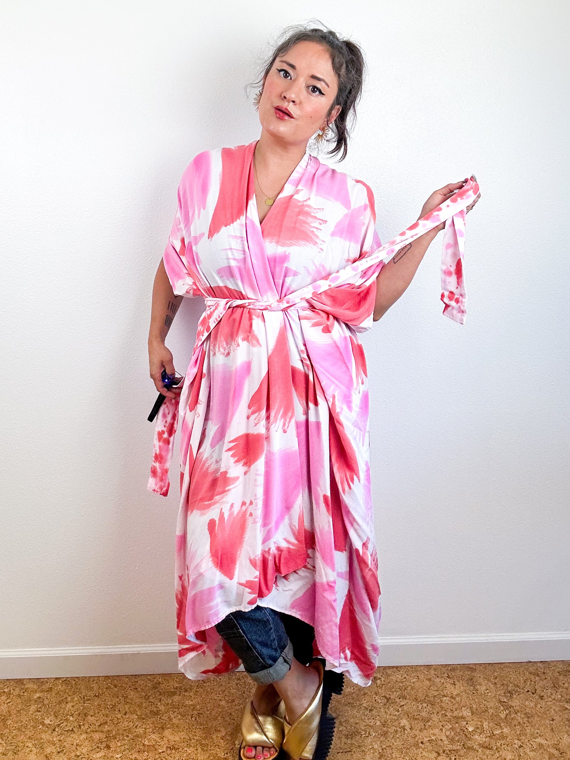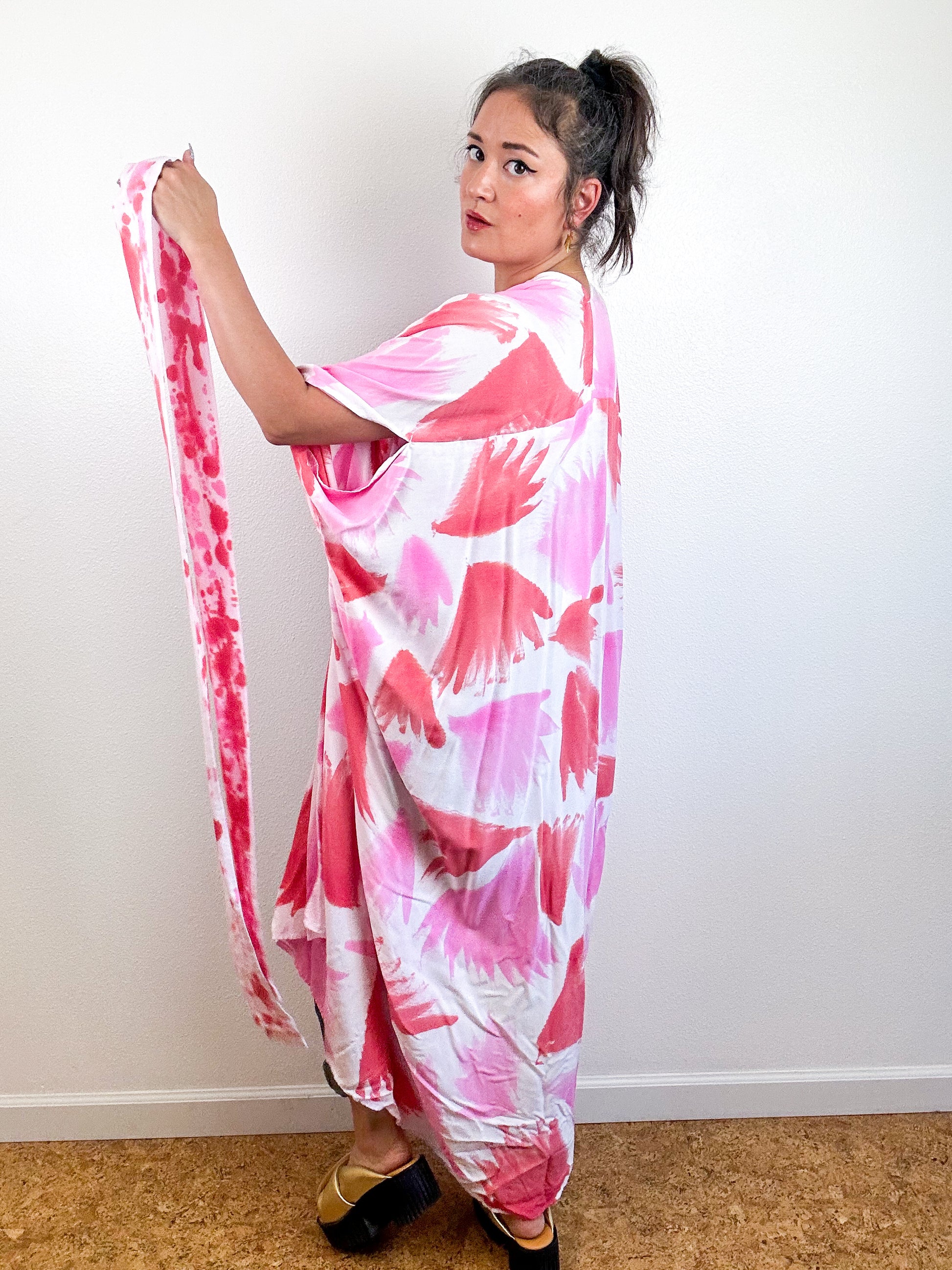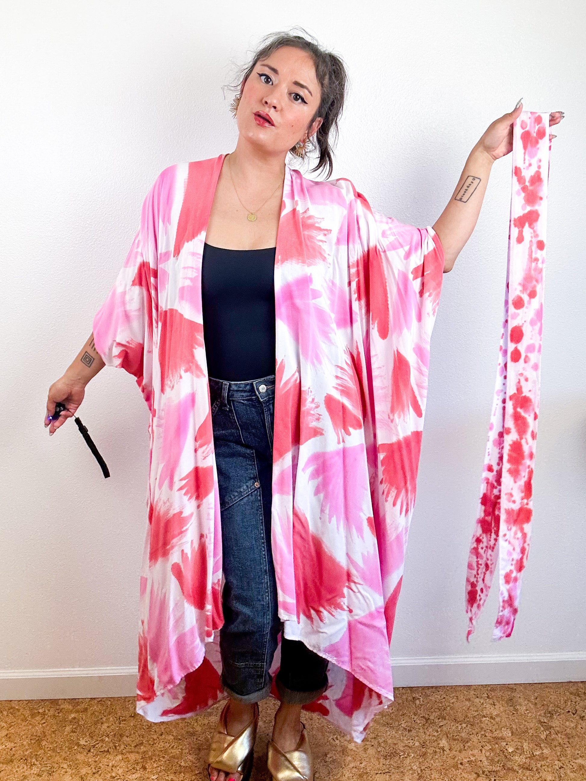 Hand-Dyed High Low Kimono Pink Scarlet Palms