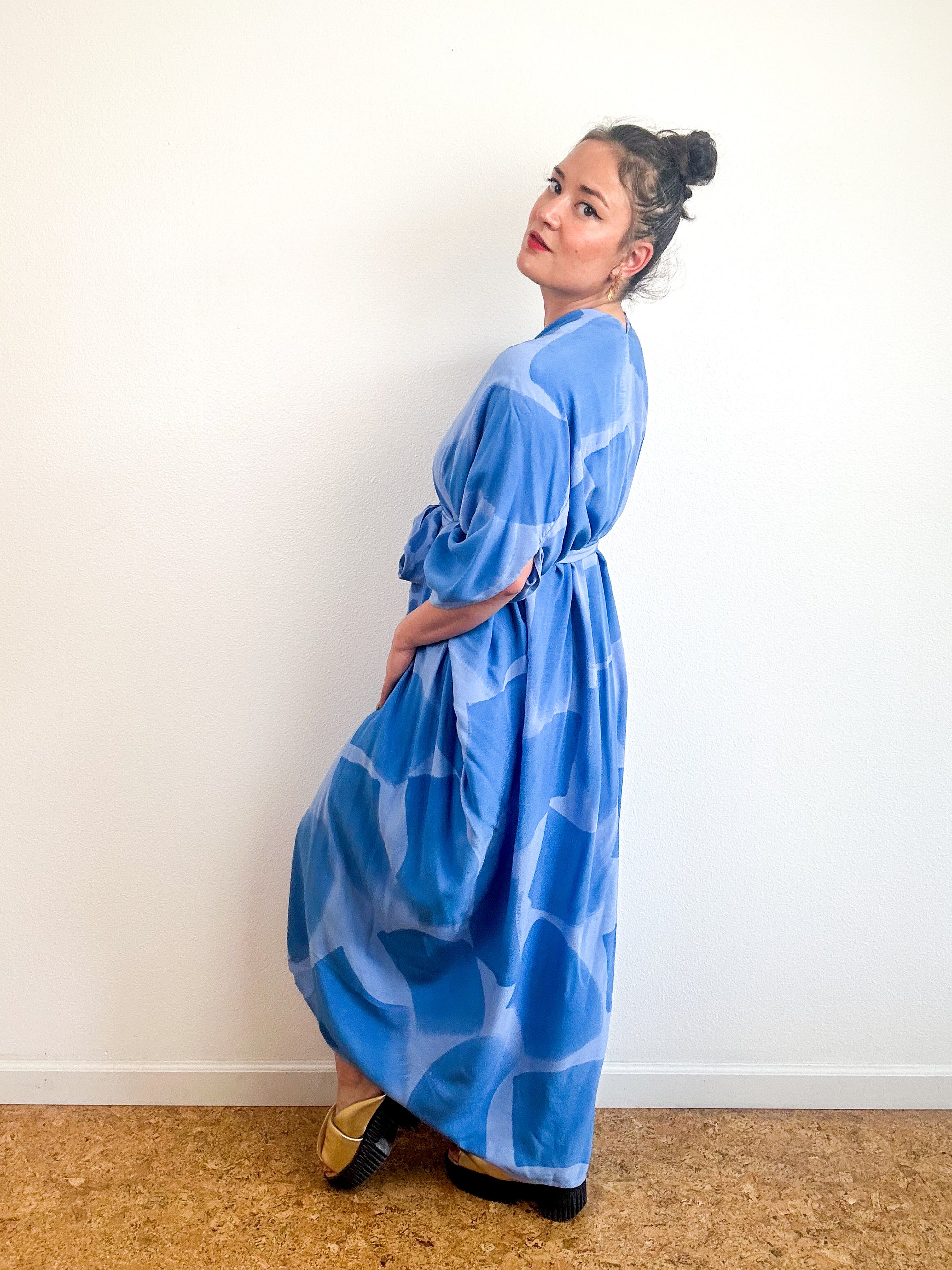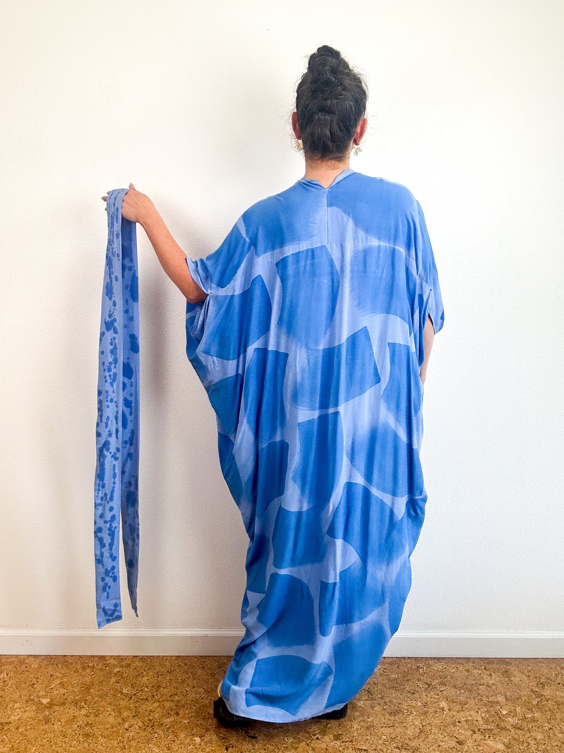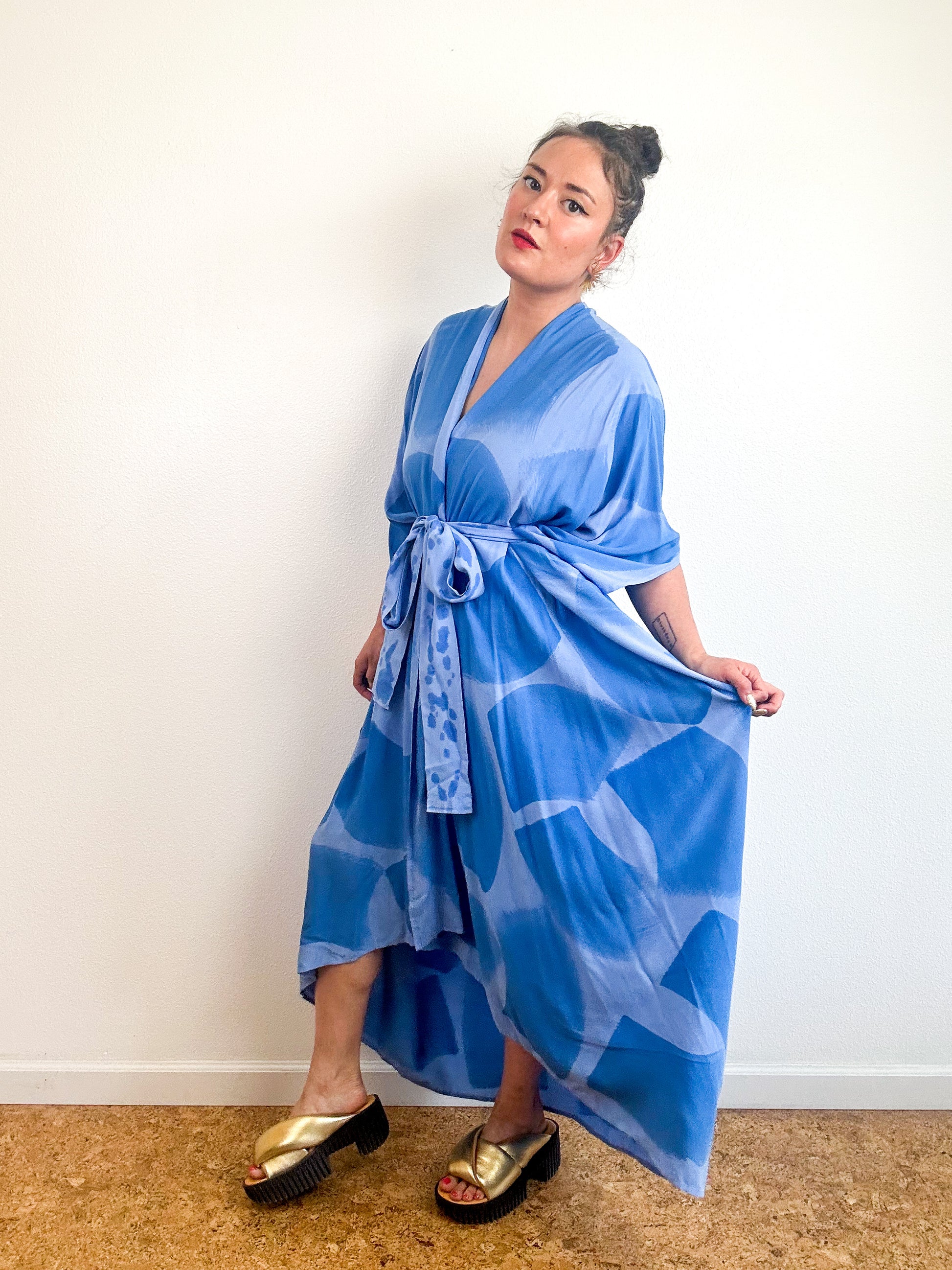 Soft and airy kimono with a flowing silhouette, tulip sleeve detail, curved high low hem and separate waist tie. Versatile shape can be styled as a wrap dress, an open kimono without the tie, or a robe for staying home. The minimalist design created from a full rectangle of fabric drapes beautifully over the shoulders and produces no material waste by utilizing one whole piece of fabric without scraps from corners and irregular cuts. Lightweight woven blue fabric is hand-dyed with sky blue algae thickened dye using a gestural brushstroke technique.