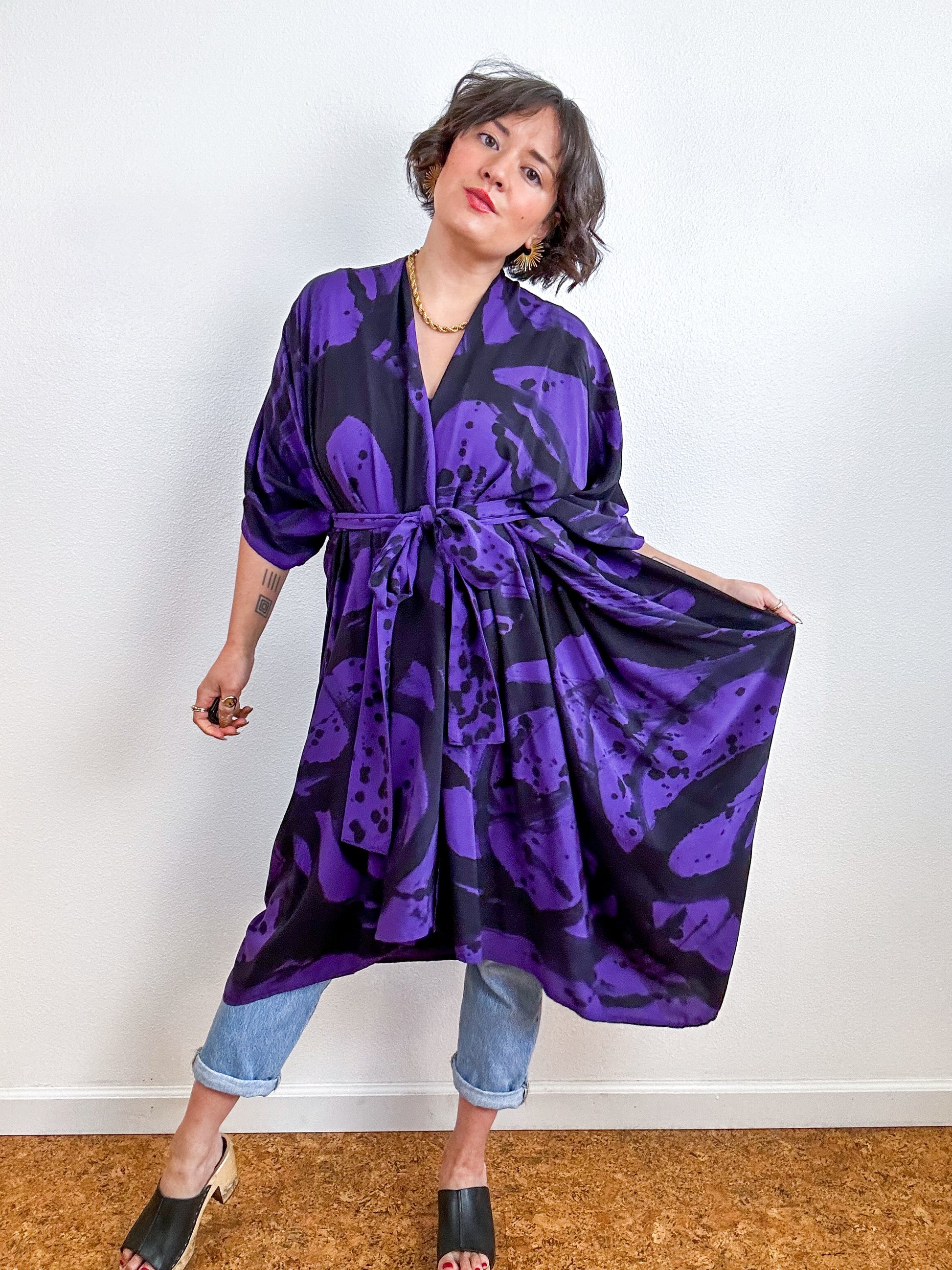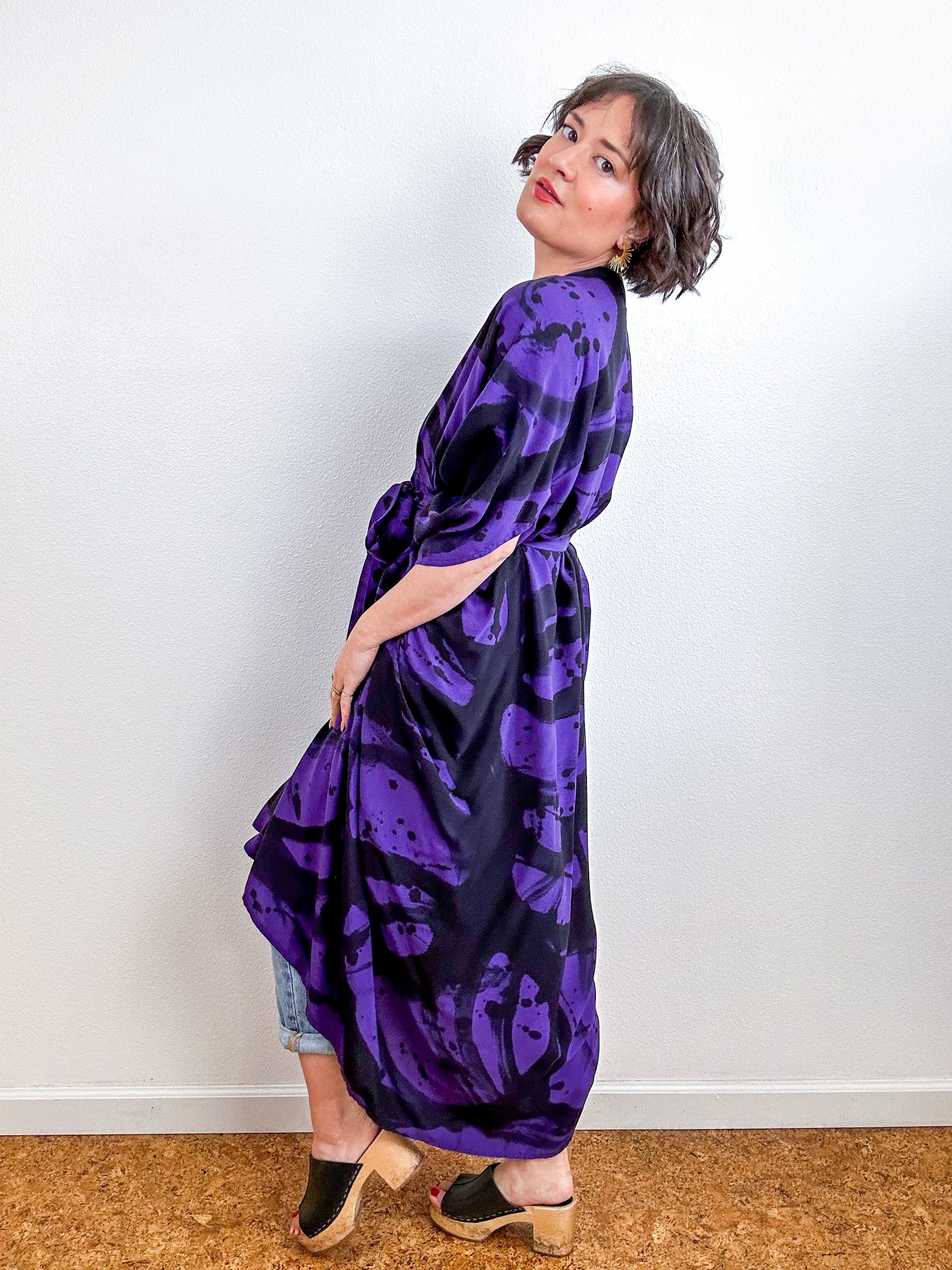 Soft and airy kimono with a flowing silhouette, tulip sleeve detail, curved high low hem and separate waist tie. Versatile shape can be styled as a wrap dress, an open kimono without the tie, or a robe for staying home. The minimalist design created from a full rectangle of fabric drapes beautifully over the shoulders and produces no material waste by utilizing one whole piece of fabric without scraps from corners and irregular cuts. Lightweight woven purple fabric is hand-dyed with black algae thickened dye using a gestural brushstroke technique.