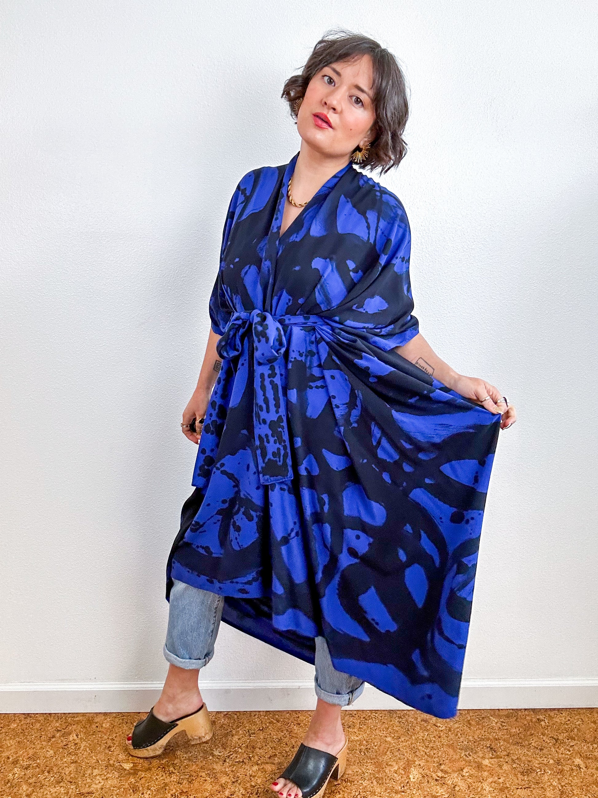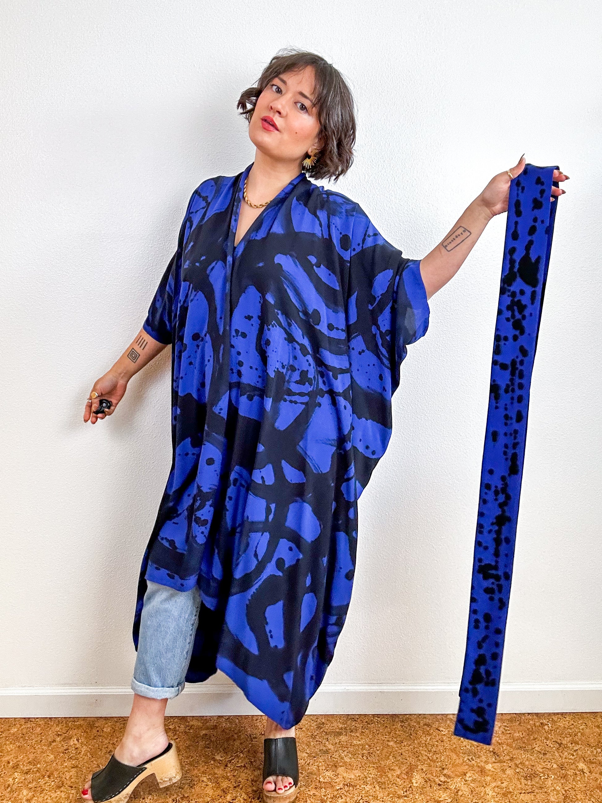 Soft and airy kimono with a flowing silhouette, tulip sleeve detail, curved high low hem and separate waist tie. Versatile shape can be styled as a wrap dress, an open kimono without the tie, or a robe for staying home. The minimalist design created from a full rectangle of fabric drapes beautifully over the shoulders and produces no material waste by utilizing one whole piece of fabric without scraps from corners and irregular cuts. Lightweight woven royal blue fabric is hand-dyed with black algae thickened dye using a gestural brushstroke technique.