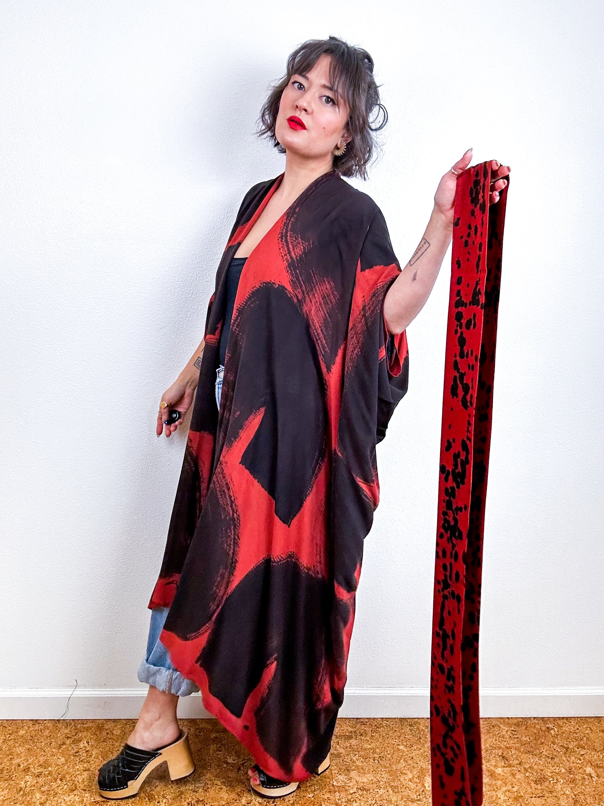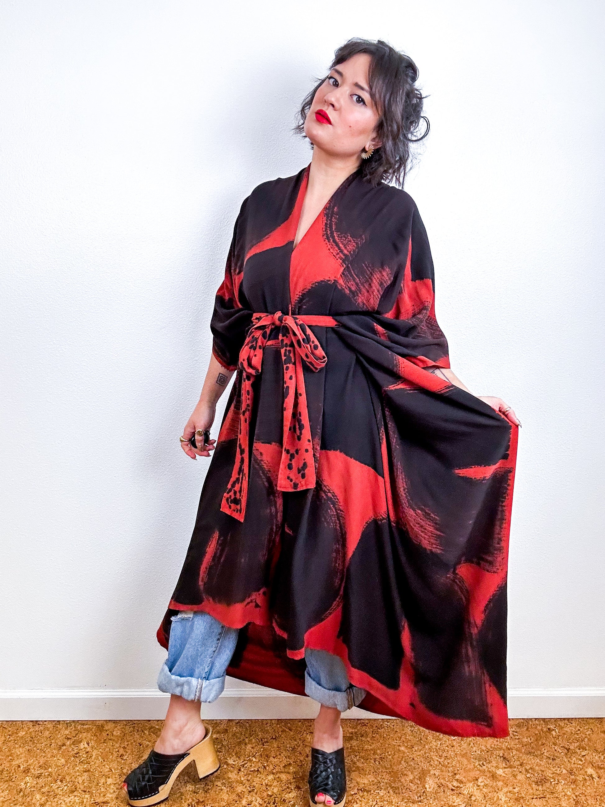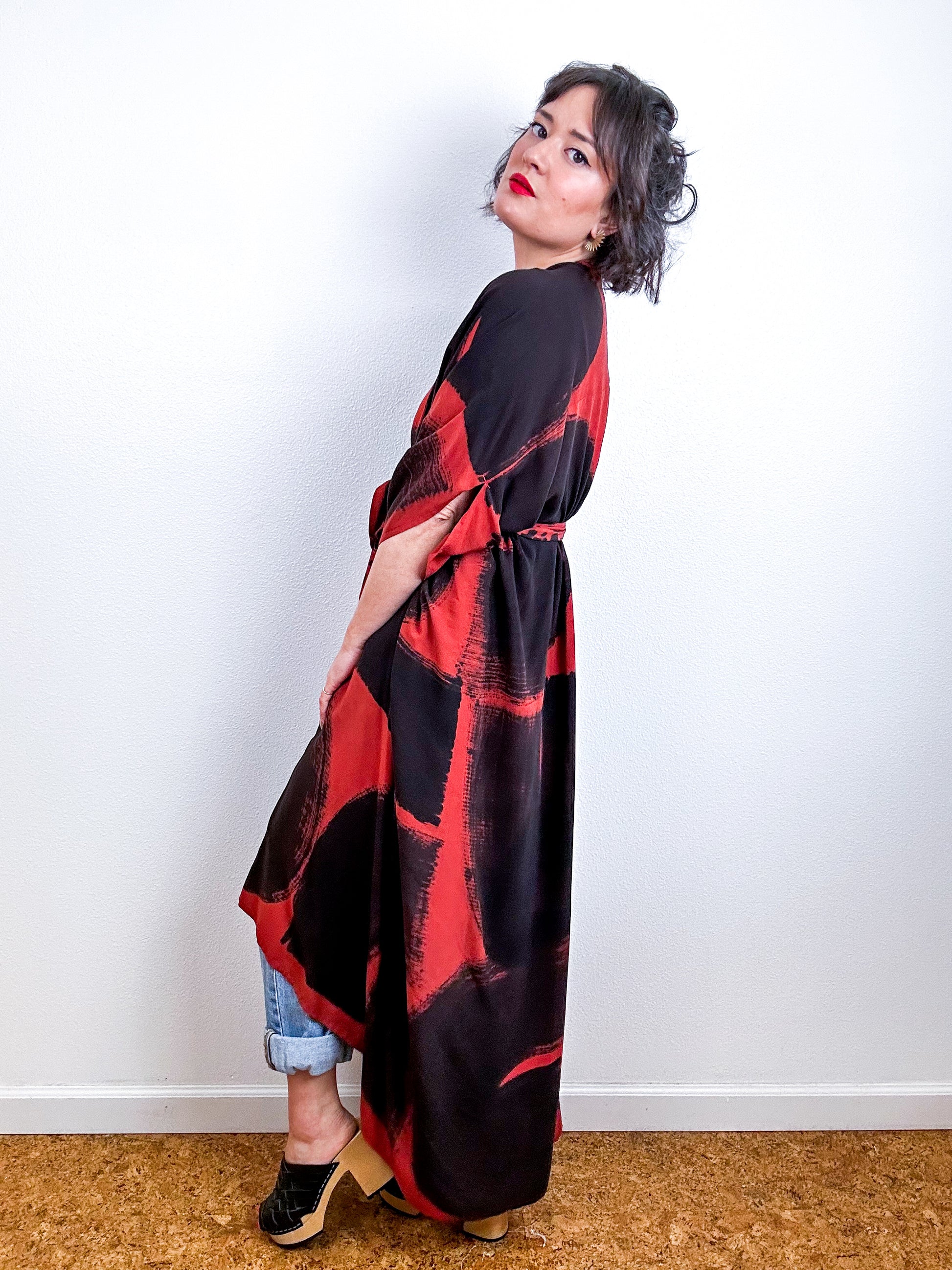 Soft and airy kimono with a flowing silhouette, tulip sleeve detail, curved high low hem and separate waist tie. Versatile shape can be styled as a wrap dress, an open kimono without the tie, or a robe for staying home. The minimalist design created from a full rectangle of fabric drapes beautifully over the shoulders and produces no material waste by utilizing one whole piece of fabric without scraps from corners and irregular cuts. Lightweight woven rust fabric is hand-dyed with black algae thickened dye using a gestural brushstroke technique.