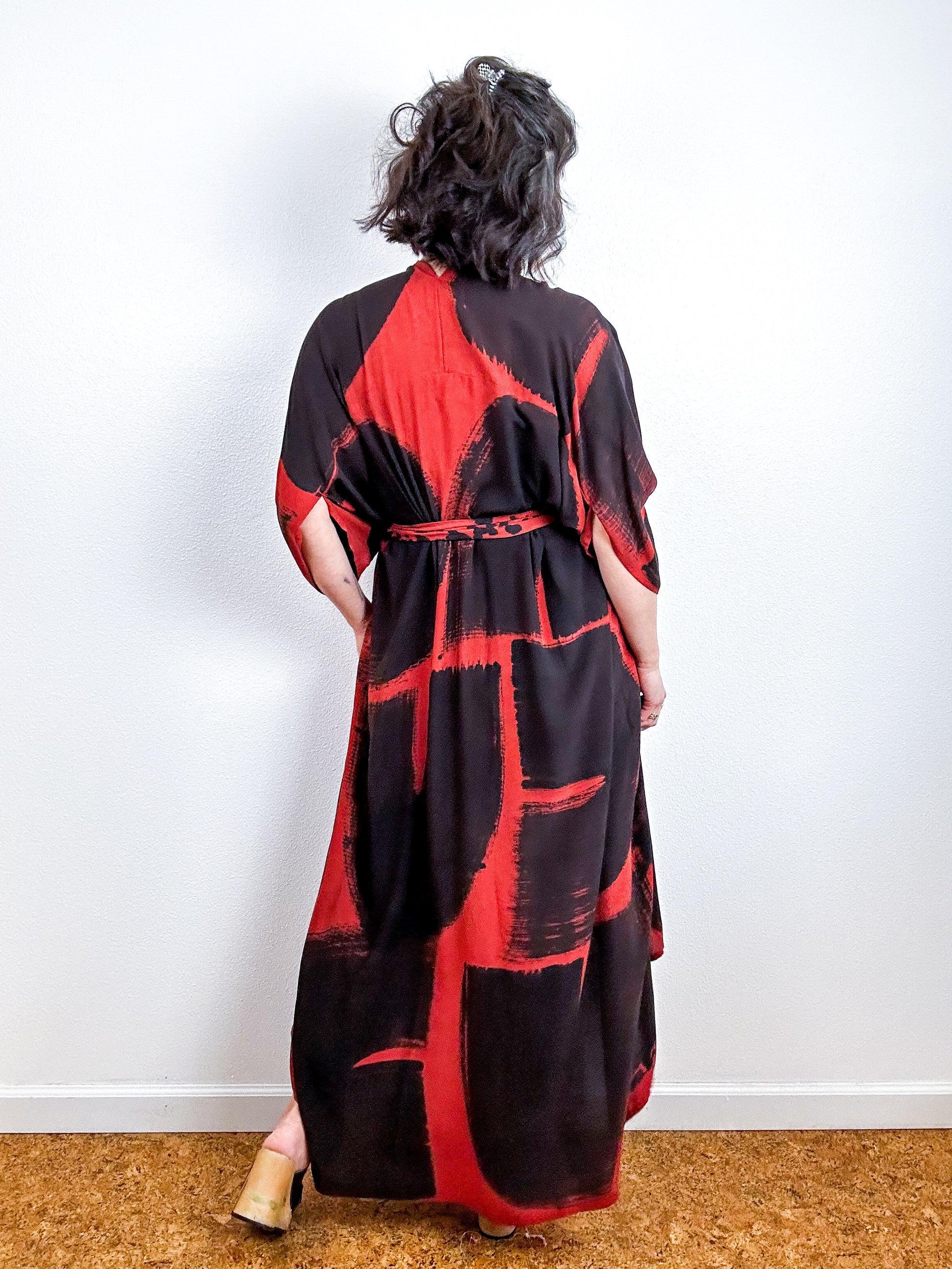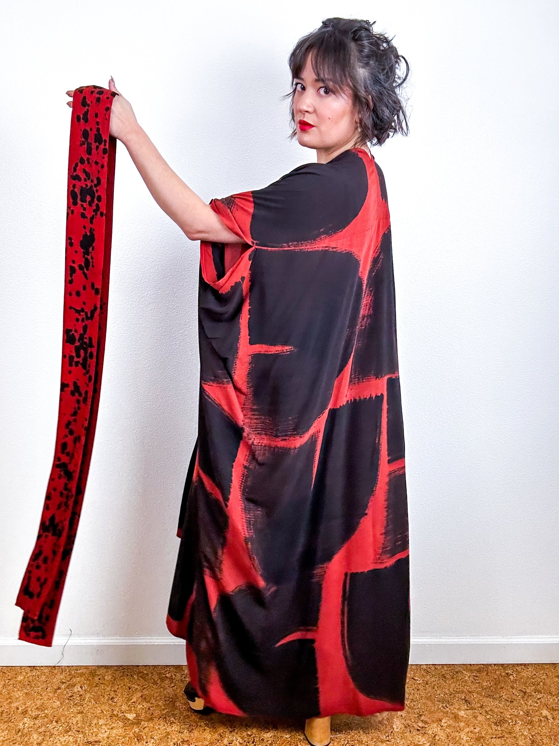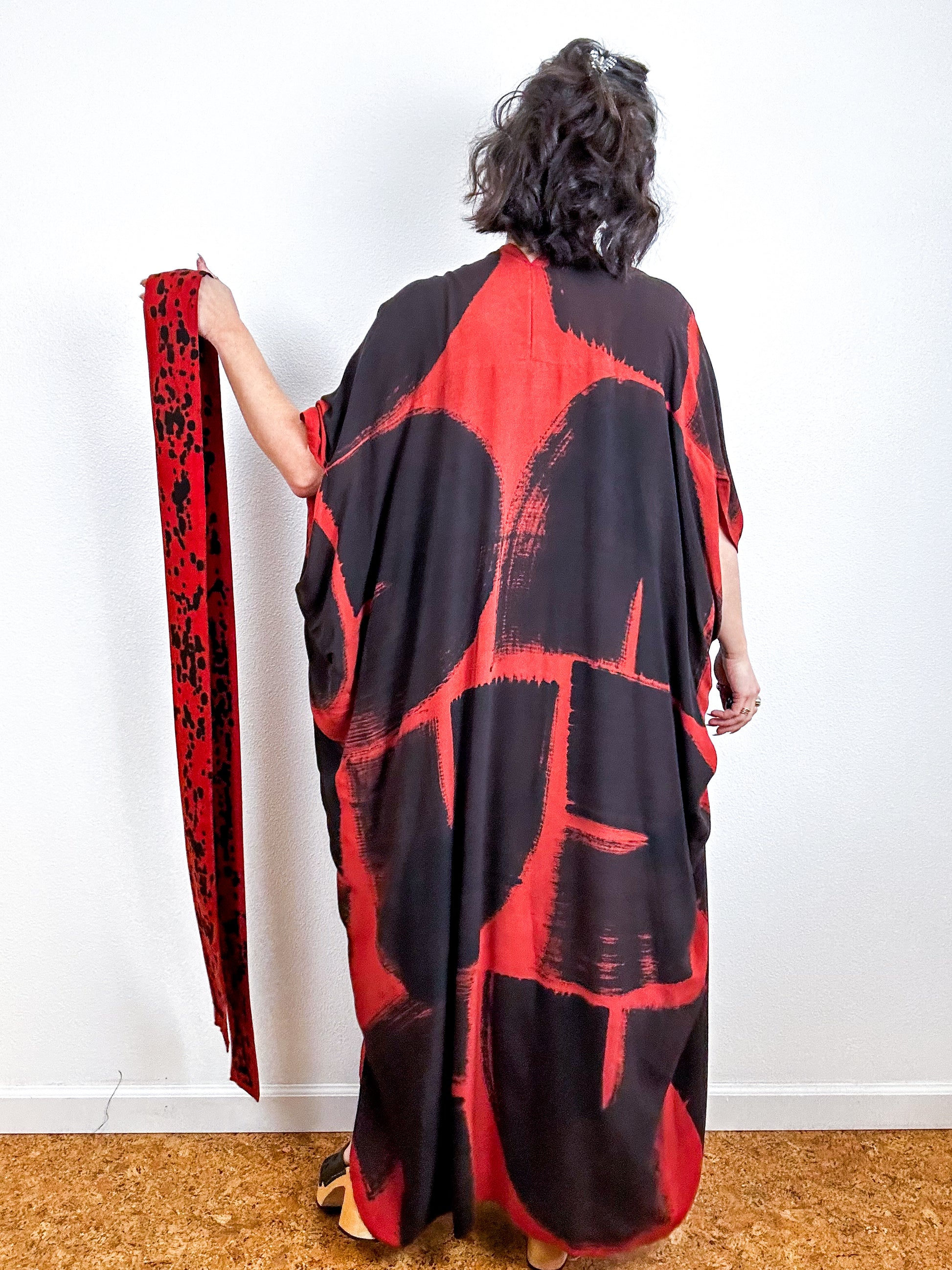 Soft and airy kimono with a flowing silhouette, tulip sleeve detail, curved high low hem and separate waist tie. Versatile shape can be styled as a wrap dress, an open kimono without the tie, or a robe for staying home. The minimalist design created from a full rectangle of fabric drapes beautifully over the shoulders and produces no material waste by utilizing one whole piece of fabric without scraps from corners and irregular cuts. Lightweight woven rust fabric is hand-dyed with black algae thickened dye using a gestural brushstroke technique.