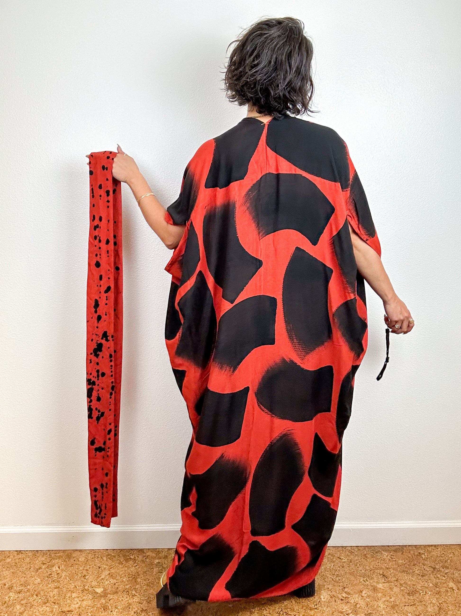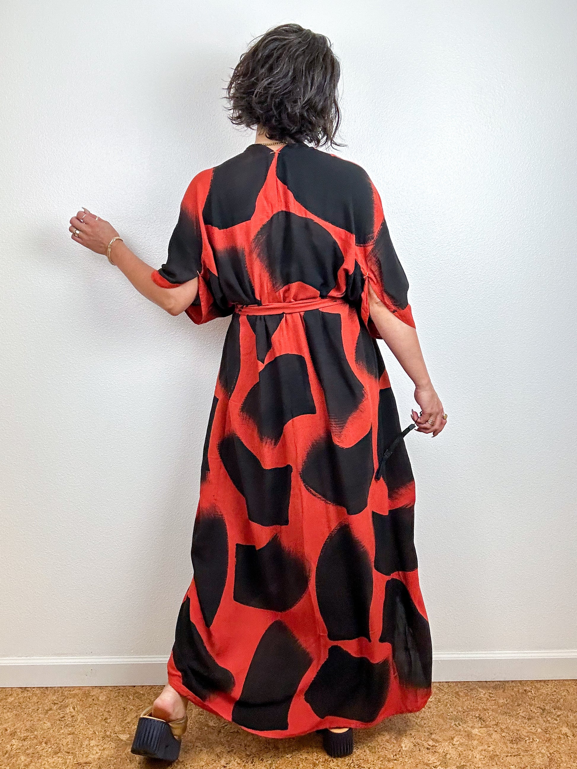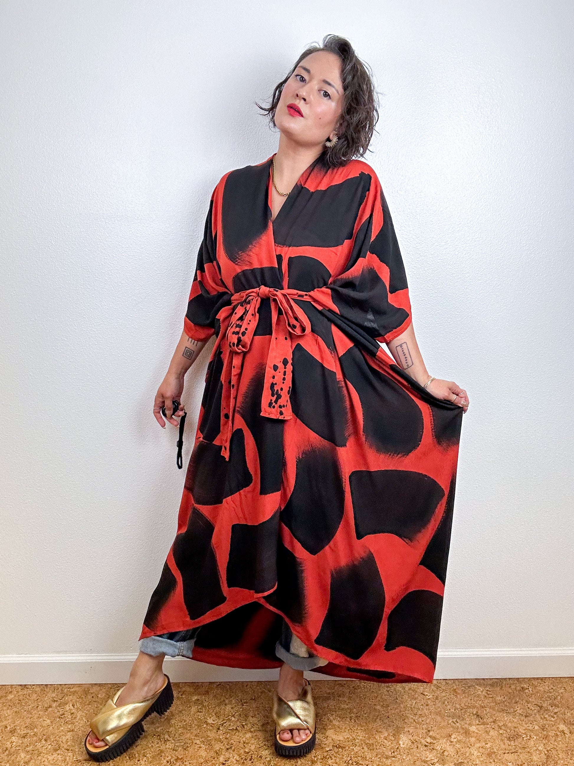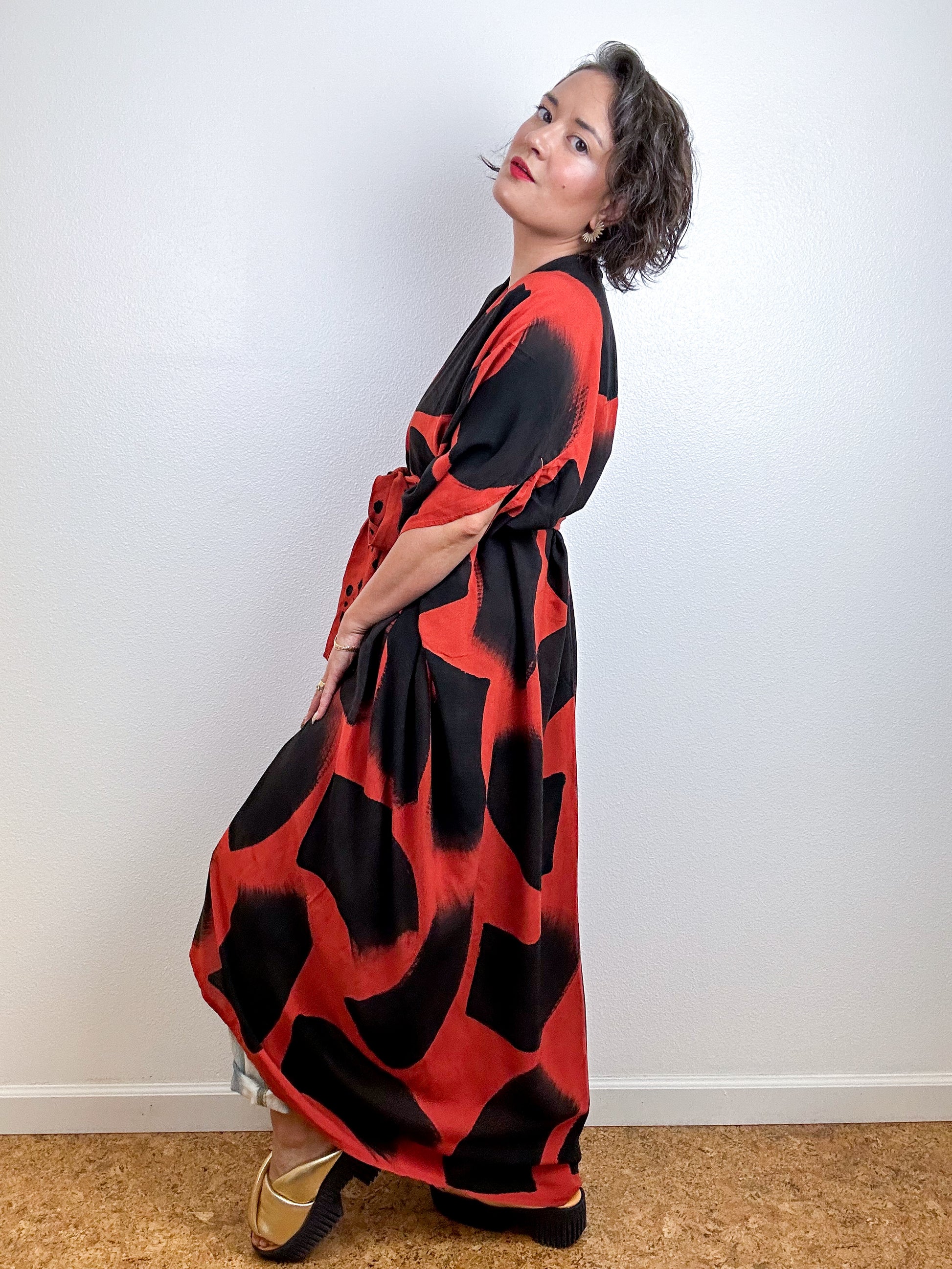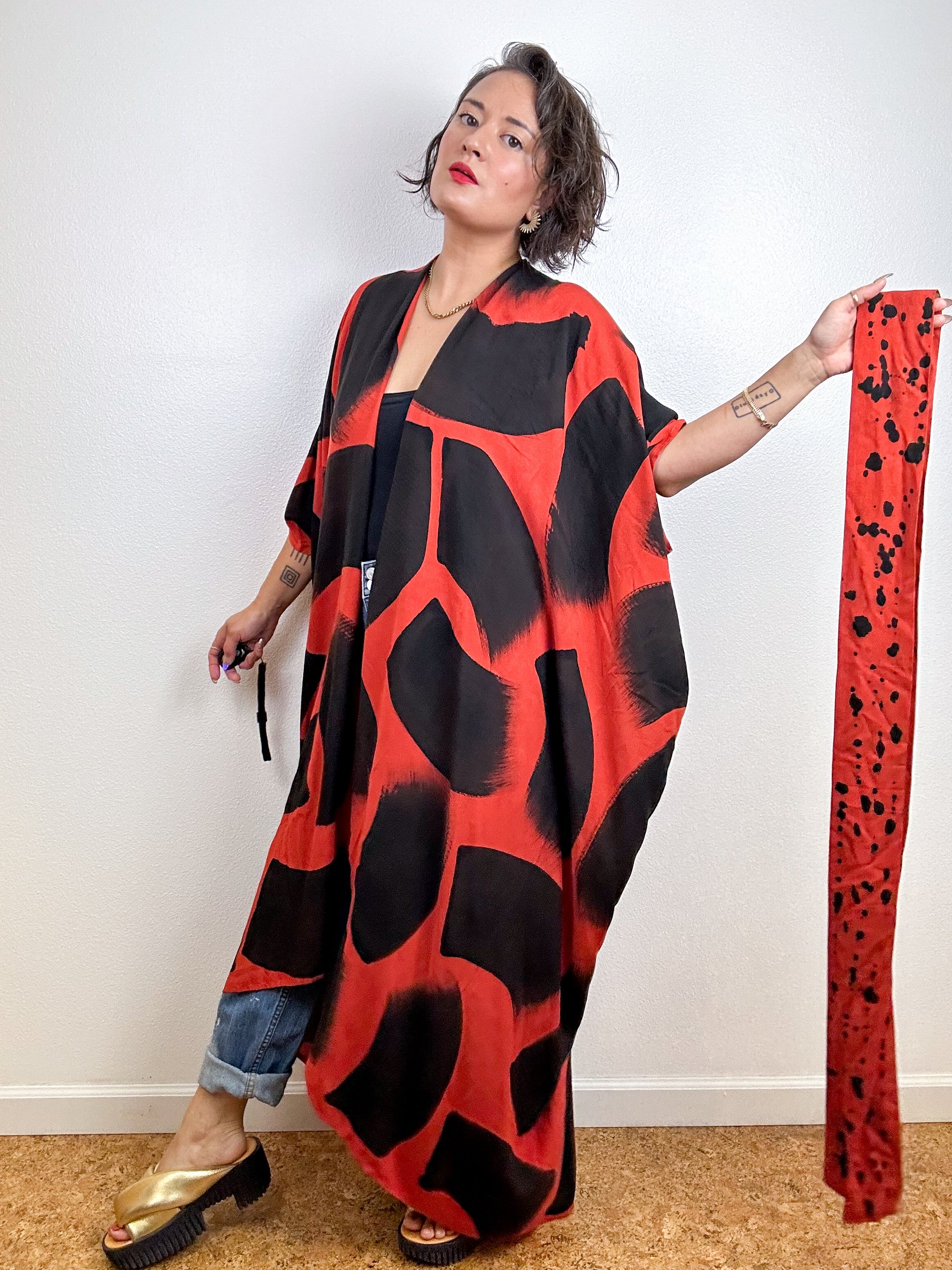 Soft and airy kimono with a flowing silhouette, tulip sleeve detail, curved high low hem and separate waist tie. Versatile shape can be styled as a wrap dress, an open kimono without the tie, or a robe for staying home. The minimalist design created from a full rectangle of fabric drapes beautifully over the shoulders and produces no material waste by utilizing one whole piece of fabric without scraps from corners and irregular cuts. Lightweight woven rust red fabric is hand-dyed with black algae thickened dye using a gestural brushstroke technique.