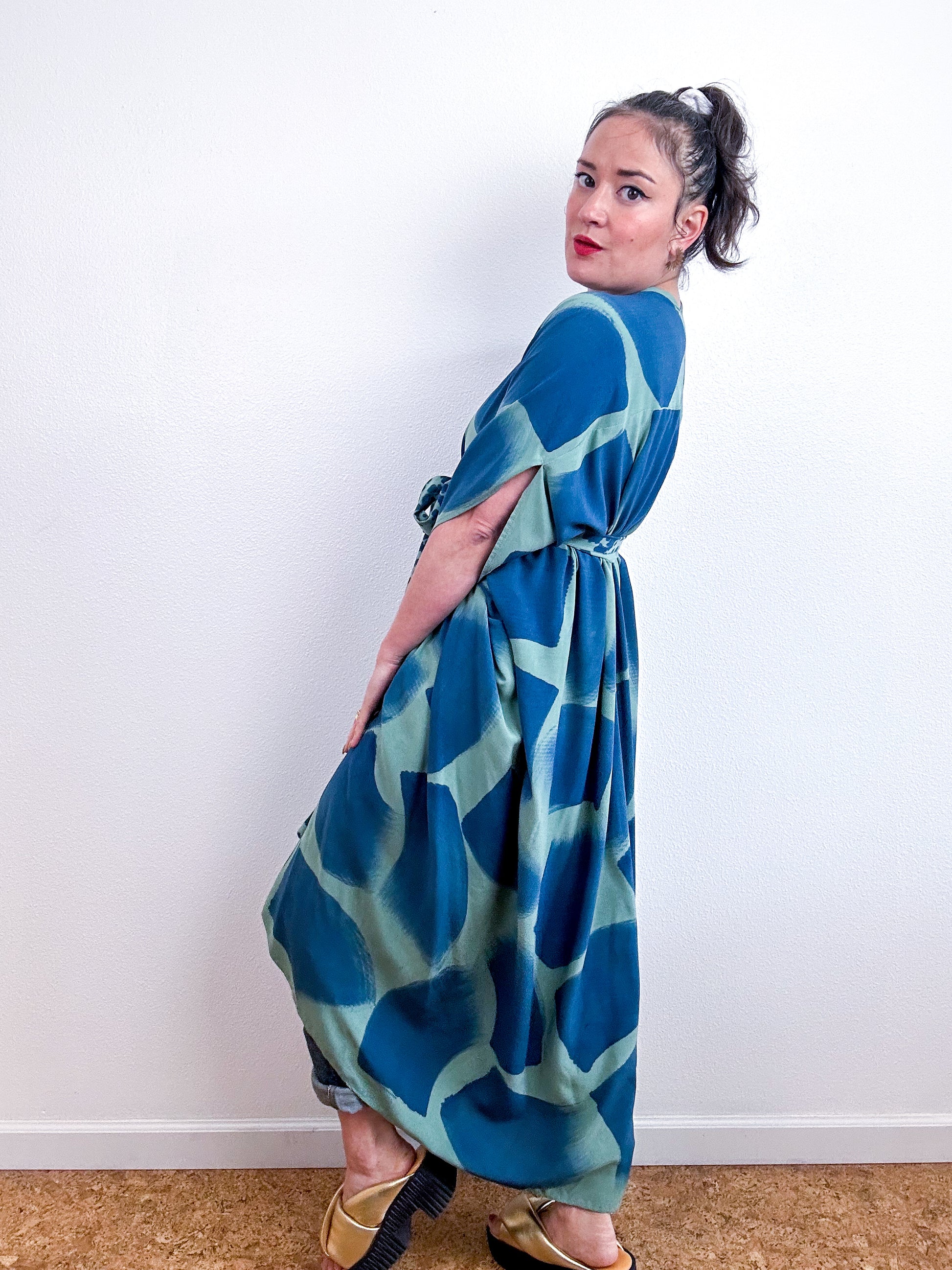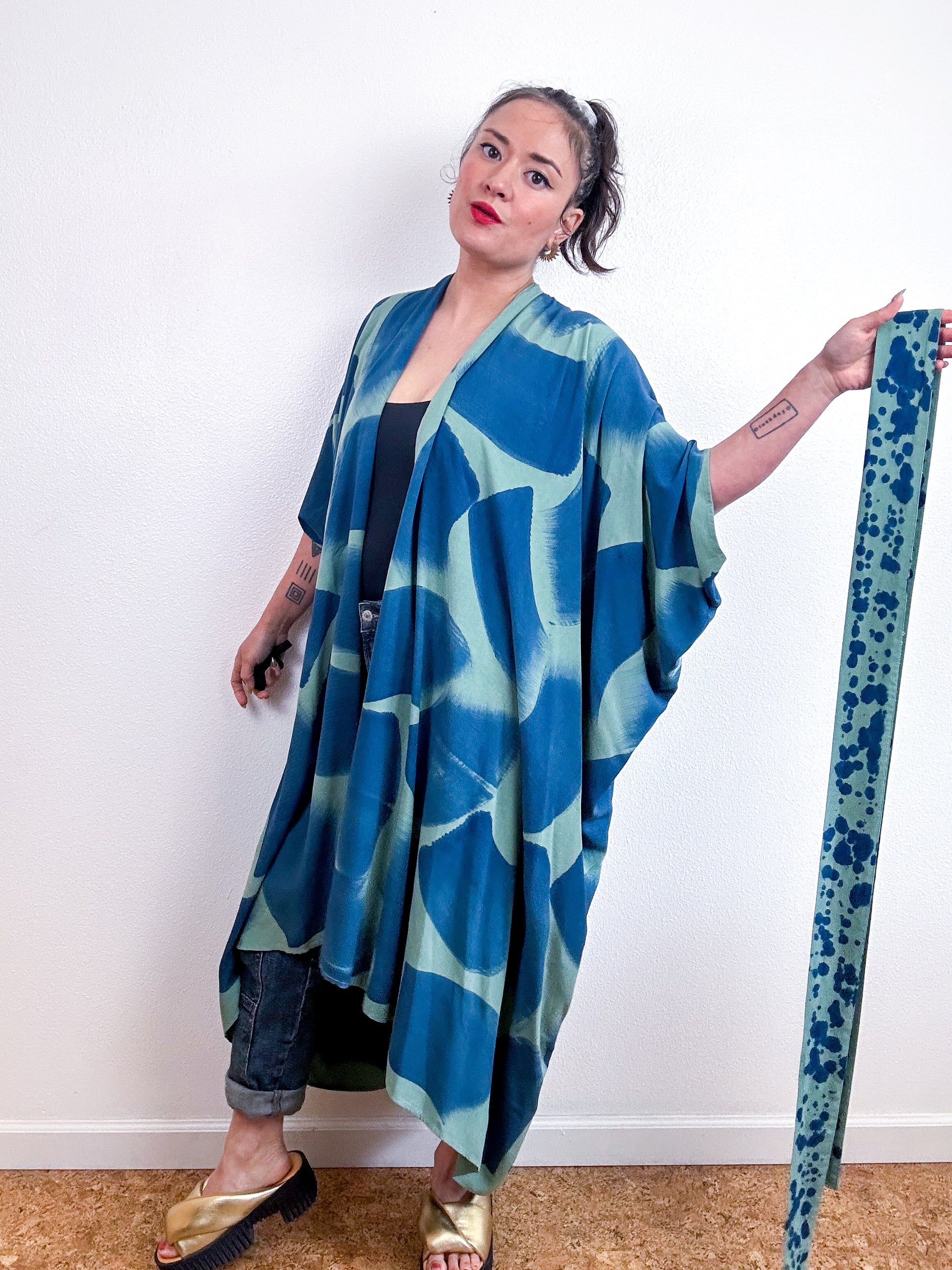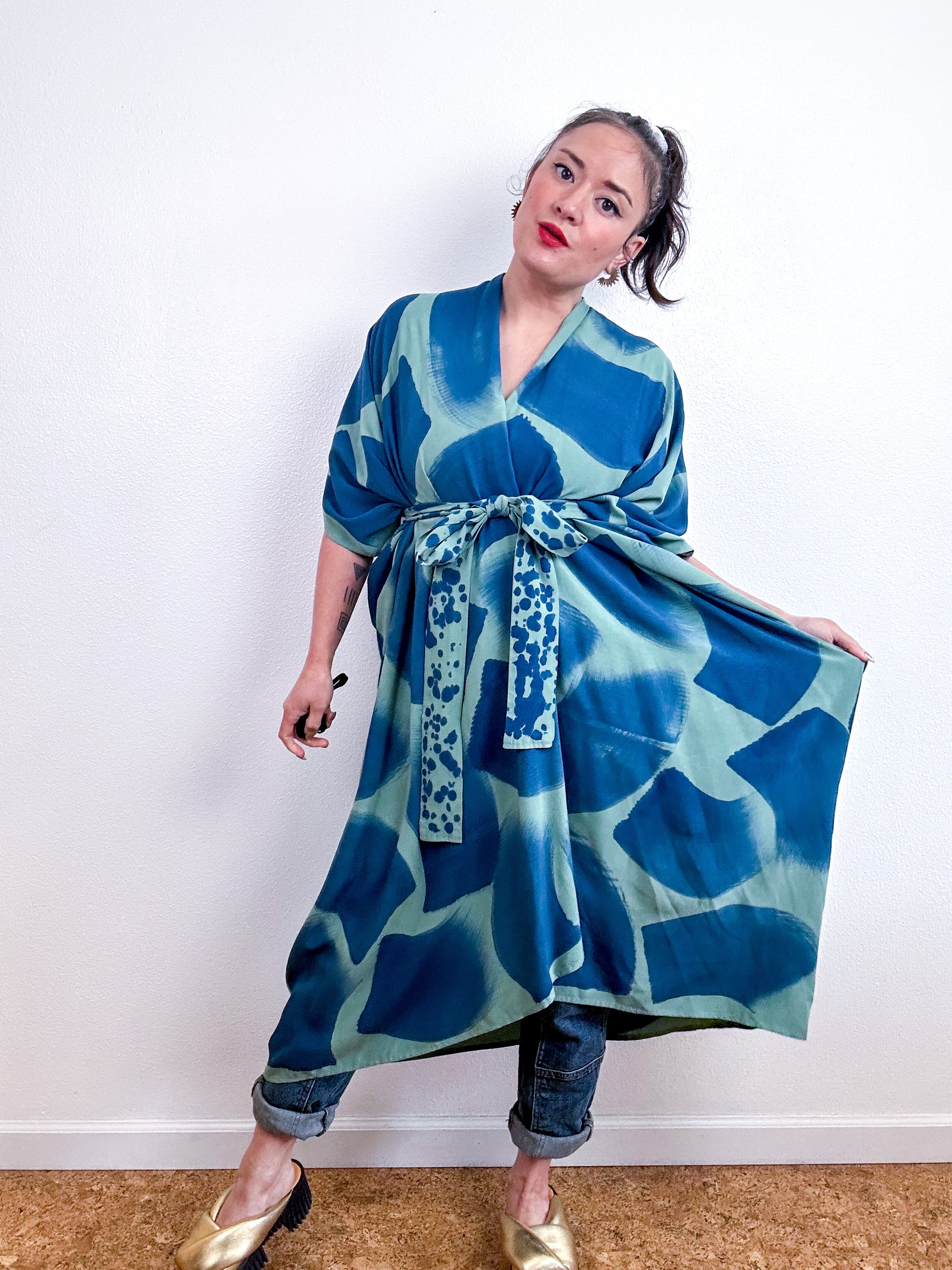 Hand-Dyed High Low Kimono Sage Indigo Brush