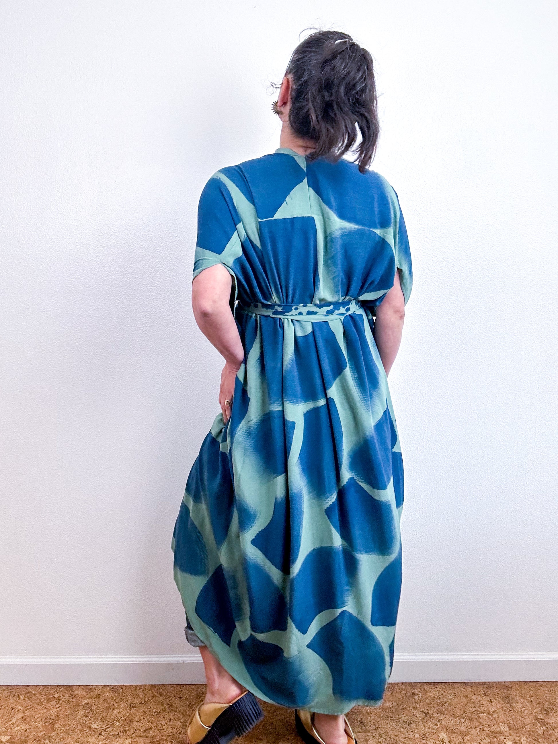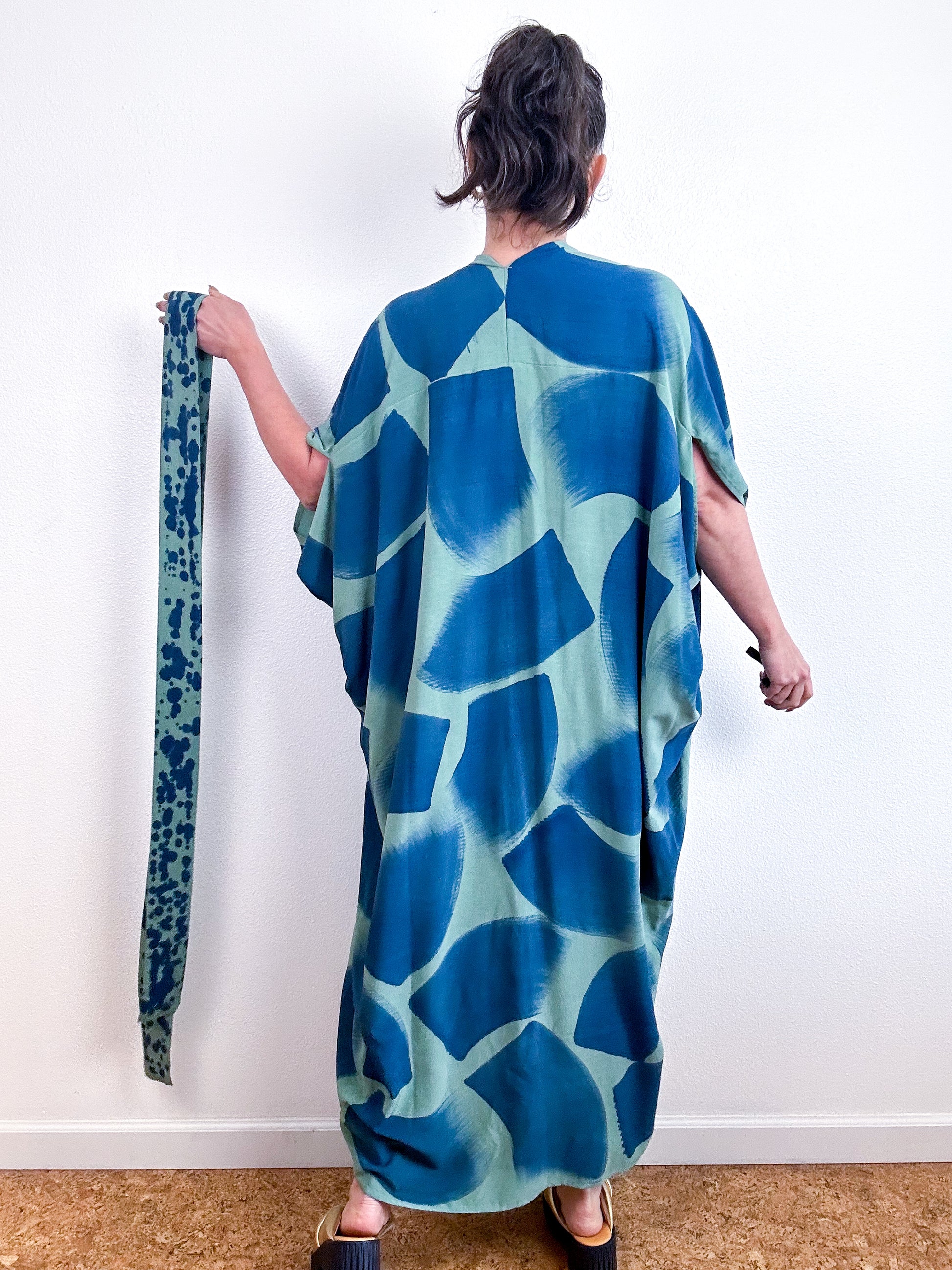 Soft and airy kimono with a flowing silhouette, tulip sleeve detail, curved high low hem and separate waist tie. Versatile shape can be styled as a wrap dress, an open kimono without the tie, or a robe for staying home. The minimalist design created from a full rectangle of fabric drapes beautifully over the shoulders and produces no material waste by utilizing one whole piece of fabric without scraps from corners and irregular cuts. Lightweight woven sage green fabric is hand-dyed with blue algae thickened dye using a gestural brushstroke technique.