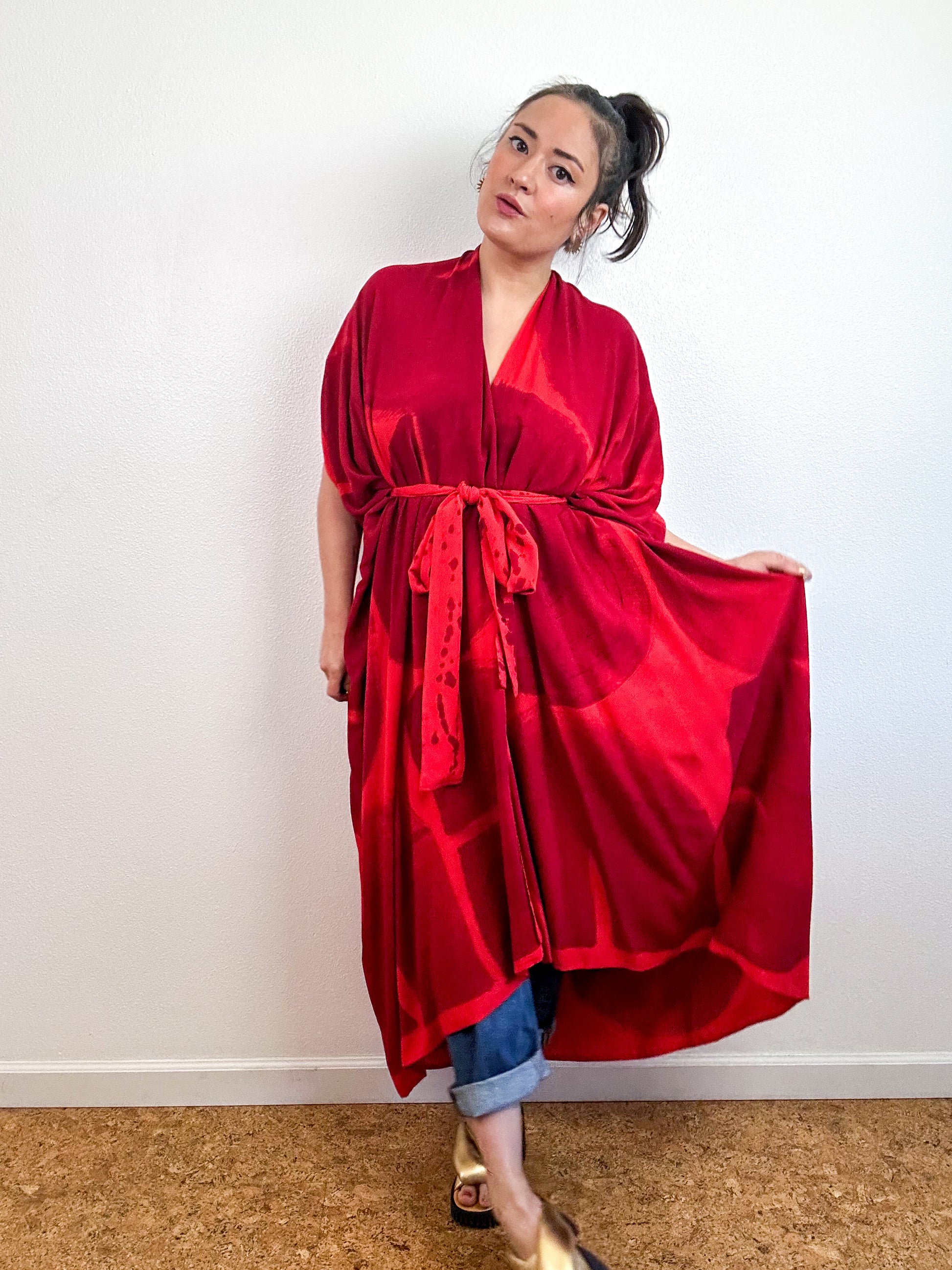 Soft and airy kimono with a flowing silhouette, tulip sleeve detail, curved high low hem and separate waist tie. Versatile shape can be styled as a wrap dress, an open kimono without the tie, or a robe for staying home. The minimalist design created from a full rectangle of fabric drapes beautifully over the shoulders and produces no material waste by utilizing one whole piece of fabric without scraps from corners and irregular cuts. Lightweight woven scarlet red fabric is hand-dyed with maroon algae thickened dye using a gestural brushstroke technique.