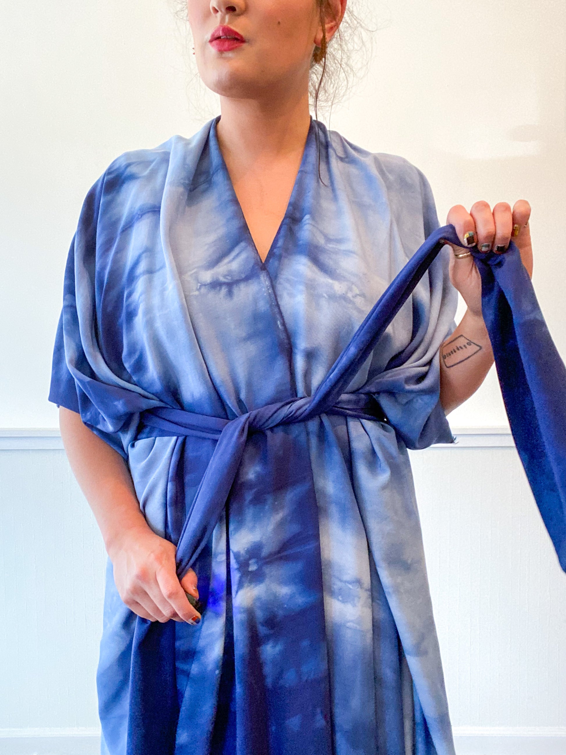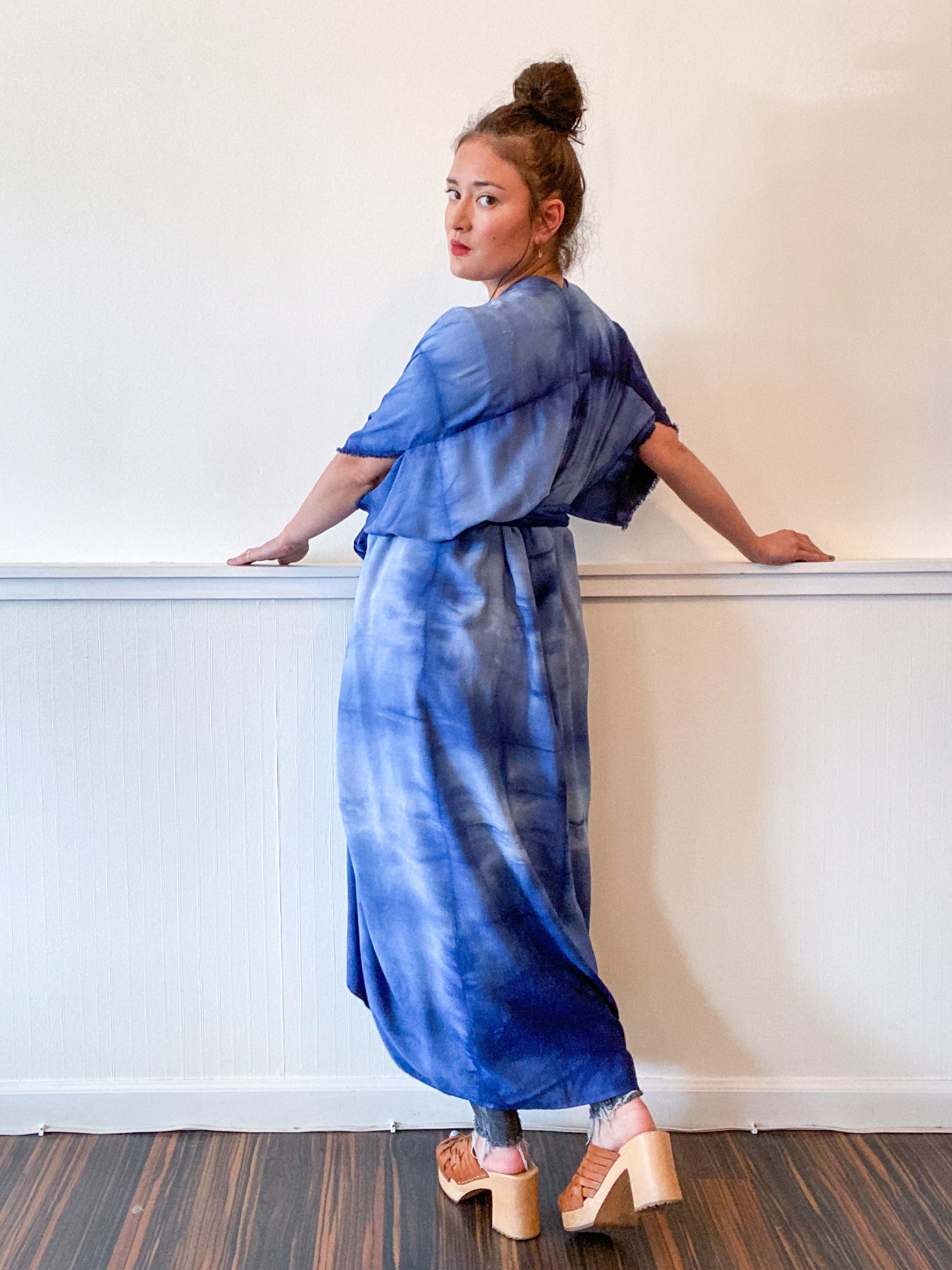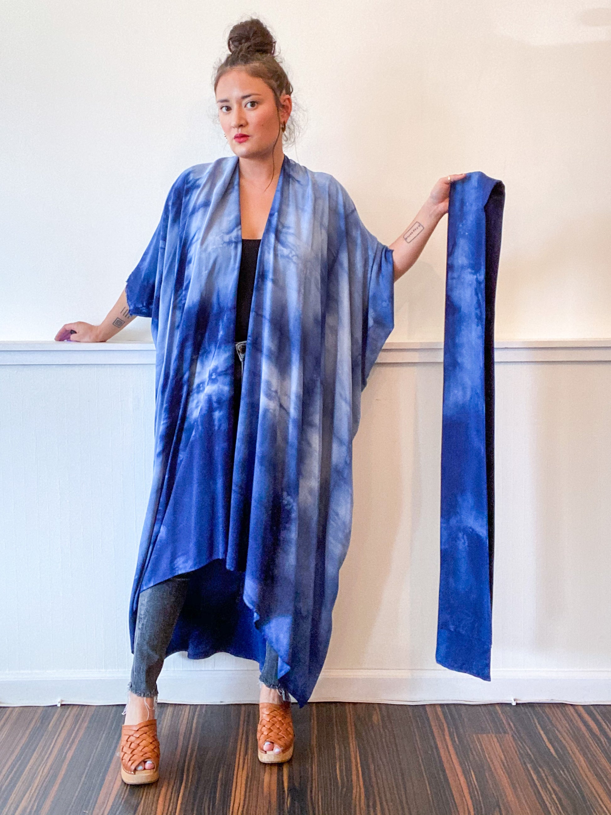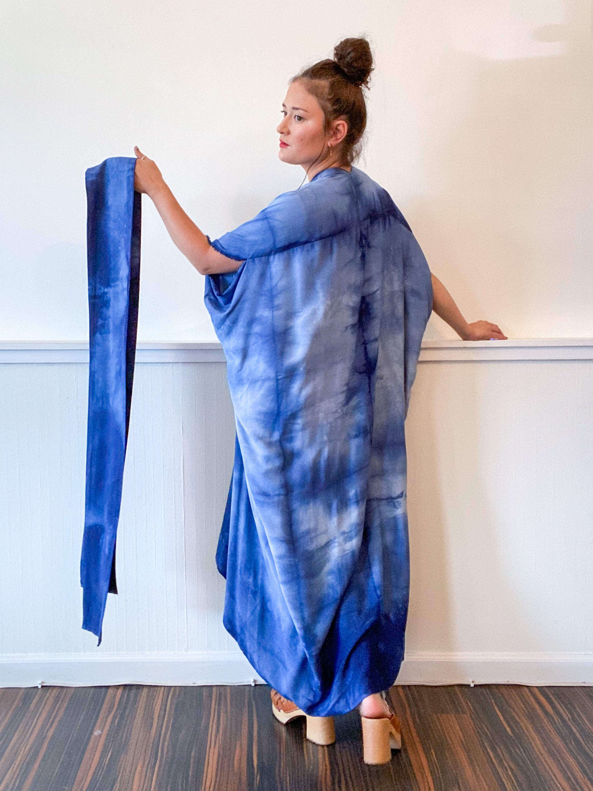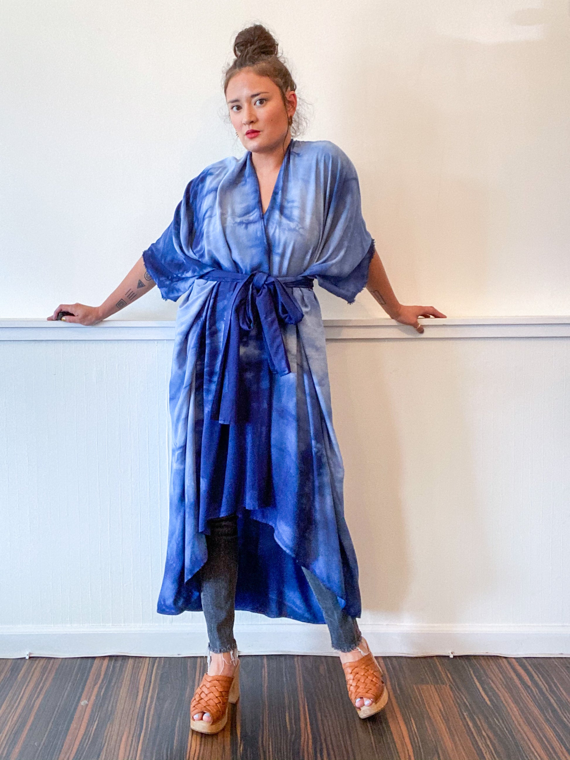 Soft and airy kimono with a flowing silhouette, fringed selvage sleeve detail, curved high low hem and optional waist tie. Versatile shape can be styled as a wrap dress, lightweight jacket over jeans, or an elegant robe over lingerie. The minimalist design created from a full rectangle of fabric drapes beautifully over the shoulders and produces no material waste by utilizing one whole piece of fabric without scraps from corners and irregular cuts. Lightweight woven fabric is hand-dyed in a classic blue with a subtle low water shibori technique.