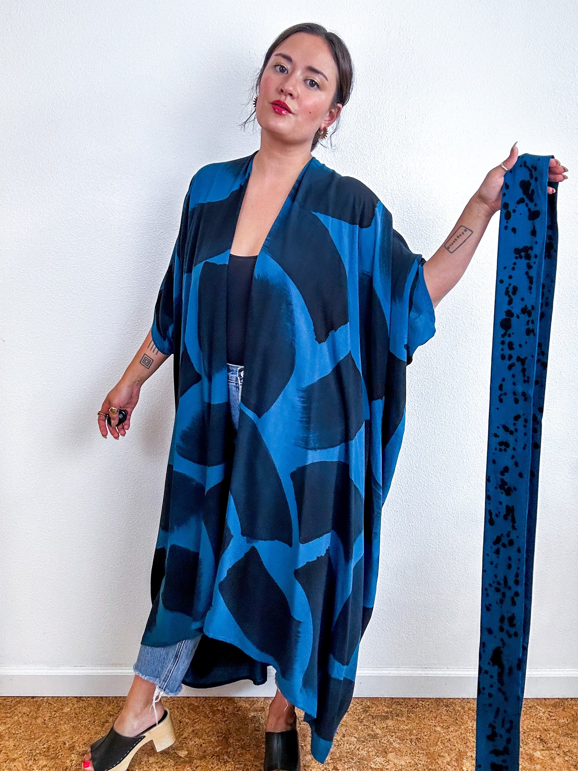 Soft and airy kimono with a flowing silhouette, tulip sleeve detail, curved high low hem and separate waist tie. Versatile shape can be styled as a wrap dress, an open kimono without the tie, or a robe for staying home. The minimalist design created from a full rectangle of fabric drapes beautifully over the shoulders and produces no material waste by utilizing one whole piece of fabric without scraps from corners and irregular cuts. Lightweight woven bright teal fabric is hand-dyed with black algae thickened dye using a gestural brushstroke technique.