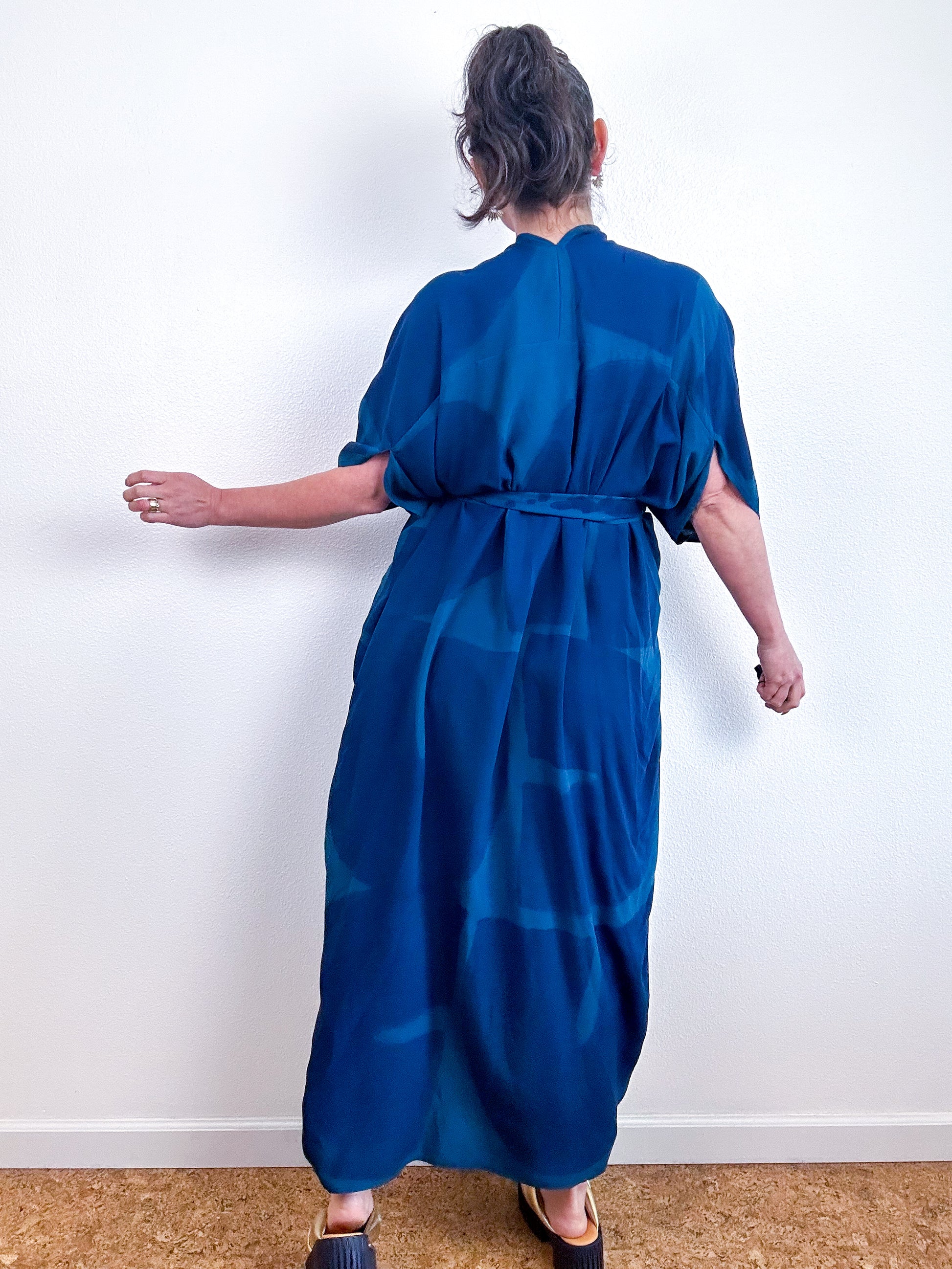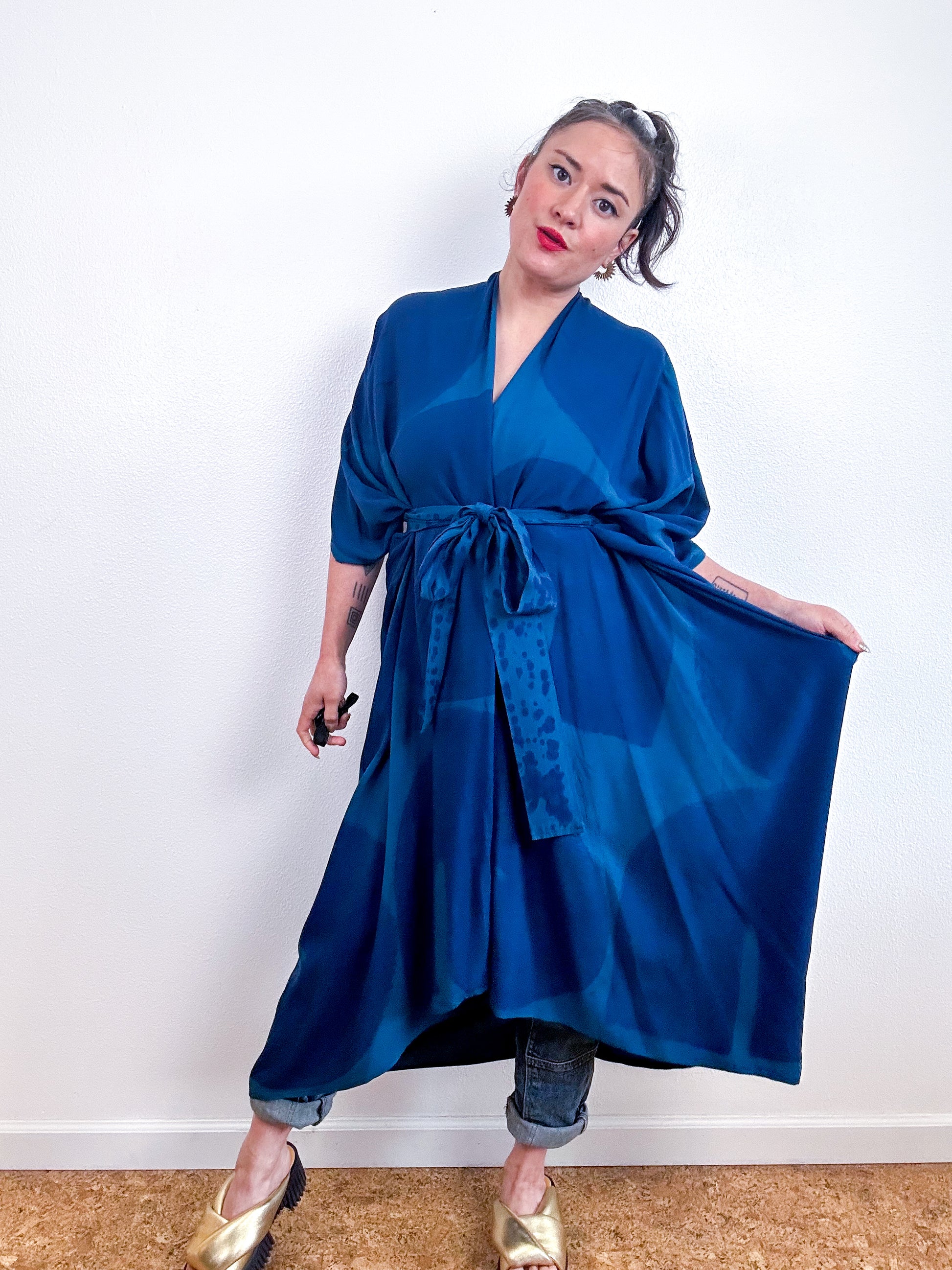 Soft and airy kimono with a flowing silhouette, tulip sleeve detail, curved high low hem and separate waist tie. Versatile shape can be styled as a wrap dress, an open kimono without the tie, or a robe for staying home. The minimalist design created from a full rectangle of fabric drapes beautifully over the shoulders and produces no material waste by utilizing one whole piece of fabric without scraps from corners and irregular cuts. Lightweight woven teal fabric is hand-dyed with blue algae thickened dye using a gestural brushstroke technique.