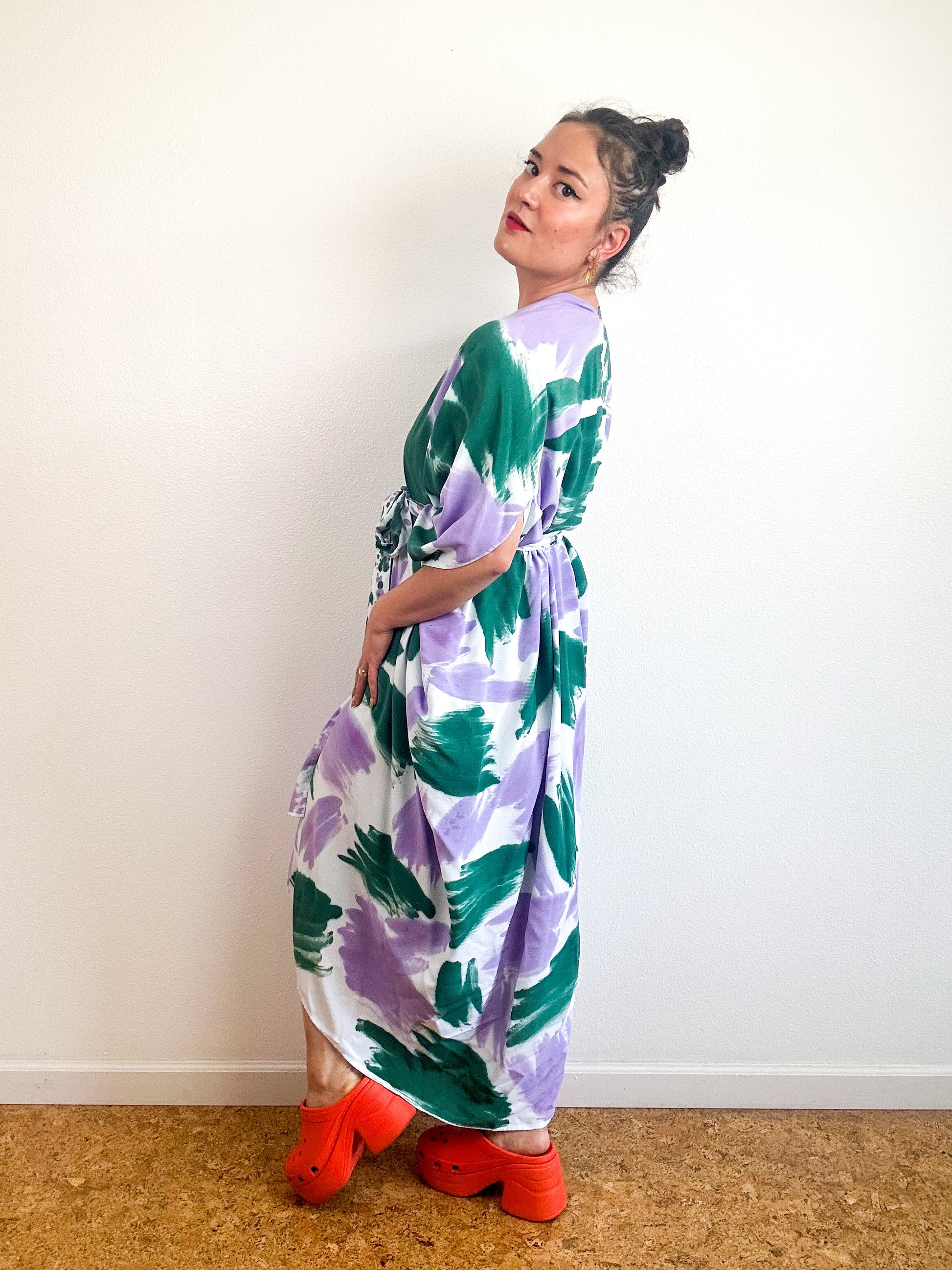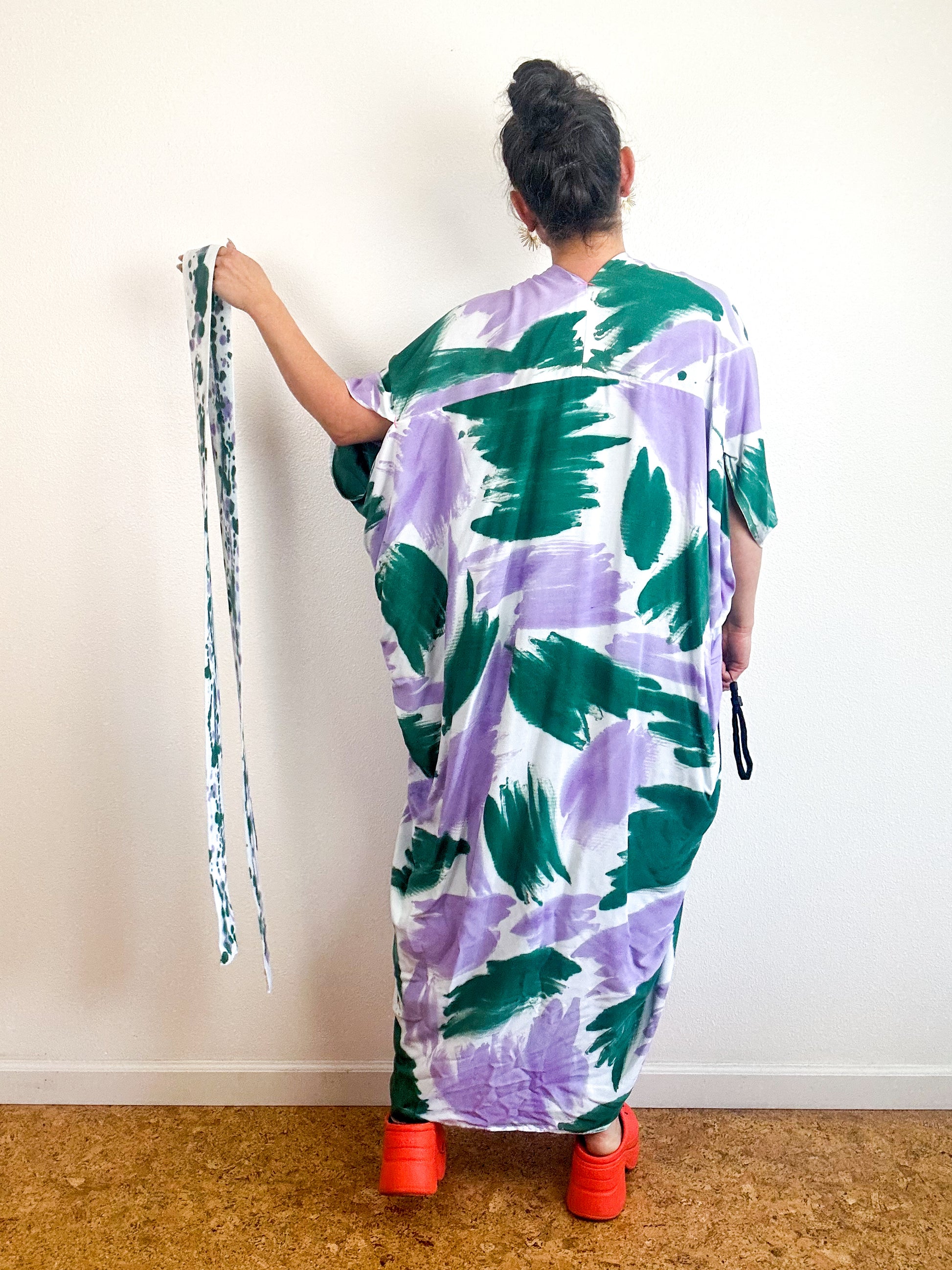 Soft and airy kimono with a flowing silhouette, tulip sleeve detail, curved high low hem and separate waist tie. Versatile shape can be styled as a wrap dress, an open kimono without the tie, or a robe for staying home. The minimalist design created from a full rectangle of fabric drapes beautifully over the shoulders and produces no material waste by utilizing one whole piece of fabric without scraps from corners and irregular cuts. Lightweight woven bamboo fabric is hand-dyed with teal and lavender algae thickened dye using a gestural brushstroke technique.