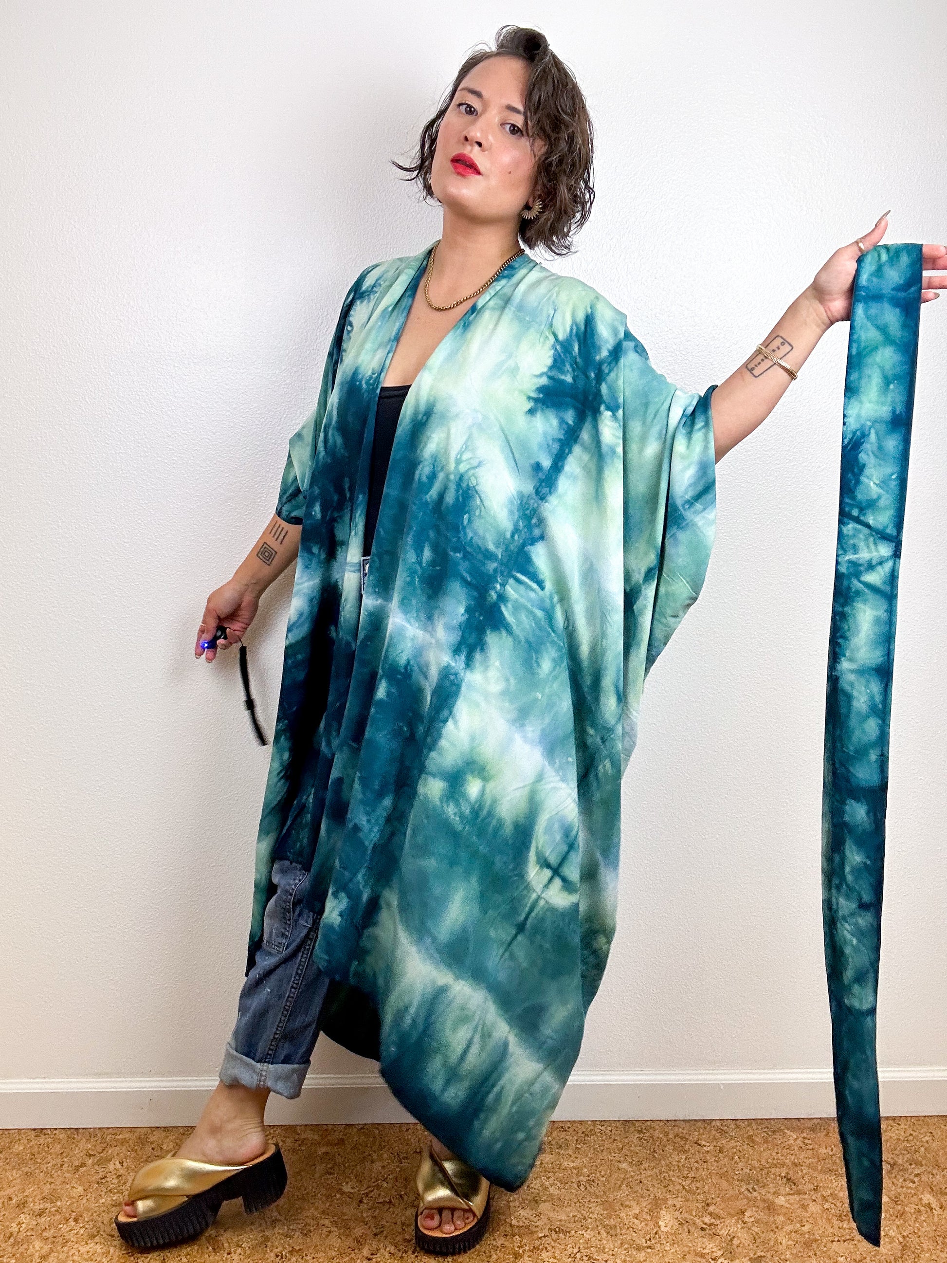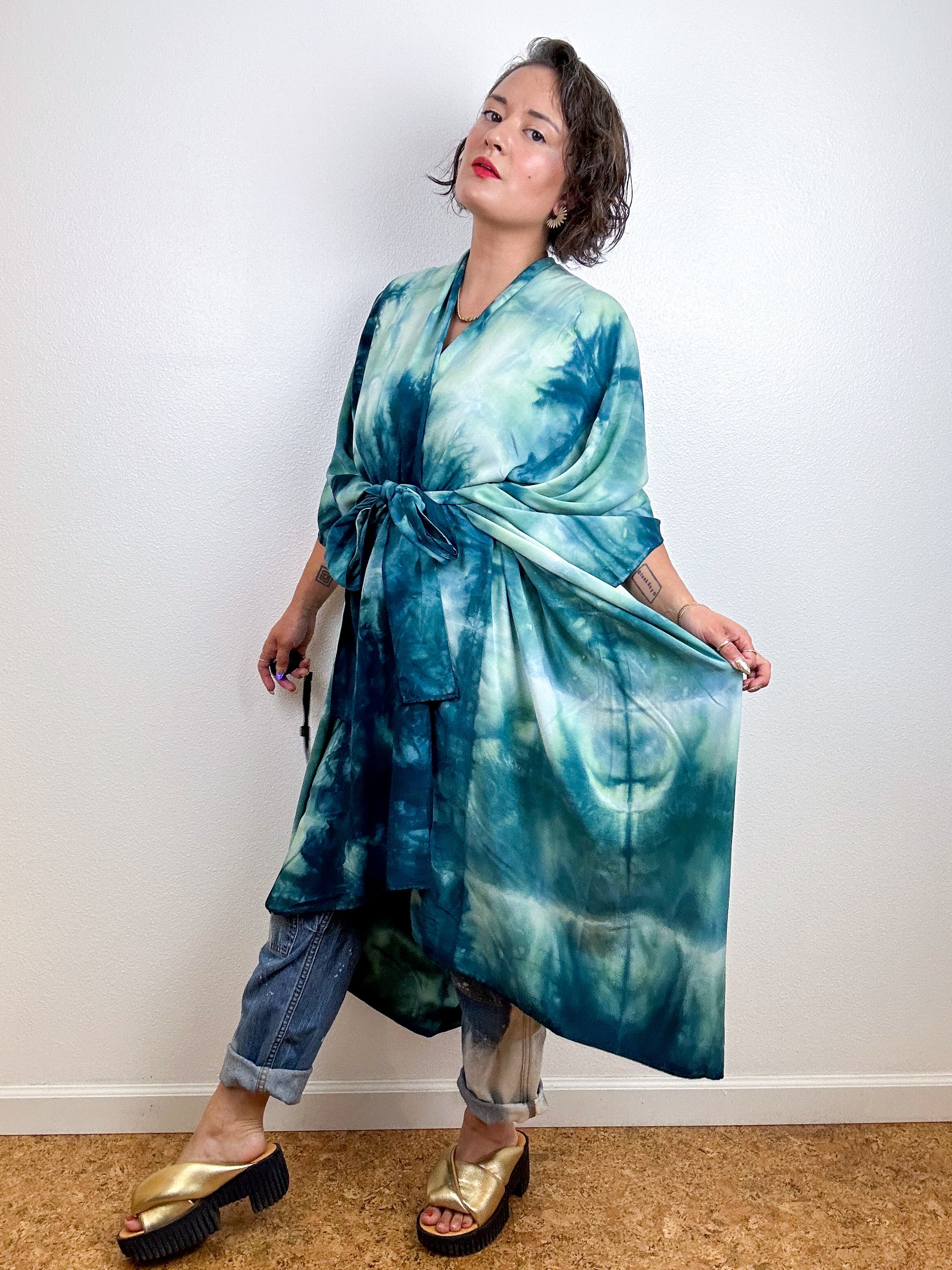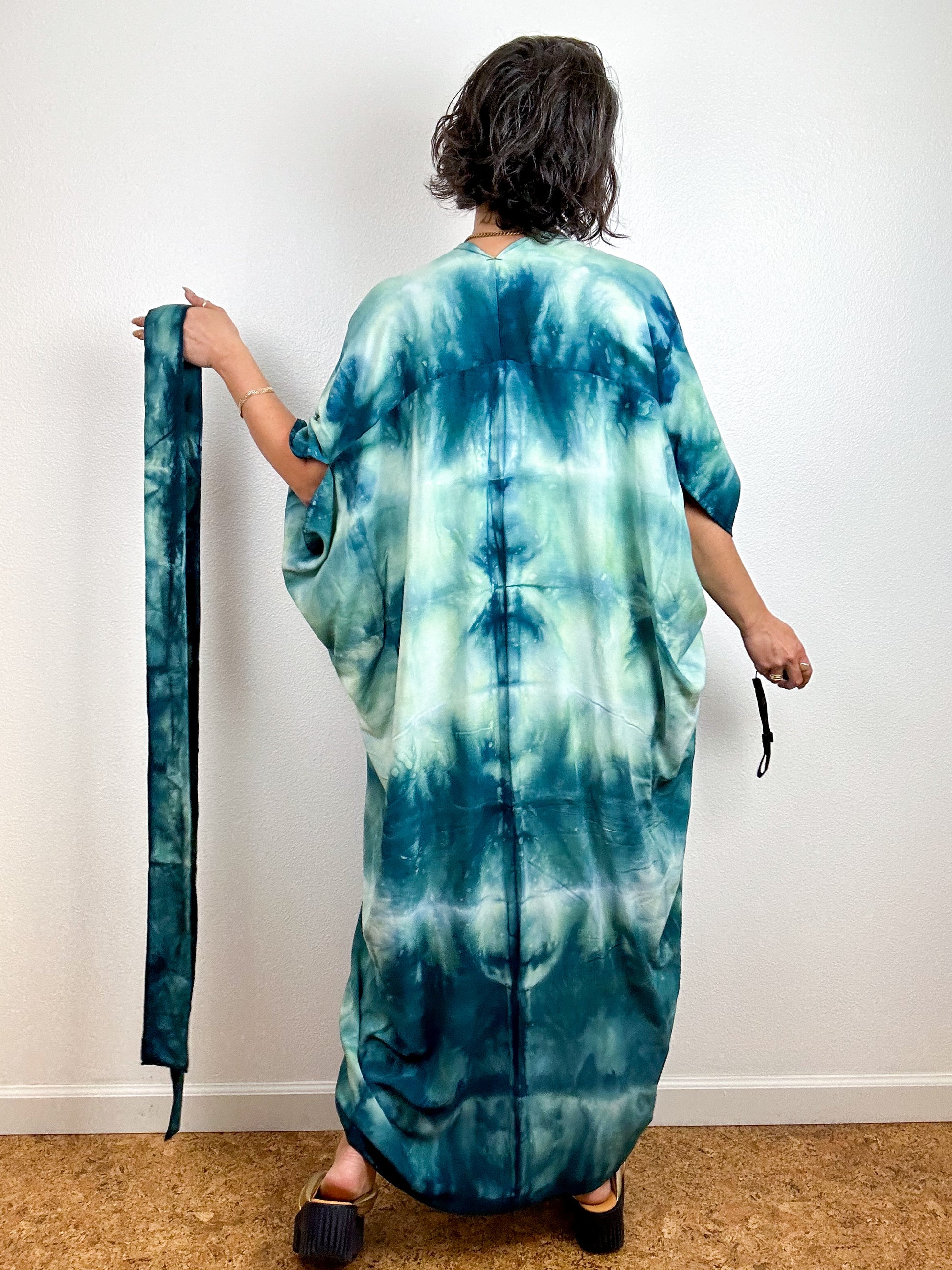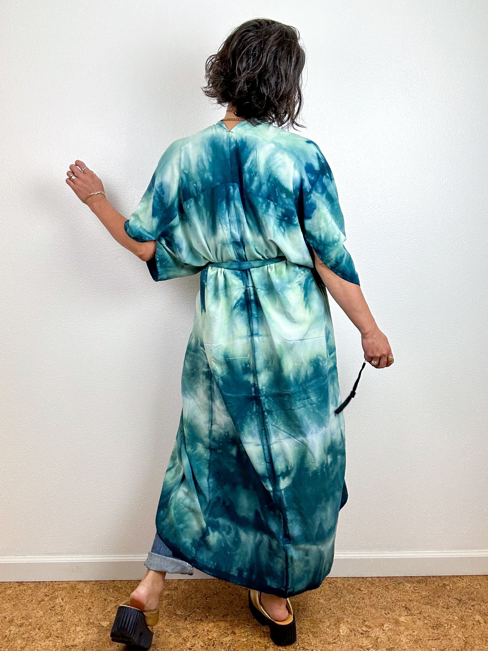 Hand-Dyed High Low Kimono Soft Teal Lines