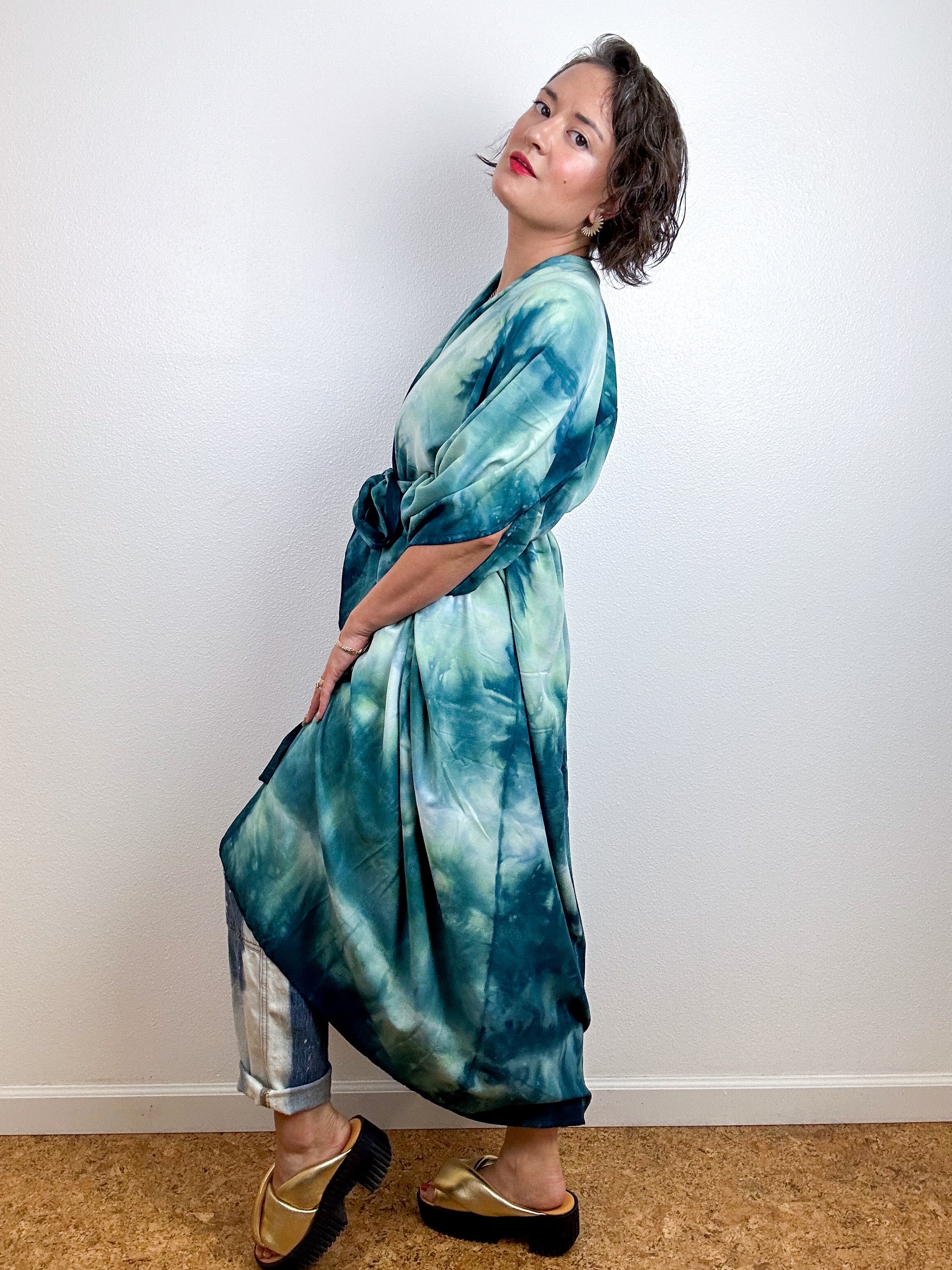 Soft and airy kimono with a flowing silhouette, tulip sleeve detail, curved high low hem and optional waist tie. Versatile shape can be styled as a wrap dress, lightweight jacket over jeans, or an elegant robe over lingerie. The minimalist design created from a full rectangle of fabric drapes beautifully over the shoulders and produces no material waste by utilizing one whole piece of fabric without scraps from corners and irregular cuts. Lightweight woven fabric is hand-dyed with a low water immersion technique in a soft teal hue.