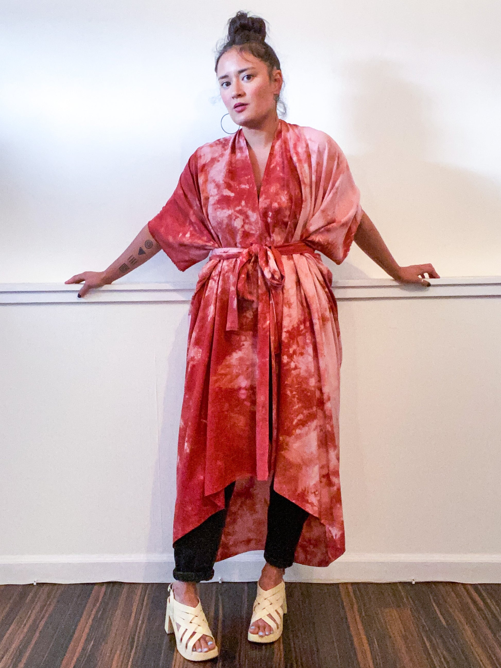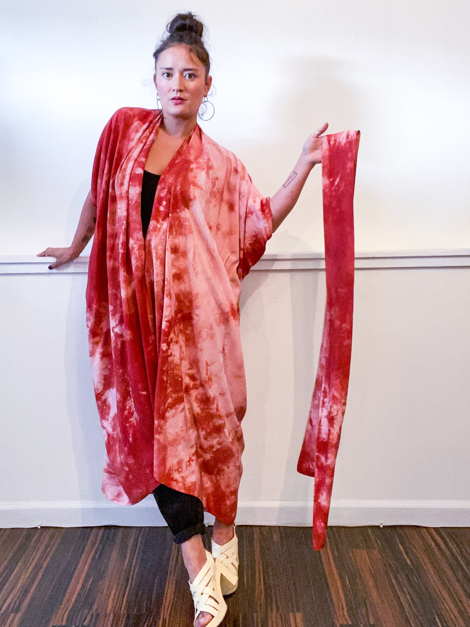Soft and airy kimono with a flowing silhouette, fringed selvage sleeve detail, curved high low hem and optional waist tie. Versatile shape can be styled as a wrap dress, lightweight jacket over jeans, or an elegant robe over lingerie. The minimalist design created from a full rectangle of fabric drapes beautifully over the shoulders and produces no material waste by utilizing one whole piece of fabric without scraps from corners and irregular cuts. Lightweight woven fabric is hand-dyed in a blue black color with a low water tie technique.