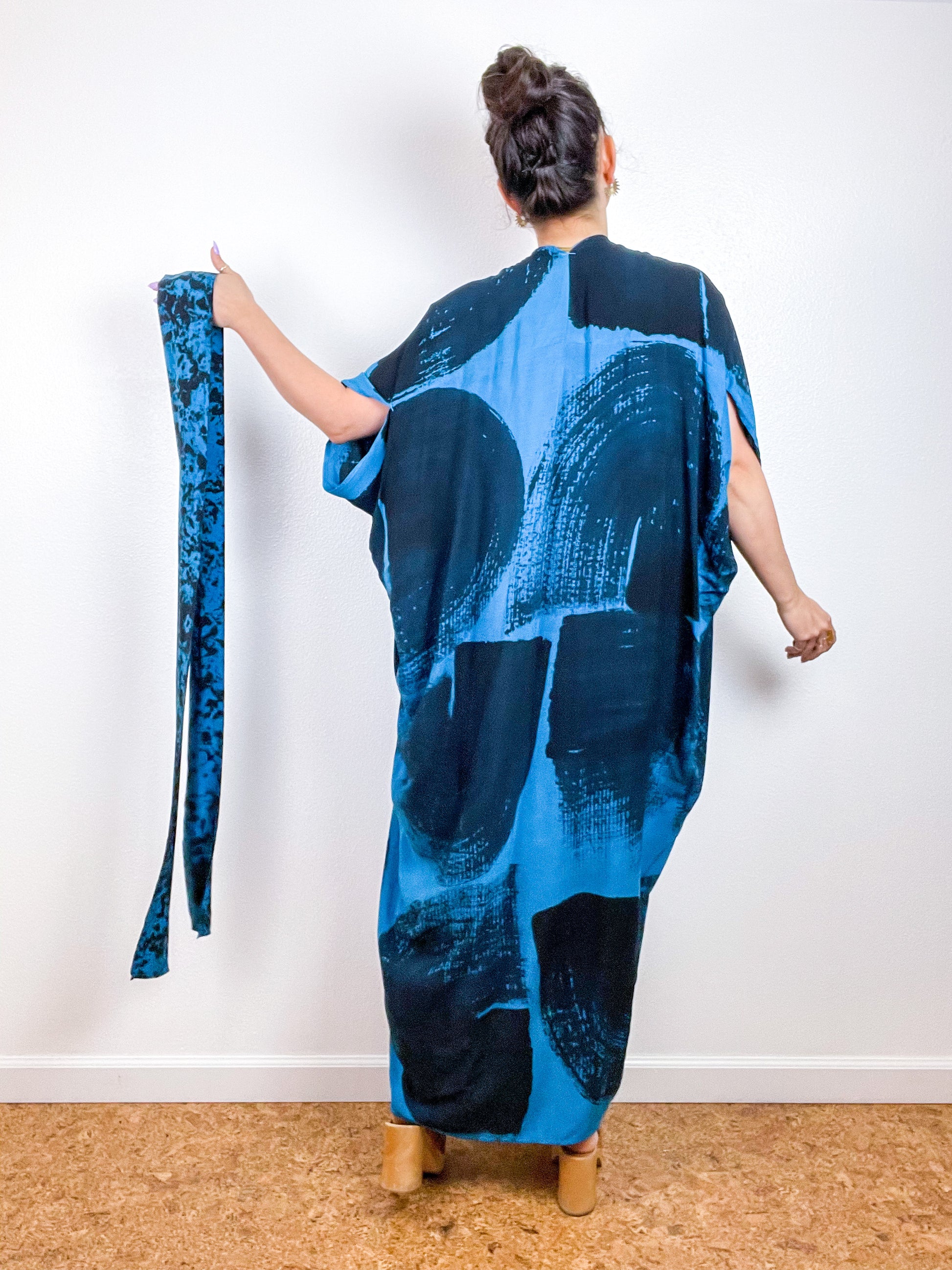 Soft and airy kimono with a flowing silhouette, tulip sleeve detail, curved high low hem and separate waist tie. Versatile shape can be styled as a wrap dress, an open kimono without the tie, or a robe for staying home. The minimalist design created from a full rectangle of fabric drapes beautifully over the shoulders and produces no material waste by utilizing one whole piece of fabric without scraps from corners and irregular cuts. Lightweight woven turquoise blue fabric is hand-dyed with indigo algae thickened dye using a gestural brushstroke technique.