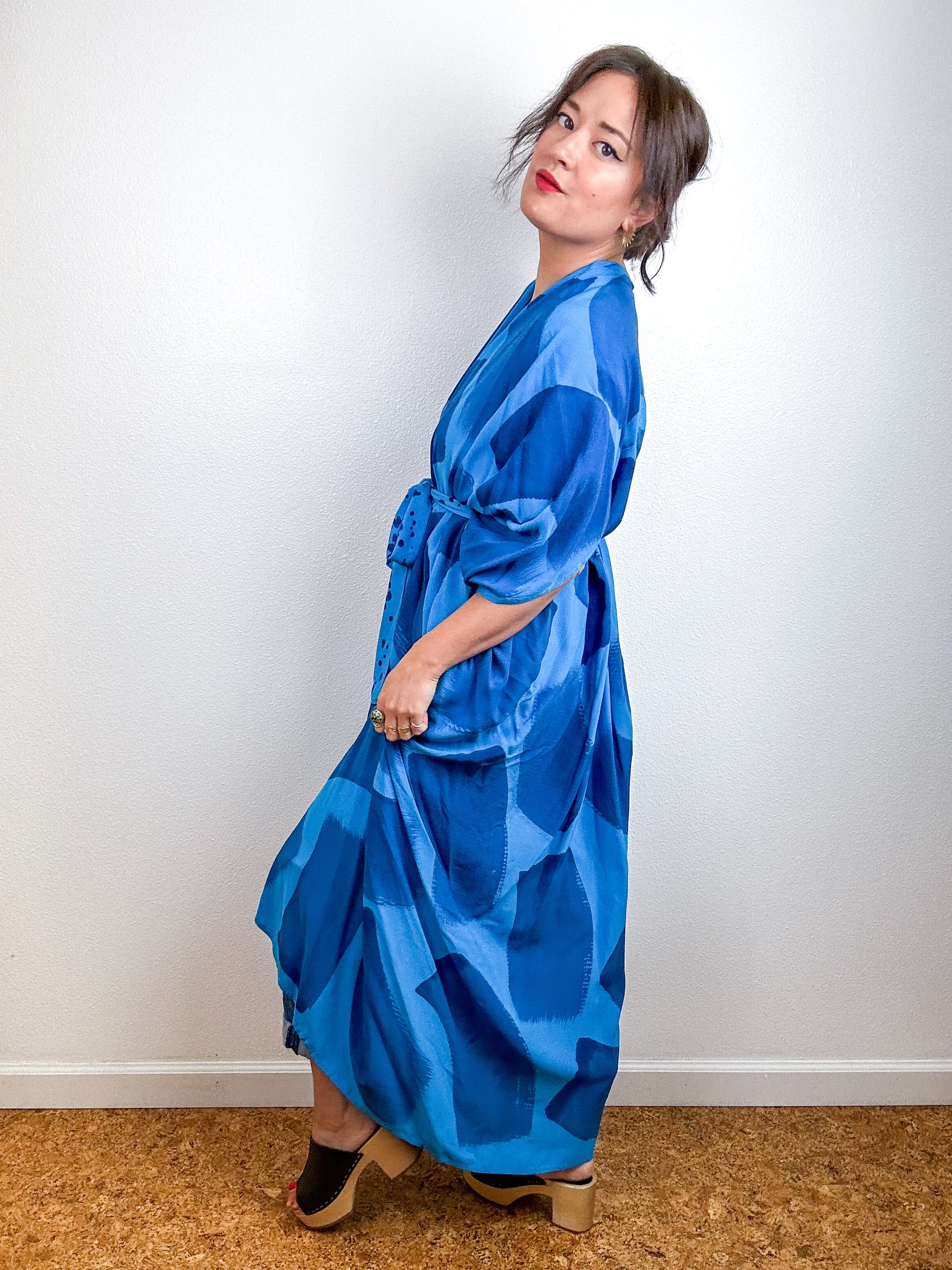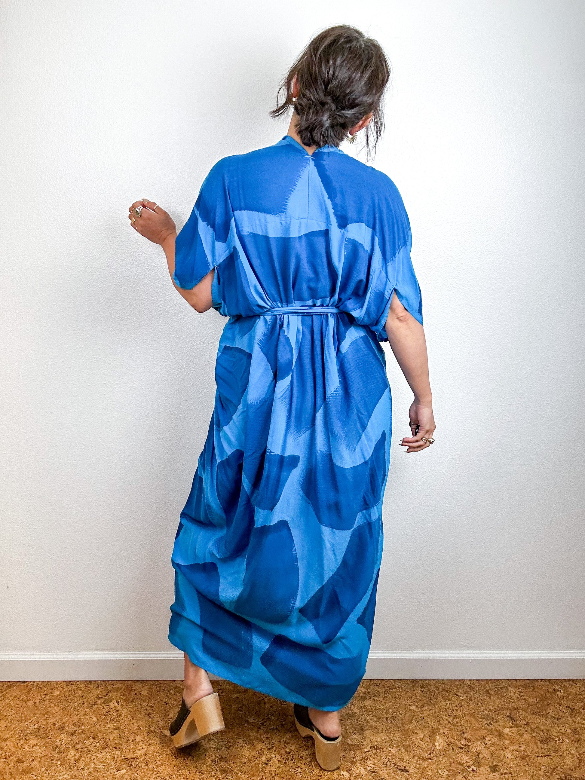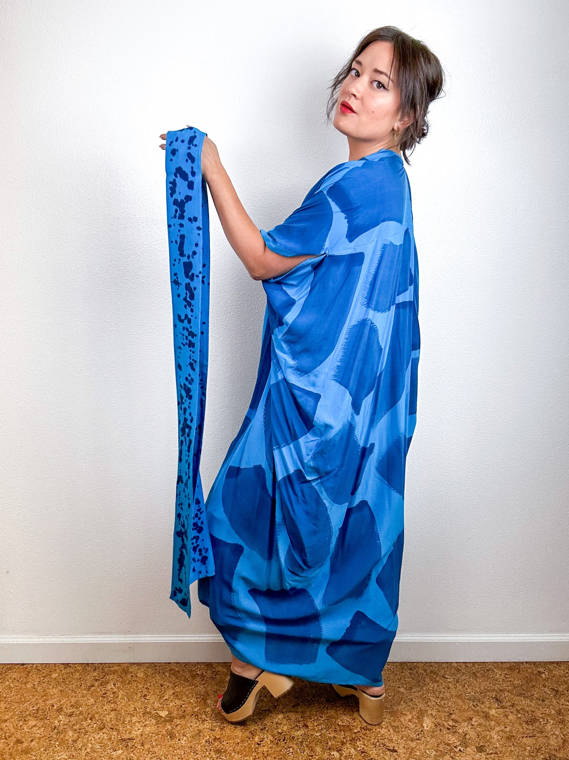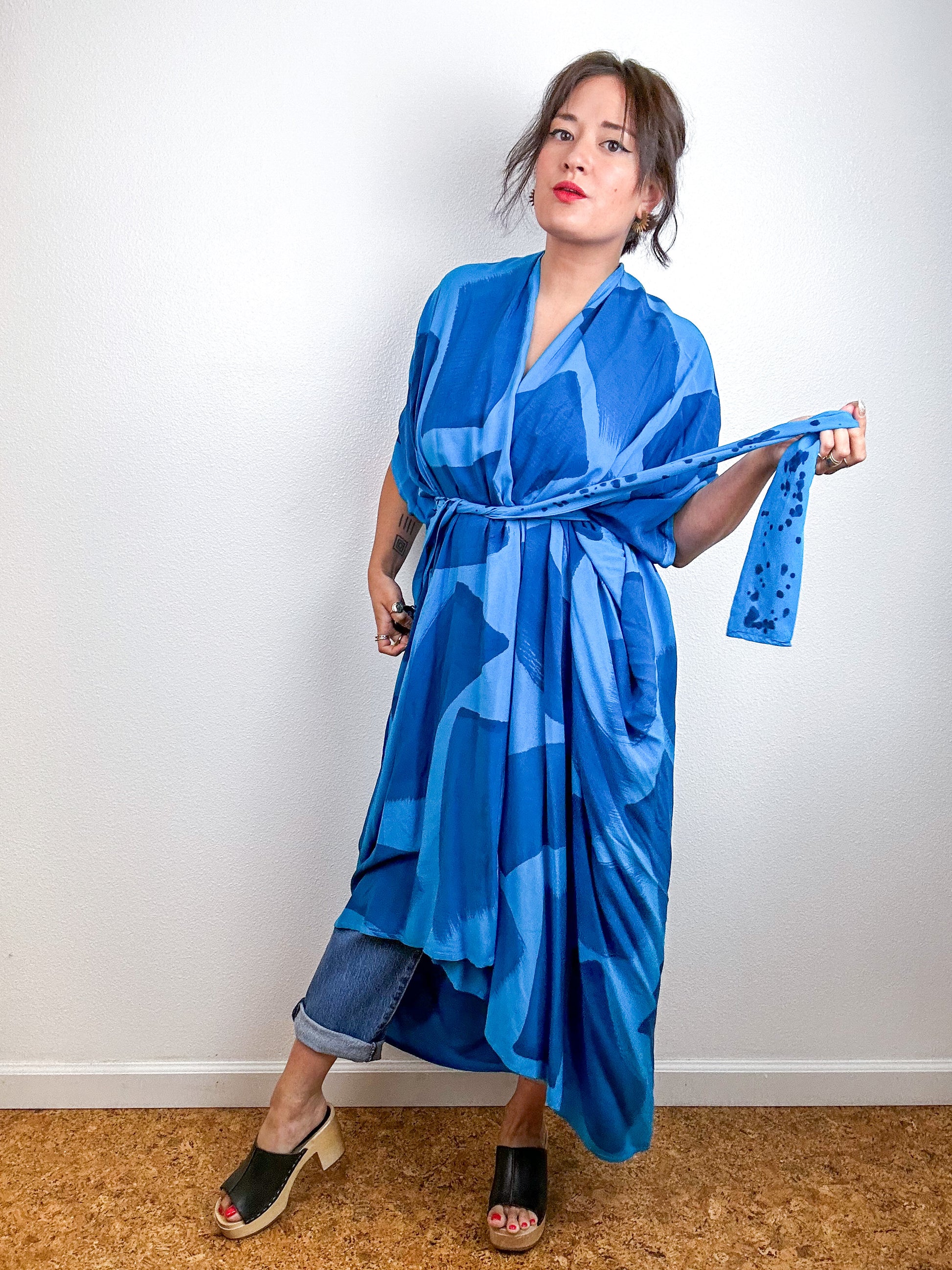 Soft and airy kimono with a flowing silhouette, tulip sleeve detail, curved high low hem and separate waist tie. Versatile shape can be styled as a wrap dress, an open kimono without the tie, or a robe for staying home. The minimalist design created from a full rectangle of fabric drapes beautifully over the shoulders and produces no material waste by utilizing one whole piece of fabric without scraps from corners and irregular cuts. Lightweight woven turquoise fabric is hand-dyed with royal blue algae thickened dye using a gestural brushstroke technique.