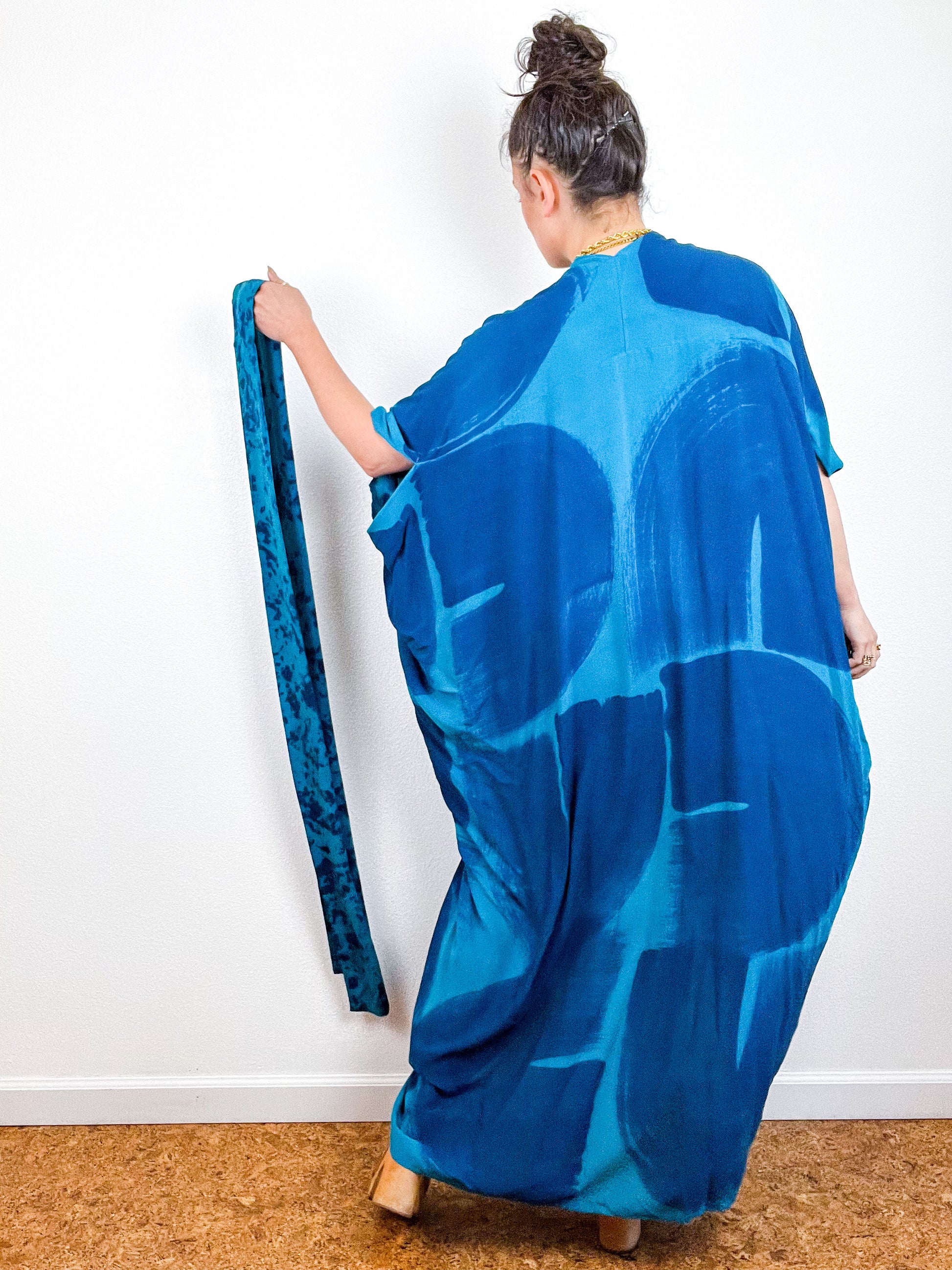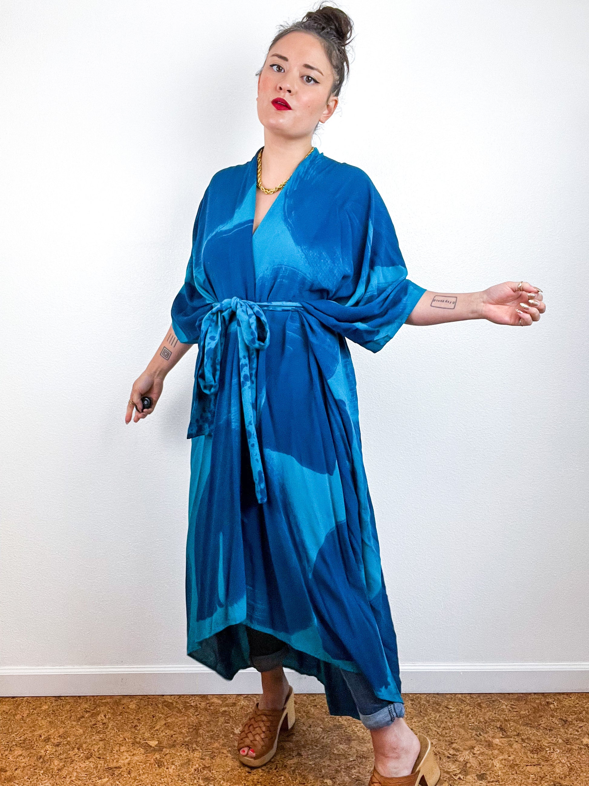 Soft and airy kimono with a flowing silhouette, tulip sleeve detail, curved high low hem and separate waist tie. Versatile shape can be styled as a wrap dress, an open kimono without the tie, or a robe for staying home. The minimalist design created from a full rectangle of fabric drapes beautifully over the shoulders and produces no material waste by utilizing one whole piece of fabric without scraps from corners and irregular cuts. Lightweight woven turquoise fabric is hand-dyed with blue algae thickened dye using a gestural brushstroke technique.