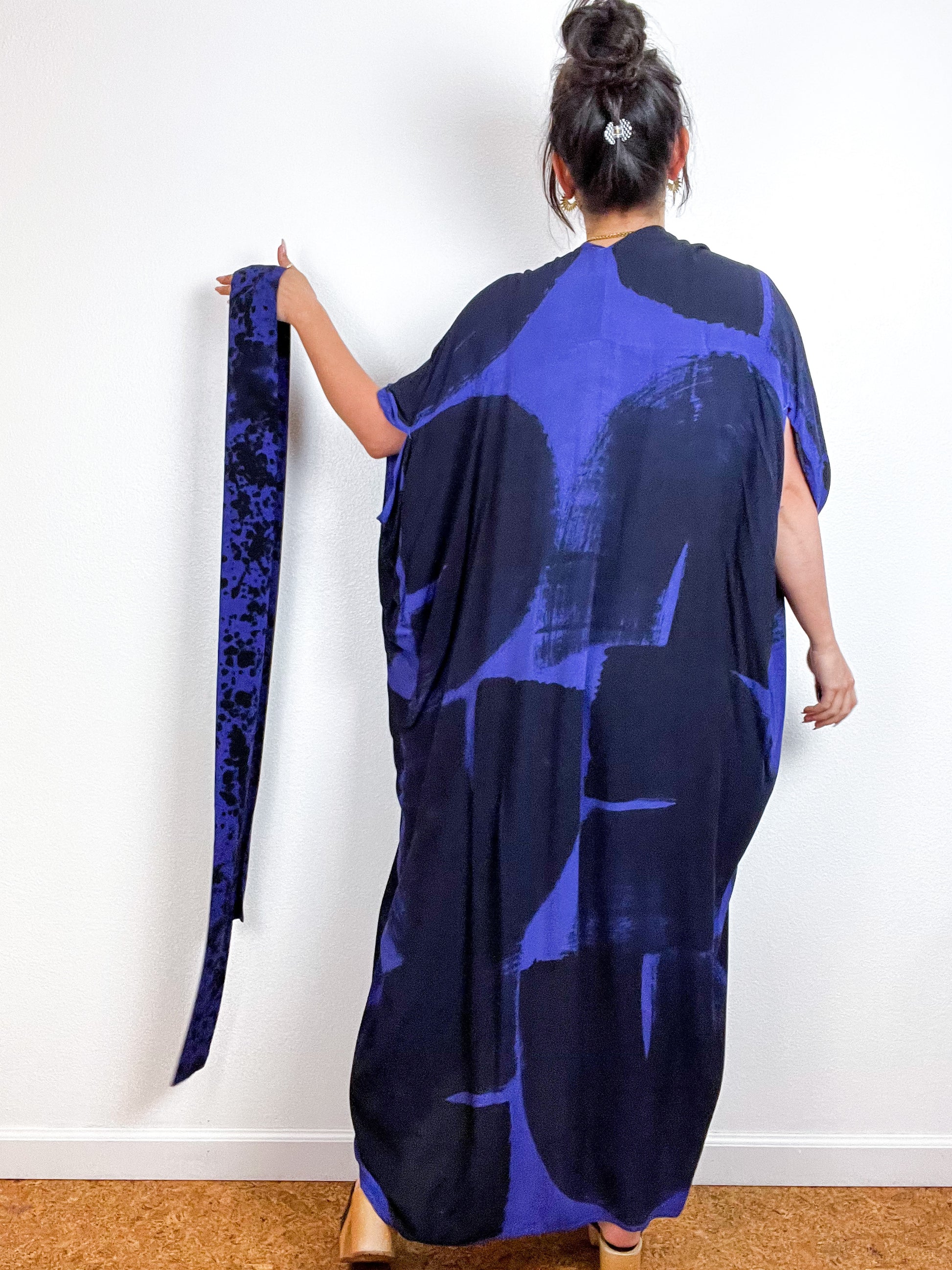 Soft and airy kimono with a flowing silhouette, tulip sleeve detail, curved high low hem and separate waist tie. Versatile shape can be styled as a wrap dress, an open kimono without the tie, or a robe for staying home. The minimalist design created from a full rectangle of fabric drapes beautifully over the shoulders and produces no material waste by utilizing one whole piece of fabric without scraps from corners and irregular cuts. Lightweight woven violet blue fabric is hand-dyed with black algae thickened dye using a gestural brushstroke technique.