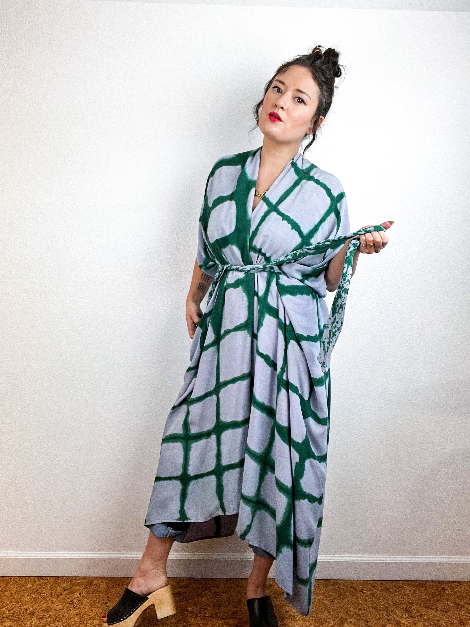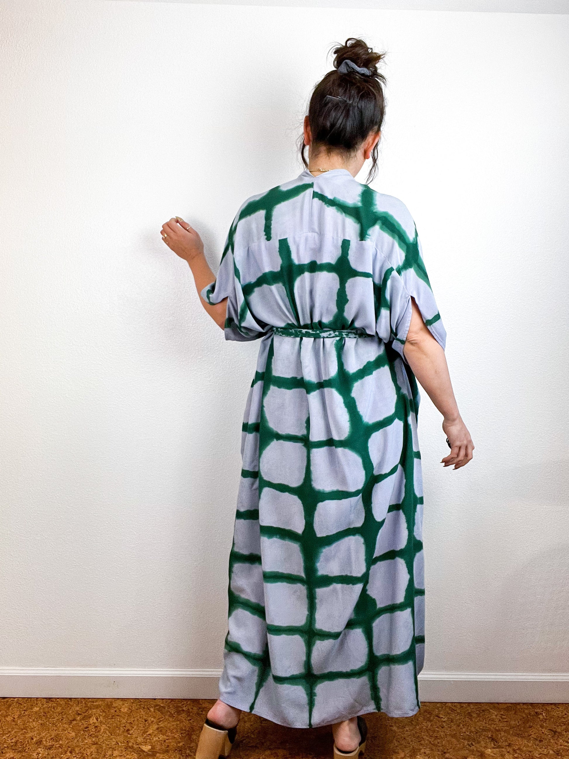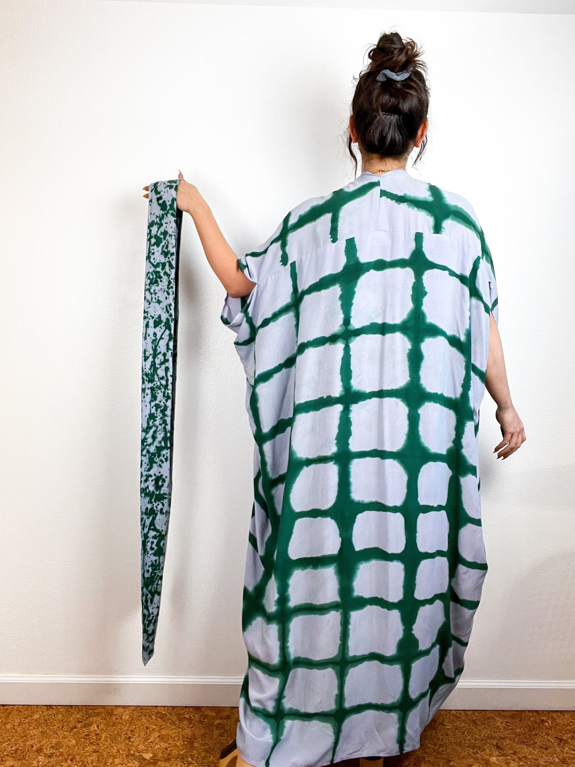 Soft and airy kimono with a flowing silhouette, tulip sleeve detail, curved high low hem and separate waist tie. Versatile shape can be styled as a wrap dress, an open kimono without the tie, or a robe for staying home. The minimalist design created from a full rectangle of fabric drapes beautifully over the shoulders and produces no material waste by utilizing one whole piece of fabric without scraps from corners and irregular cuts. Lightweight woven wisteria fabric is hand-dyed with forest green algae thickened dye using an imperfect plaid technique.