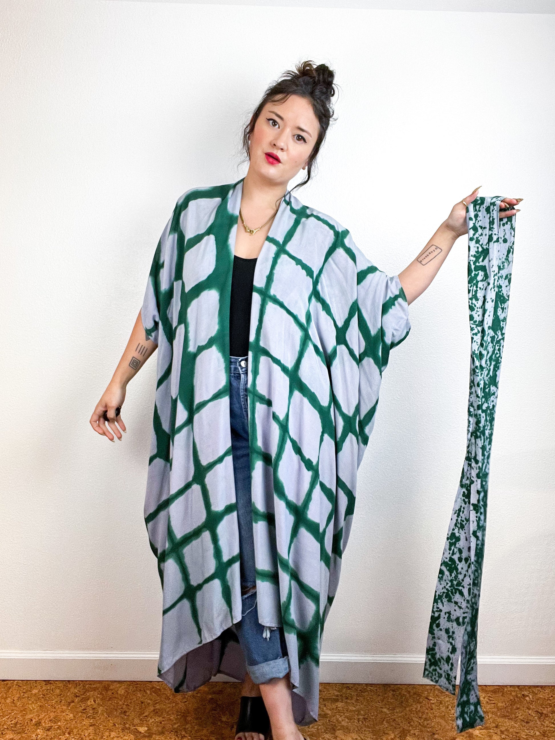 Hand-Dyed High Low Kimono Wisteria Forest Windowpane