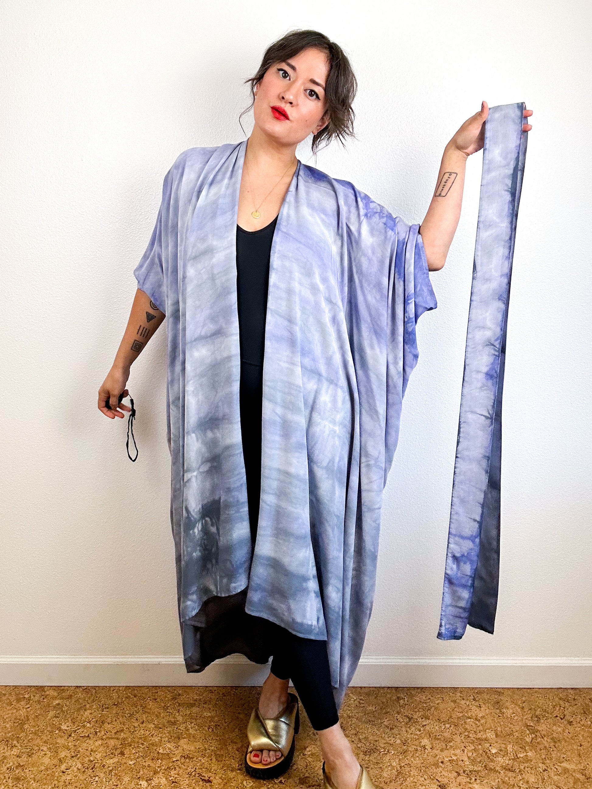 Soft and airy kimono with a flowing silhouette, tulip sleeve detail, curved high low hem and separate waist tie. Versatile shape can be styled as a wrap dress, an open kimono without the tie, or a robe for staying home. The minimalist design created from a full rectangle of fabric drapes beautifully over the shoulders and produces no material waste by utilizing one whole piece of fabric without scraps from corners and irregular cuts. Lightweight woven fabric is hand-dyed using an original low water technique in wisteria and grey.