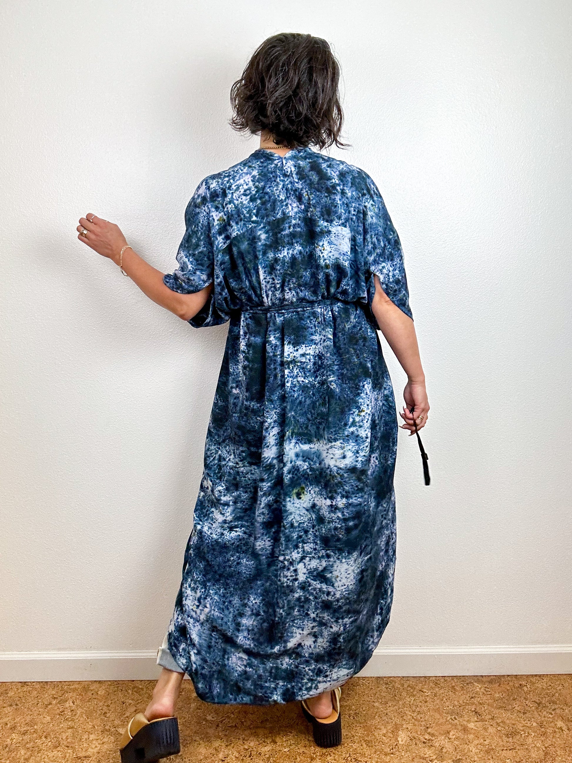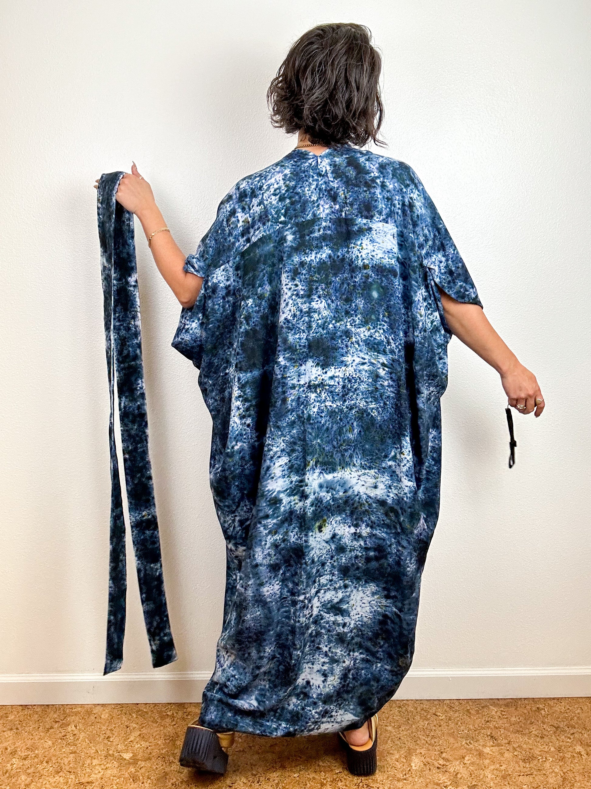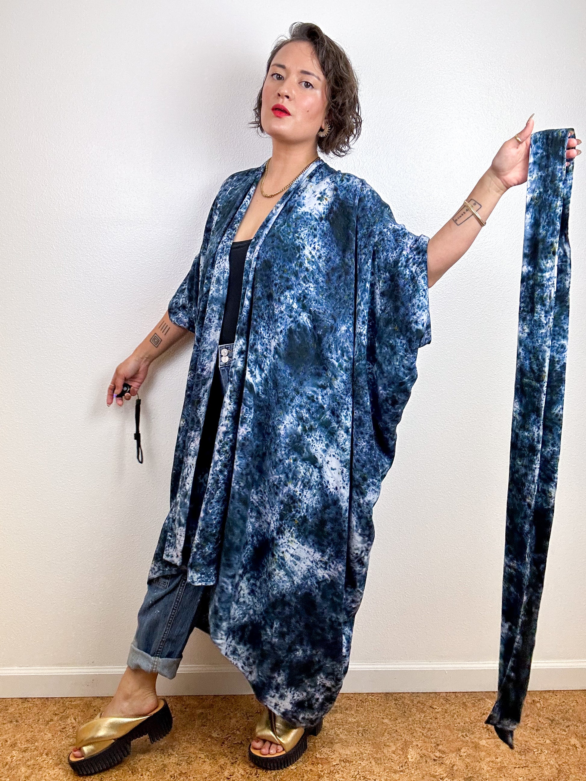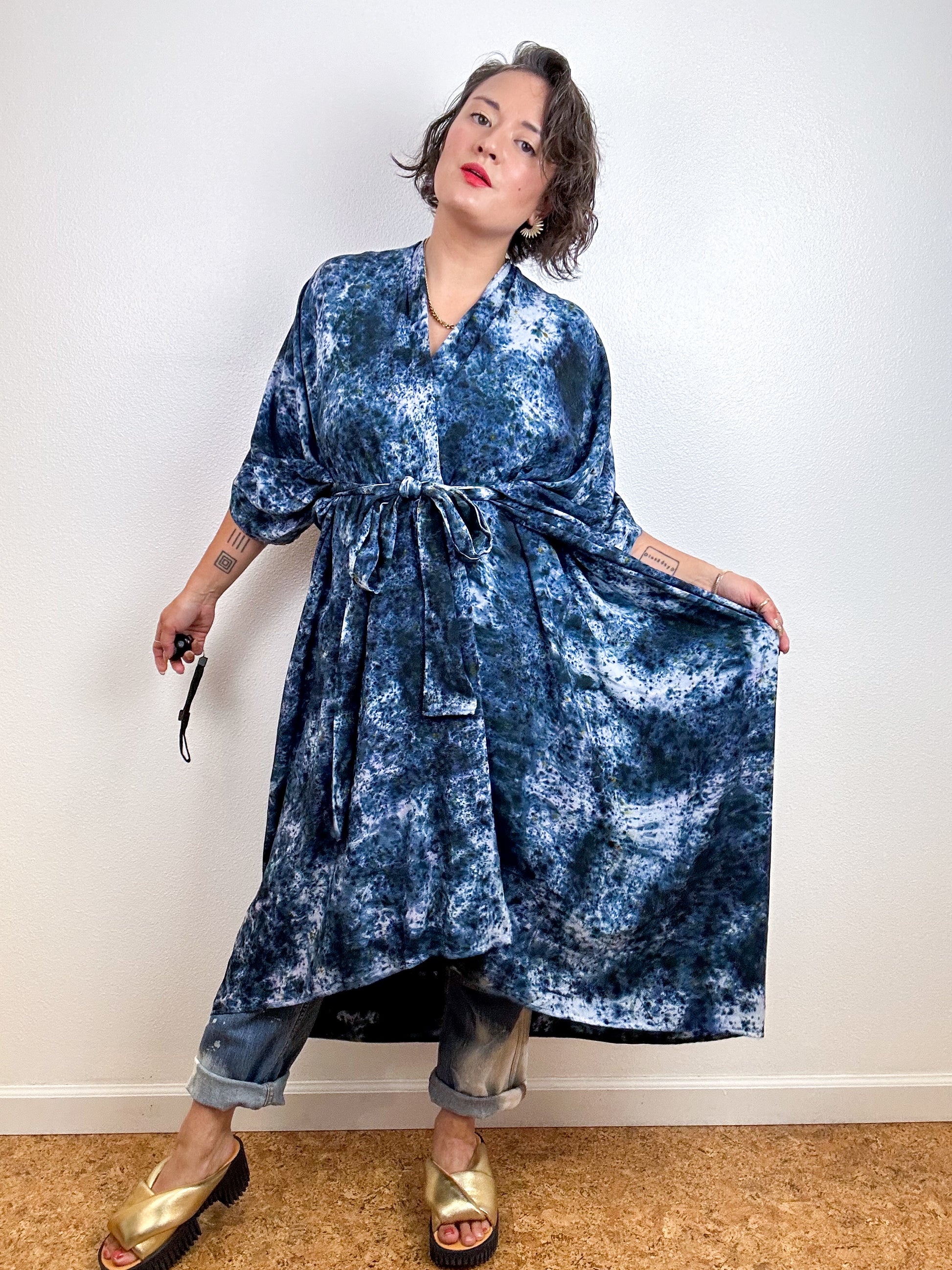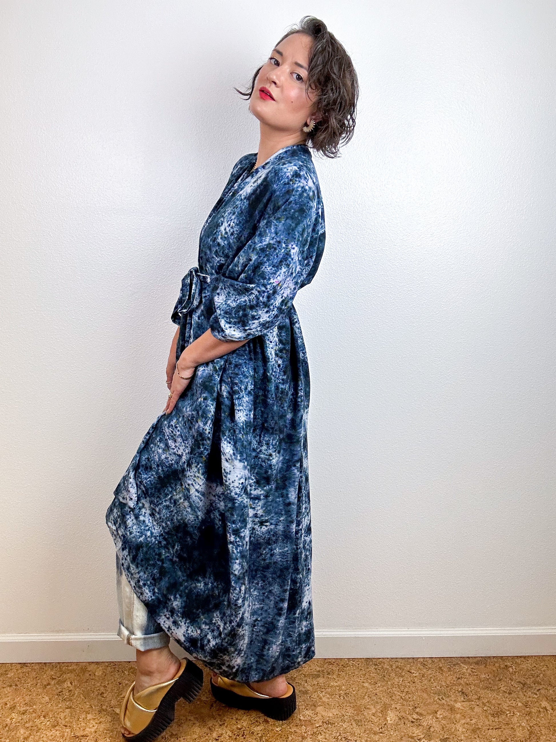 Soft and airy kimono with a flowing silhouette, tulip sleeve detail, curved high low hem and optional waist tie. Versatile shape can be styled as a wrap dress, lightweight jacket over jeans, or an elegant robe over lingerie. The minimalist design created from a full rectangle of fabric drapes beautifully over the shoulders and produces no material waste by utilizing one whole piece of fabric without scraps from corners and irregular cuts. Lightweight woven fabric is hand-dyed in a multicolor speckle print using an original technique, capturing each pigment that combines to create the color black the moment it touches the fabric.
