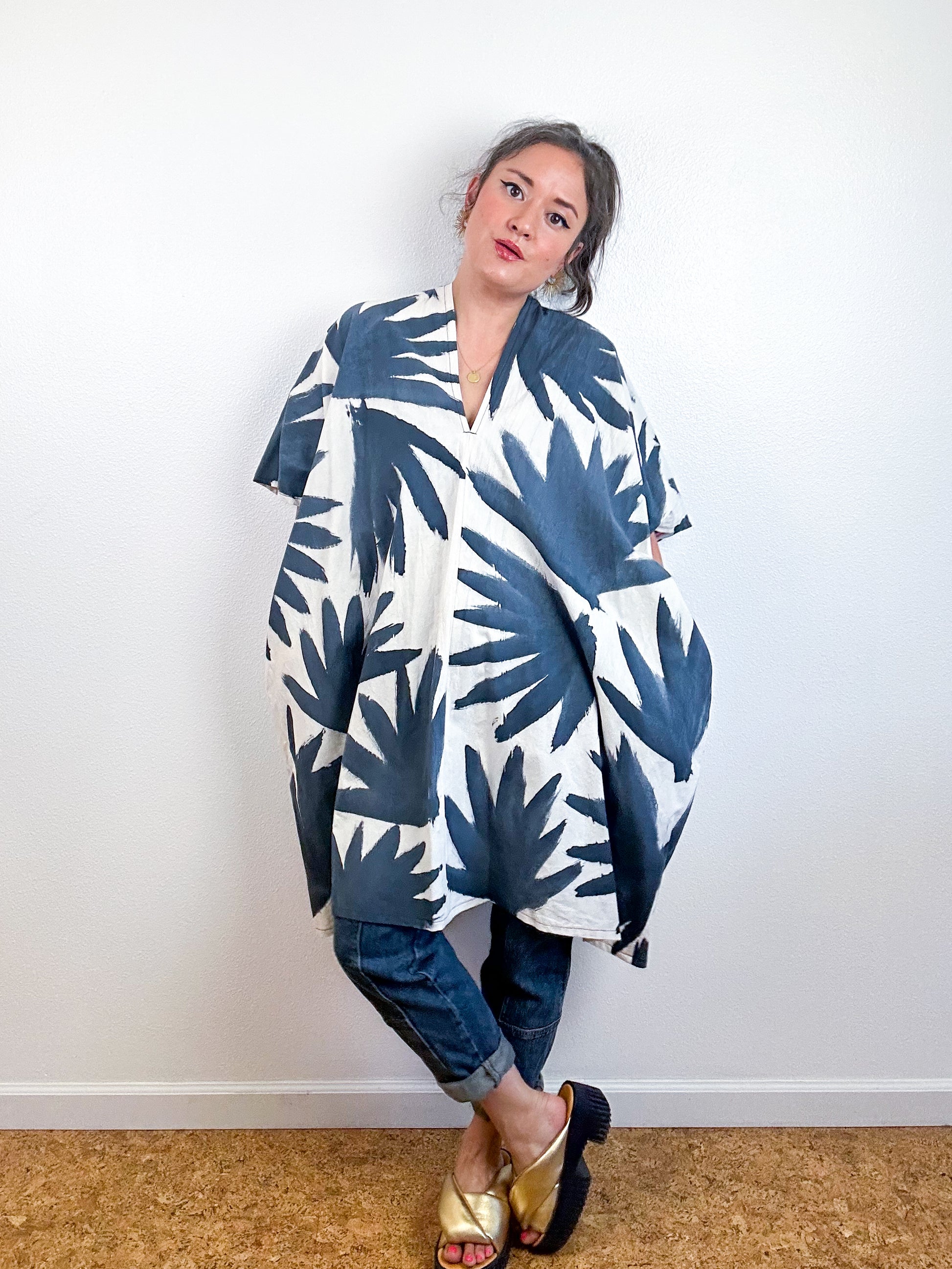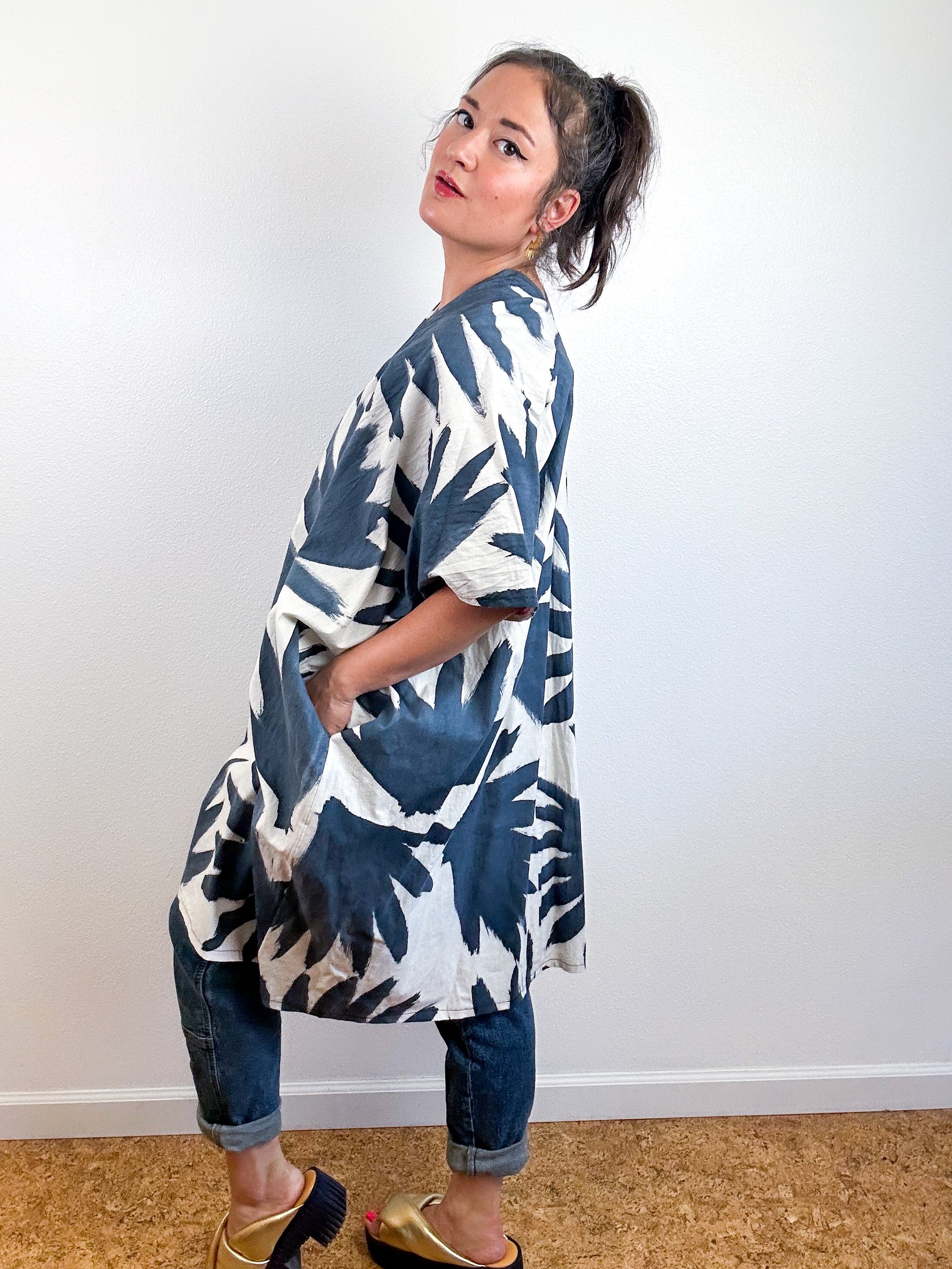 Hand-dyed smock dress with an oversized silhouette, knee length, side seam pockets. Minimalist design created from full rectangles of fabric produces zero material waste. Light and crisp 100% cotton ivory fabric hand-dyed with a black painterly pattern