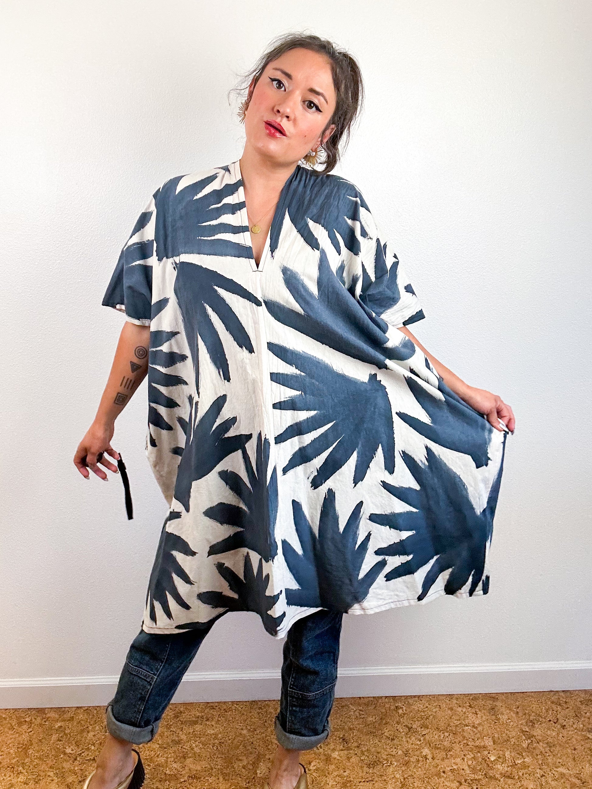 Hand-Dyed Knee Caftan Dress Ivory Black Palms