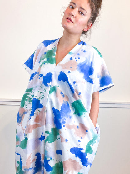 Soft and cozy sweatshirt knit smock dress available in 3 sizes. Oversized silhouette, marigold side seam pockets, knee length on most. Versatile shape can be styled as a dress or tunic over jeans or leggings. The minimalist design created from two full rectangles of fabric produces little to no material waste. 100% cotton sweatshirt knit with a smooth face and fleece interior. Hand-dyed with algae thickened dye in 4 pastel shades.